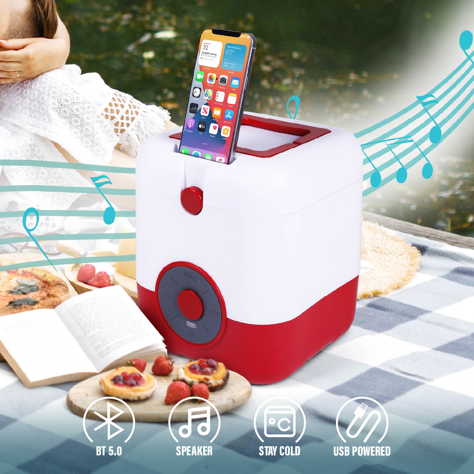 BT04-065The foods and drinks will stay cold and you jam out to tunes with the built in speaker.
