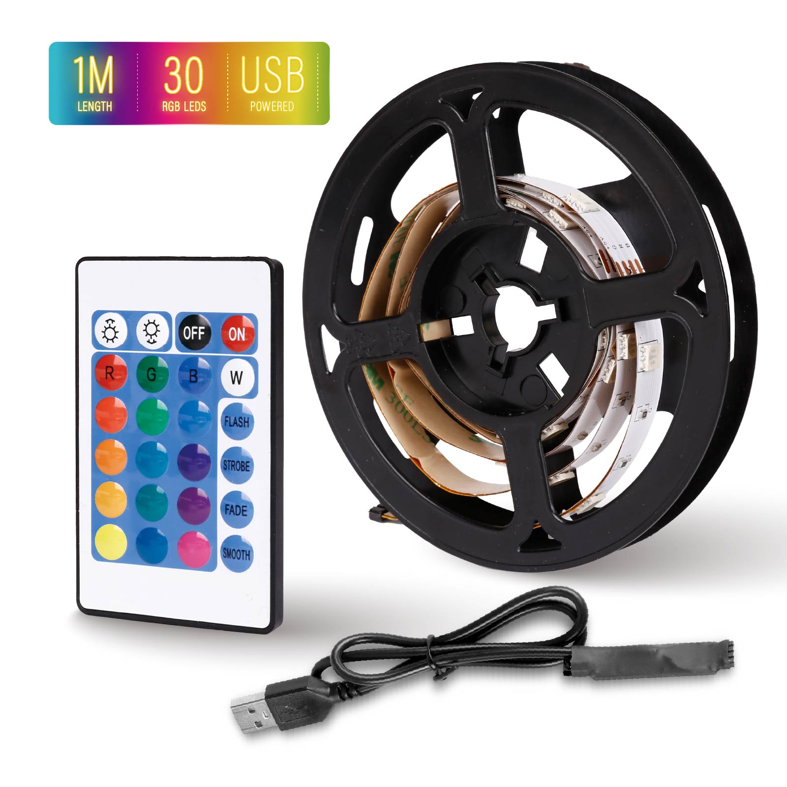 USB Powered RGB LED Strip Lights with Remote Control (1 M) (30 LEDS / M)