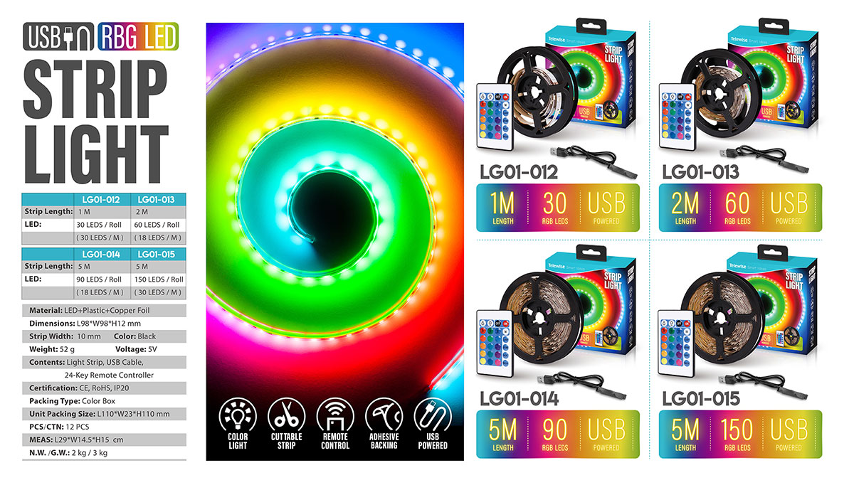 LG01-012USB powered supply and included remote allows for easy adjustments to dimming, color, and other lighting effects such as flash, jump, and fade. With the RGB feature, 20 color options are available at the click of a button. With a flexible and cuttable design, these Strip Lights are ideal for your TV (backlight), Cabinet, Closet, Bedroom, Kitchen, and many more applications for DIY lighting in your home. Perfect for narrow spaces and these lights are flexible so you can bend them to your desired angle. Cut along the die lines to get the perfect strip light length for your application.