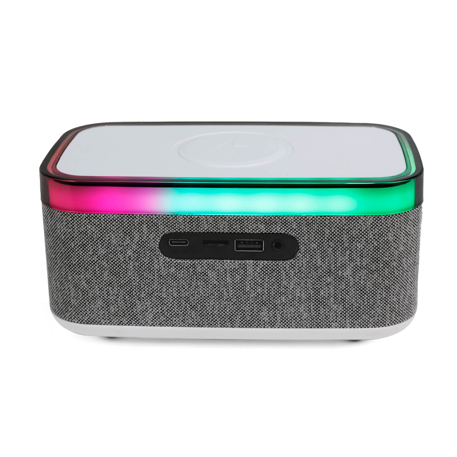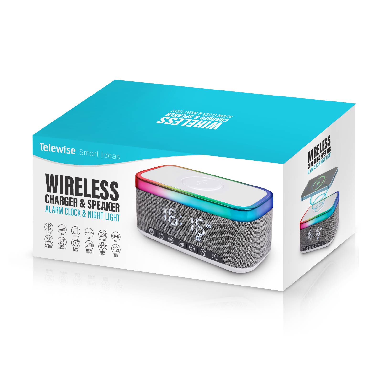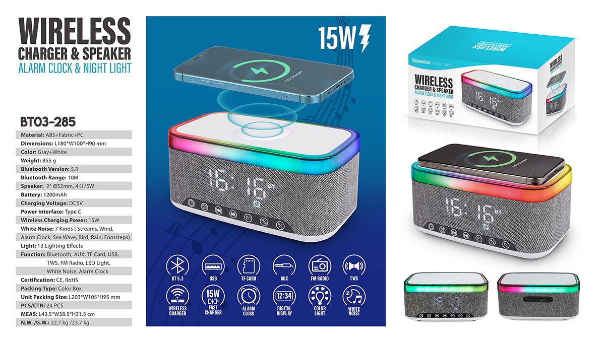 BT03-285Wireless Charger, Wireless Speaker, Alarm Clock and Color Changing Night Light, are integrated into one design.