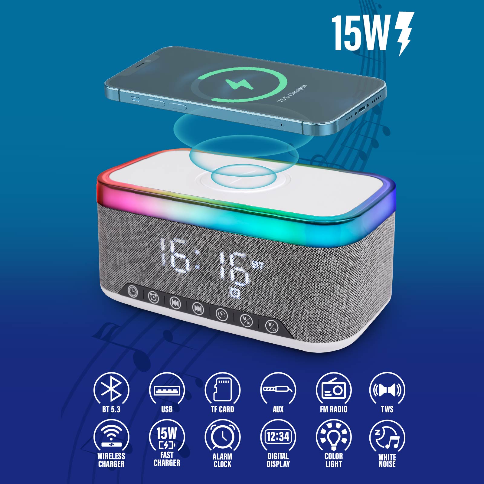 15W Wireless Charger & Led Speaker with Alarm Clock
