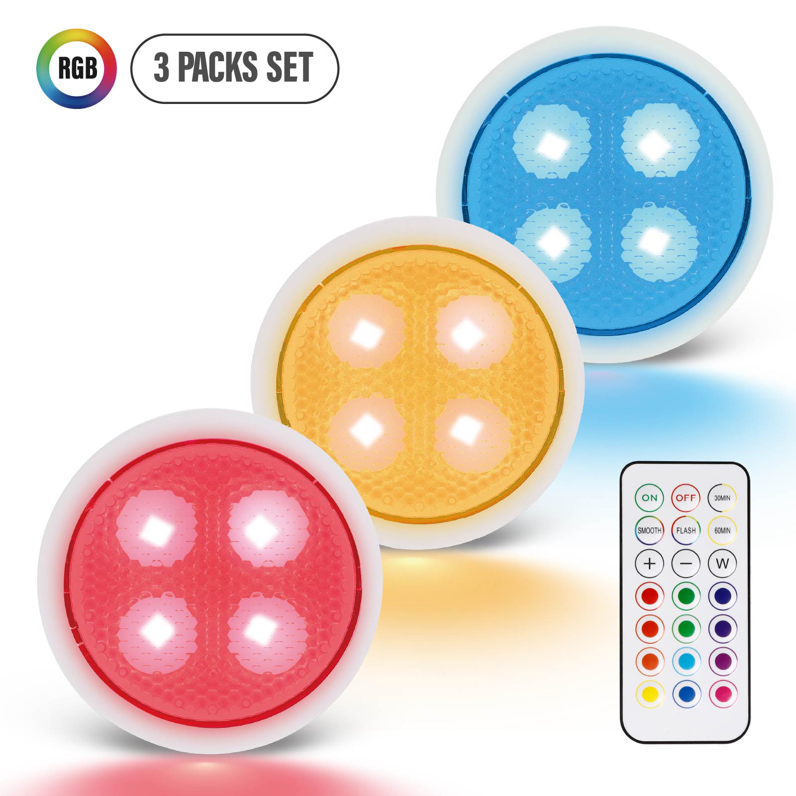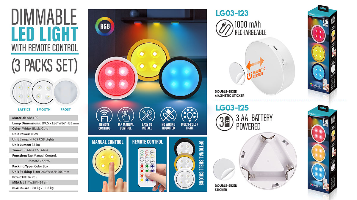 LG03-123The lights support both remote and tap control with high sensitivity and long distance, you can easily change colors to decorate your occasion and scene, Stick on and Power on, No drilling! No electric wire! Stick the adhesive sheets on any smooth interface in your kitchen,inside the cabinets,or under the counter.