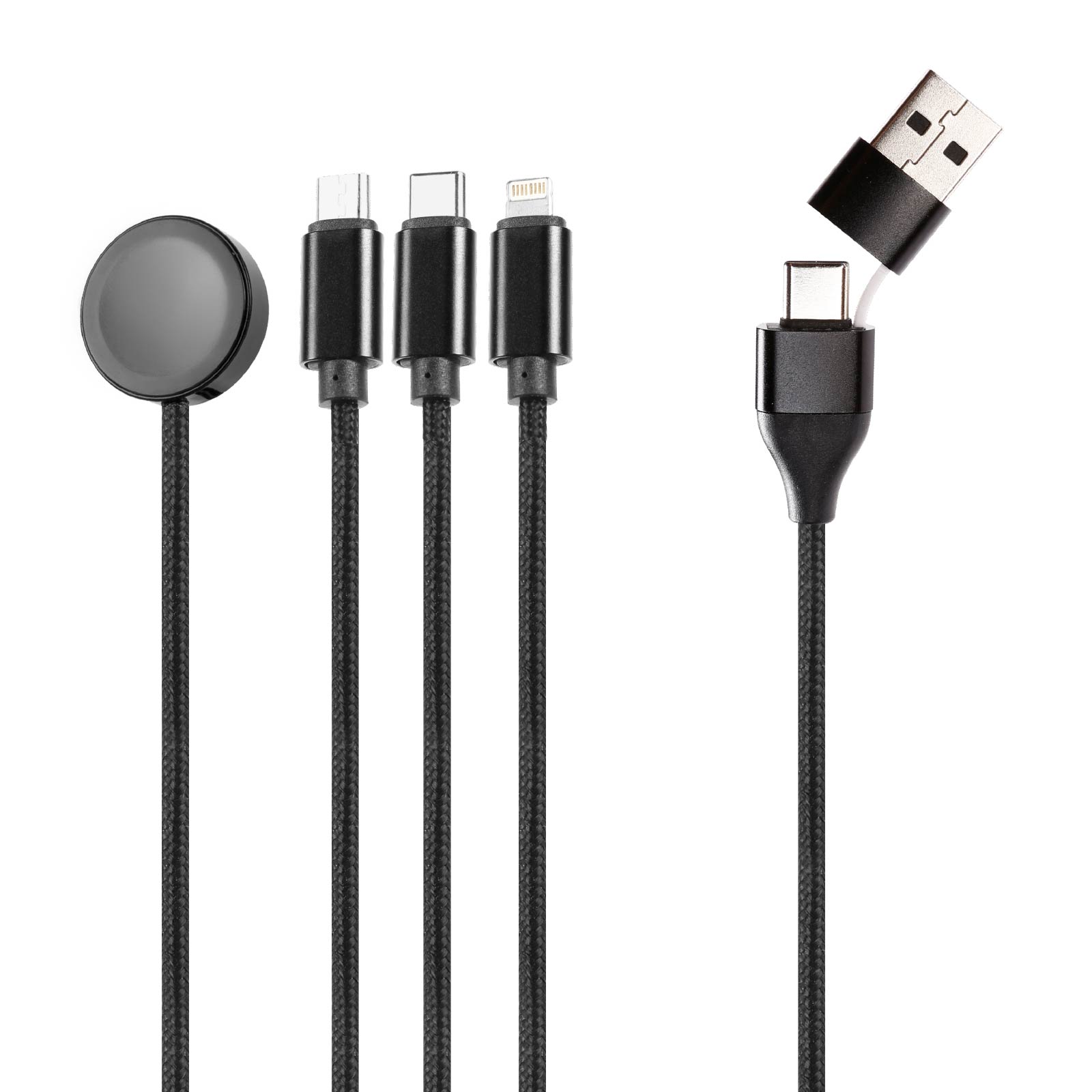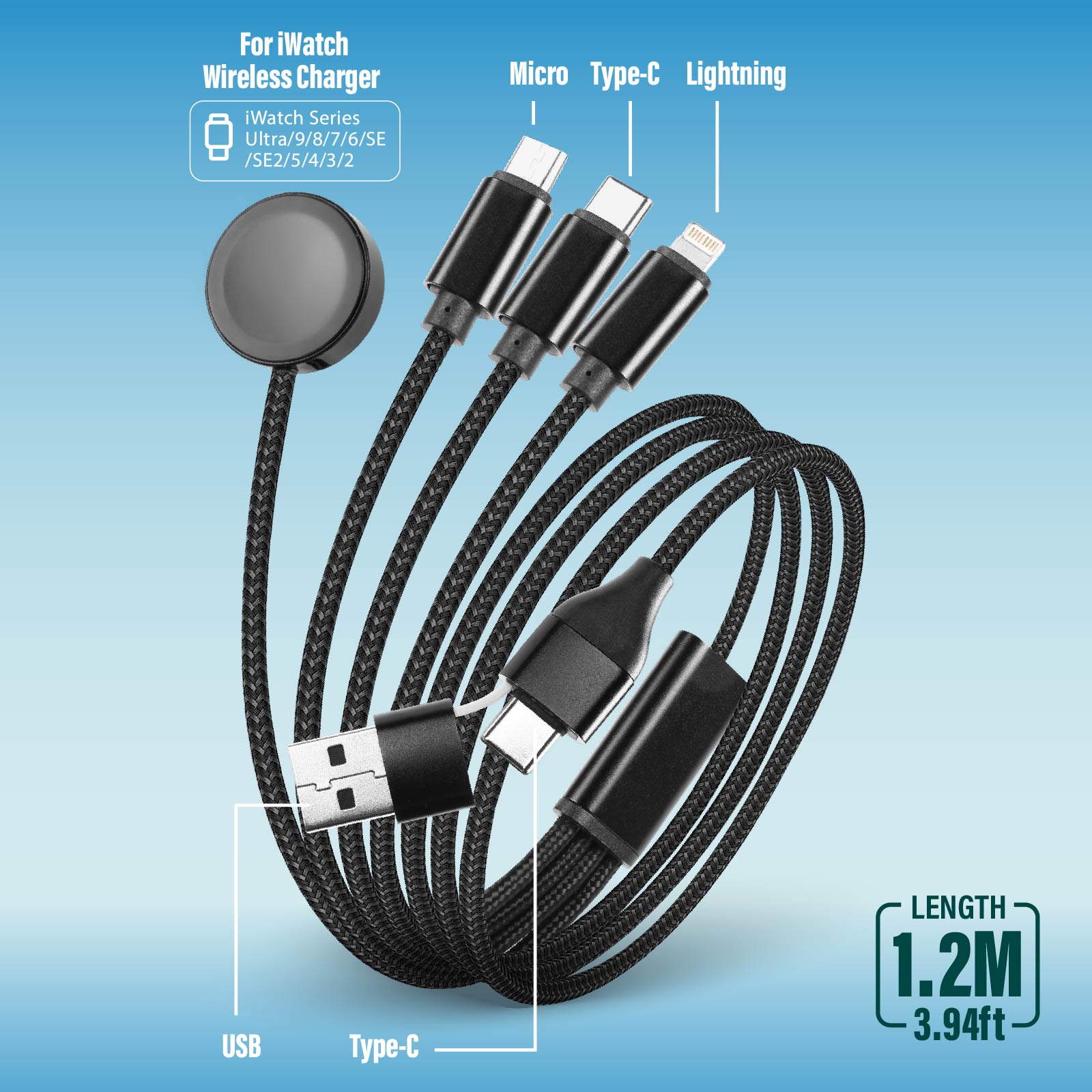 UC07-01166W Full Charging, Saving More TimeWide Compatibility :Magnetic apple watch fast charging port compatible with all Apple Watch Series Ultra/9/8/SE2/7/6/SE/5/4/3/2/1; Lightning port compatible with iPhone 14/13/12/11/11 Pro/11 Pro Max/XS;The Type-C port supports iPad, iPhone15 series, Macbook Pro, Laptops, Galaxy and other Type-C Smartphones. The Micro USB port is compatible with Samsung Galaxy S7/S6/S4 and most Android Phones as well as Kindle, Bluetooth headsets, PS4 controllers and more.A perfect quick Charging Cable for Multiple Devices.Fast heat dissipation, resistant to bending, not tangled, and not easily broken.