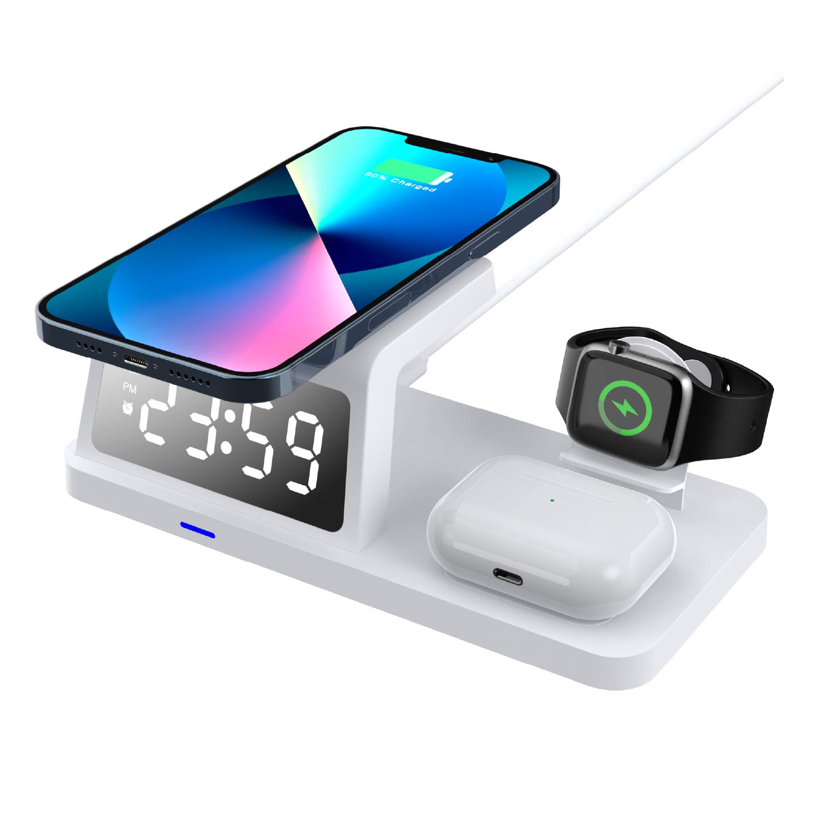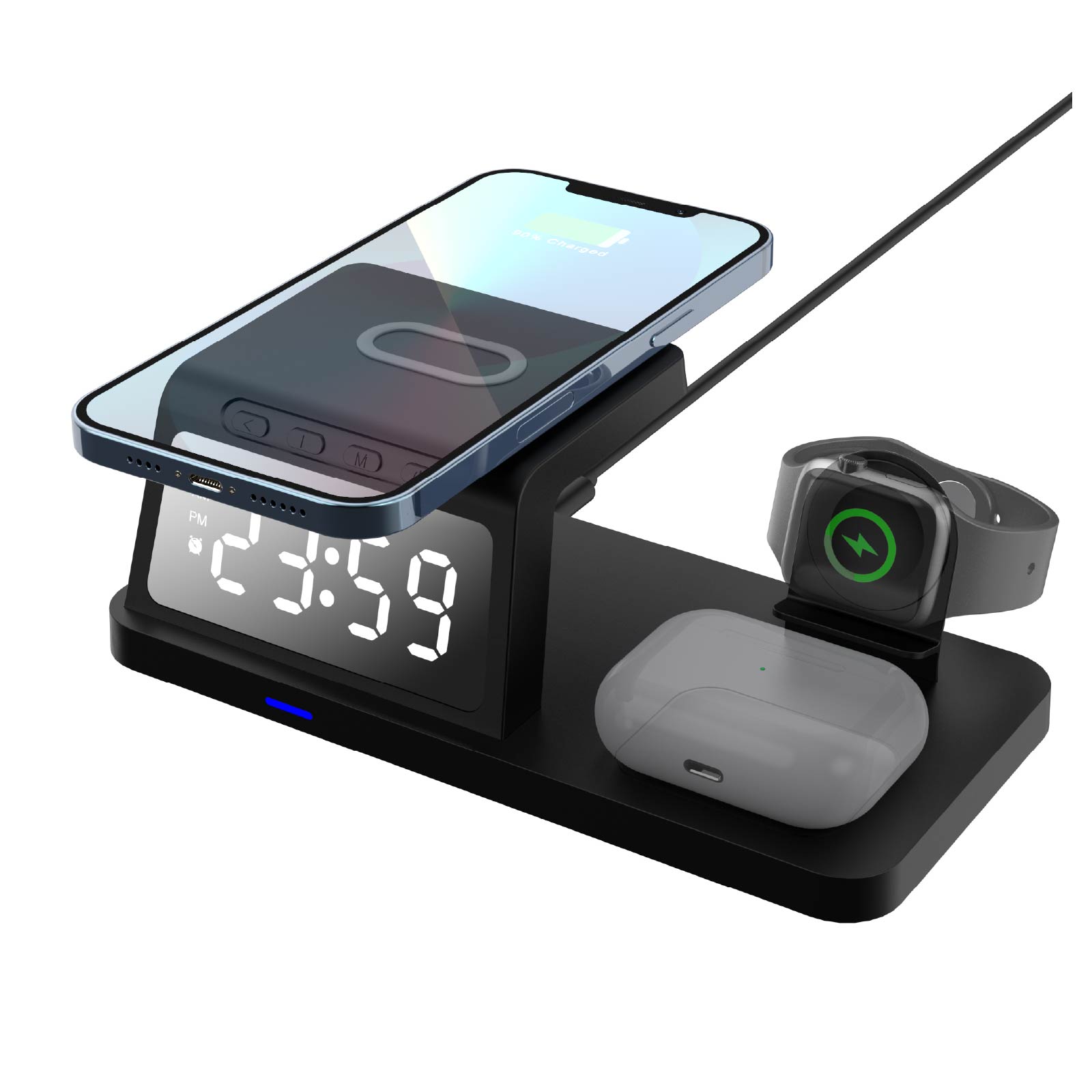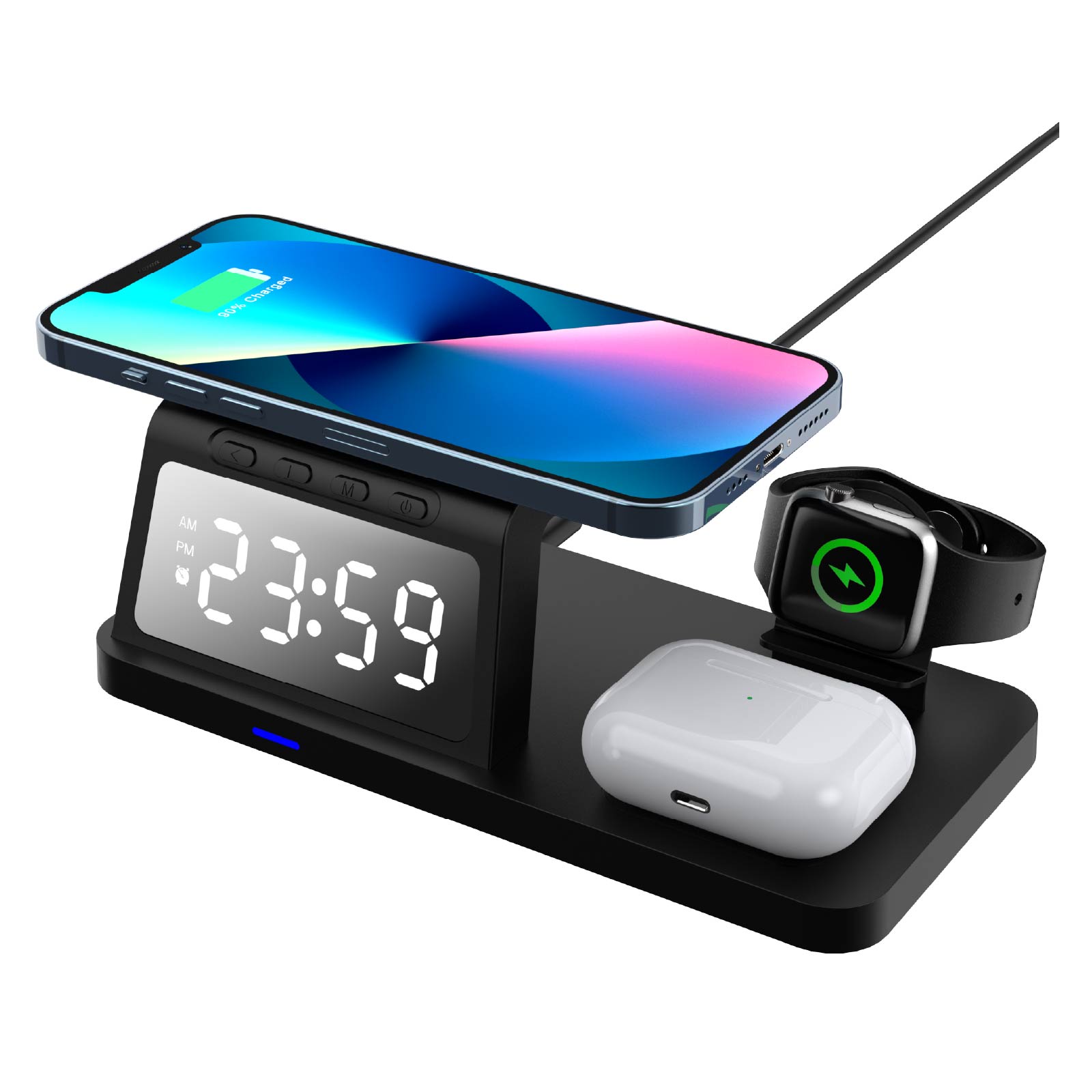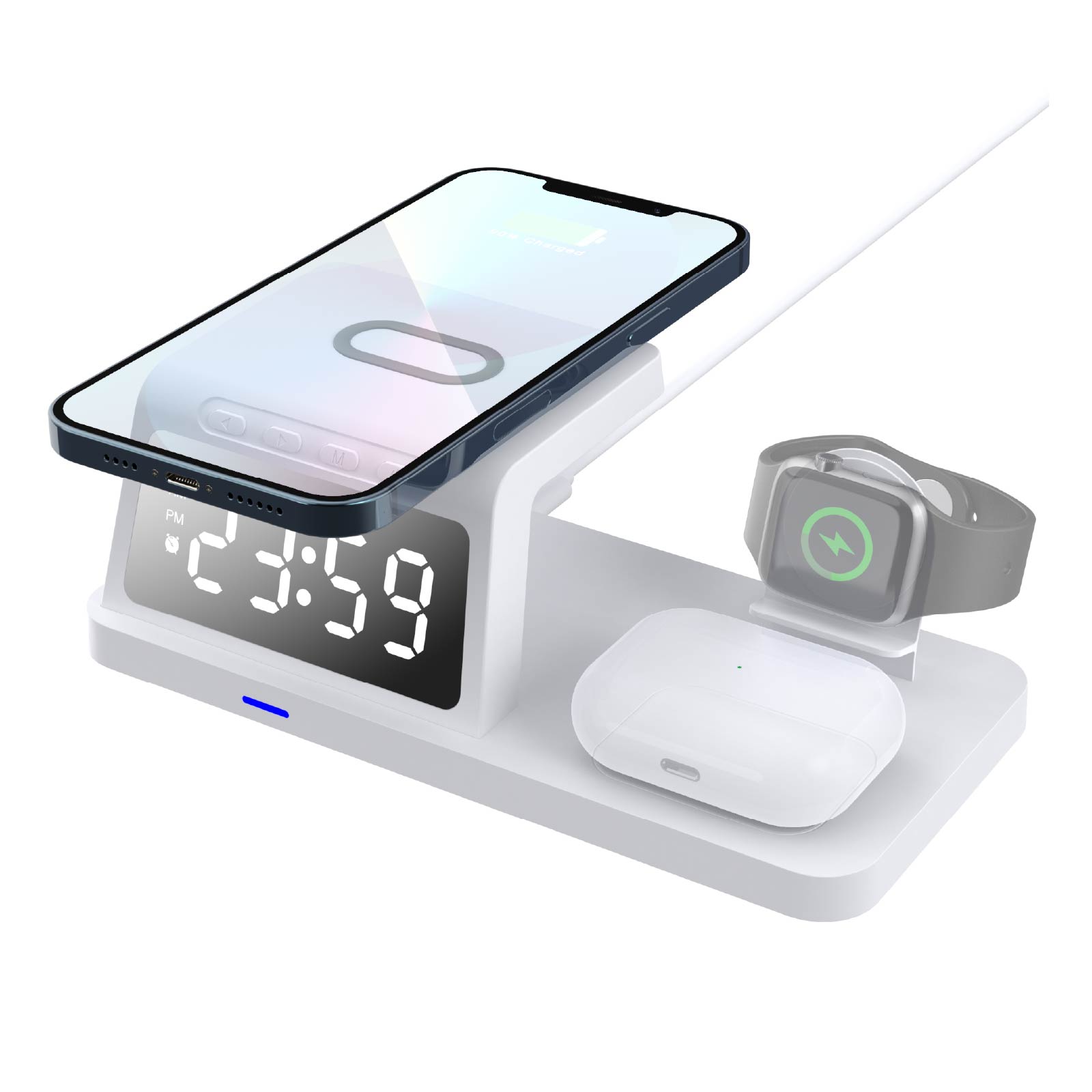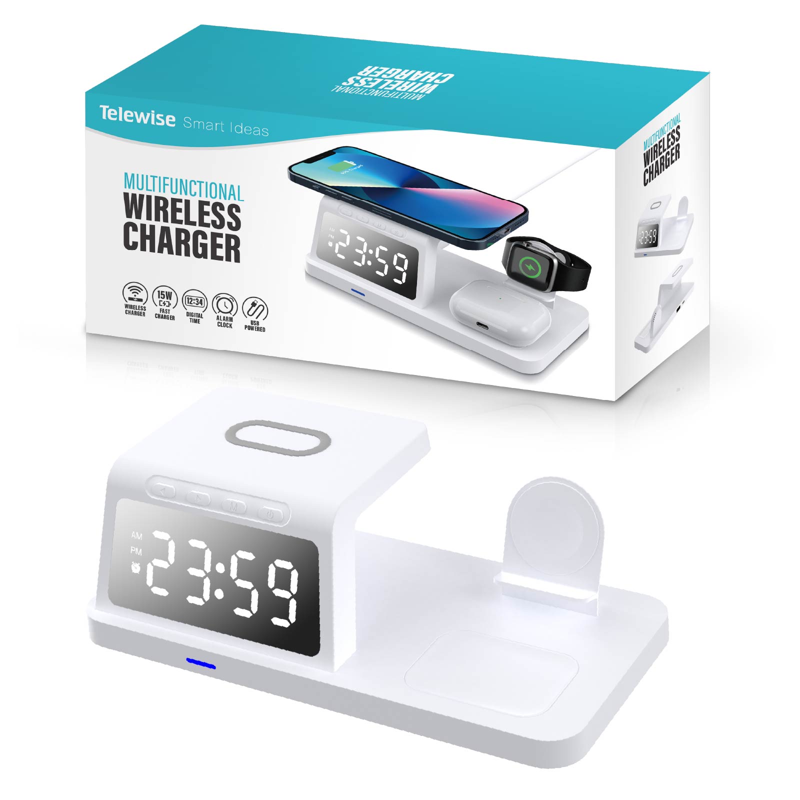 - Function : 3 In 1 Wireless Charger(for Phone, Watch, Earphone), Alarm Clock, Time Display, USB Charging Port