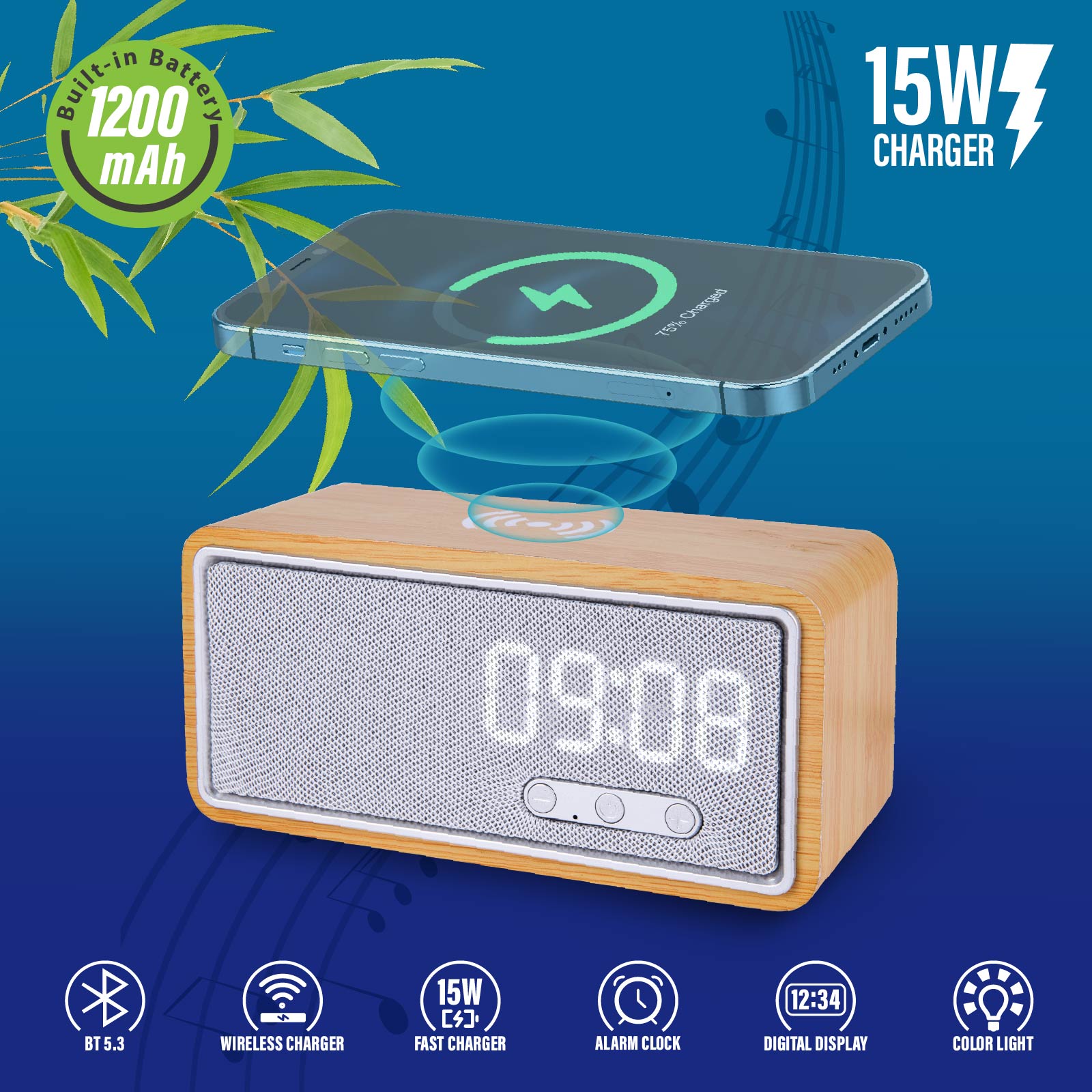 Bamboo 15W Wireless Charger & Speaker with Alarm Clock