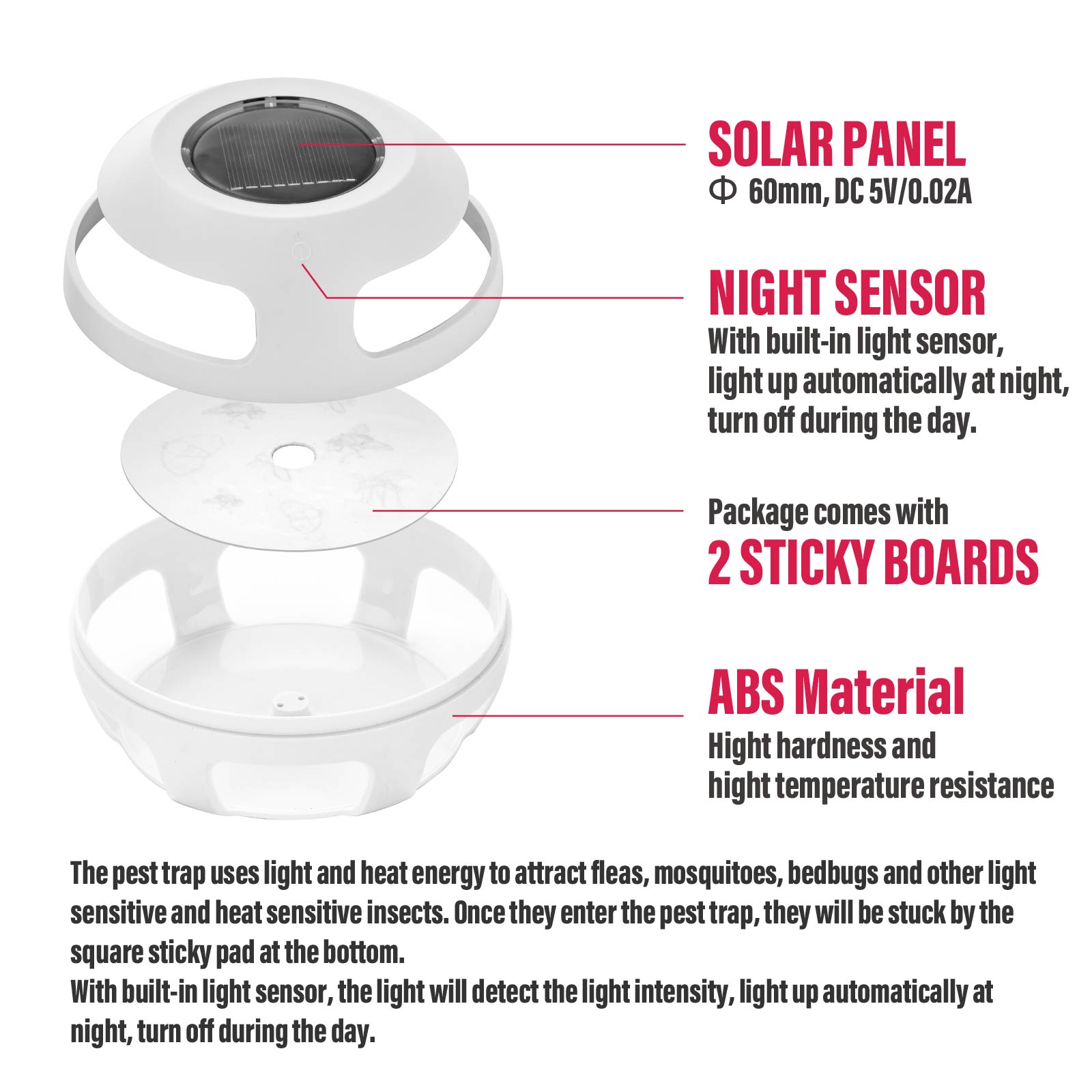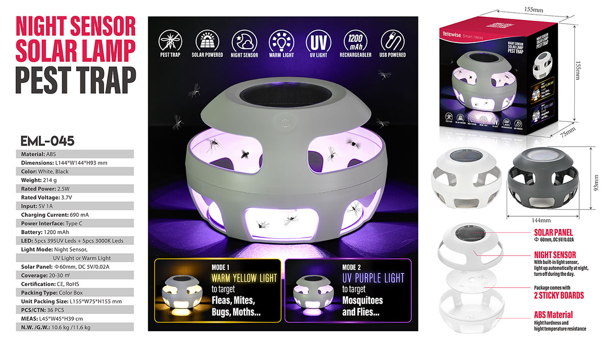 EML-045The pest trap uses light and heat energy to attract fleas, mosquitoes, bedbugs and other light sensitive and heat sensitive insects. Once they enter the pest trap, they will be stuck by the square sticky pad at the bottom. With built-in light sensor, the light will detect the light intensity, light up automatically at night, turn off during the day.