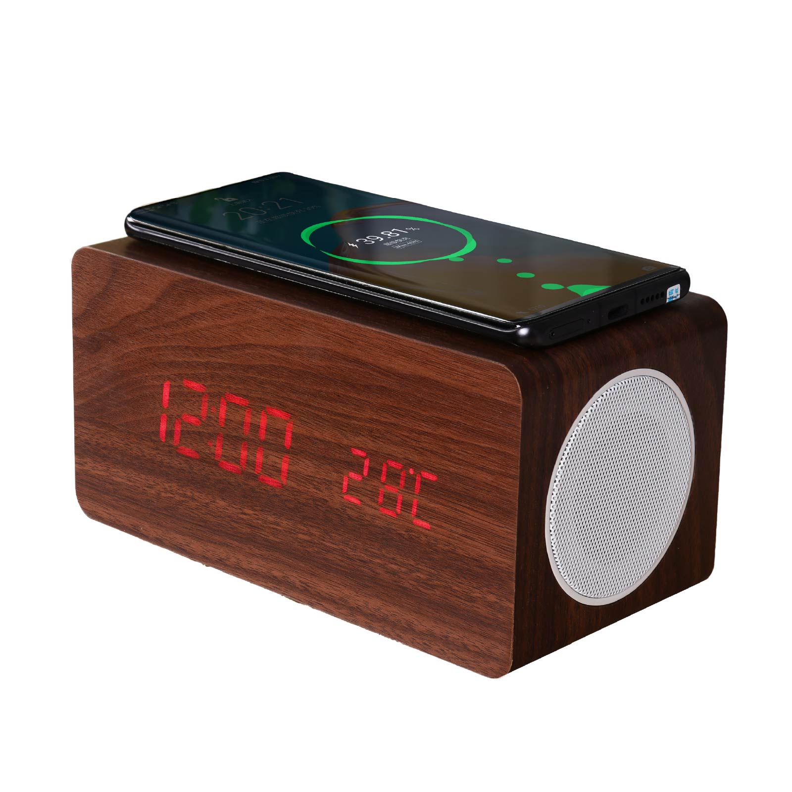 BT02-081Wooden Wireless Speaker, Wireless Charger, Alarm Clock, Temp Display are integrated into one design.