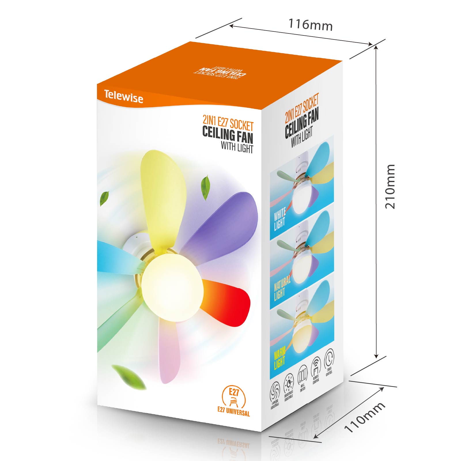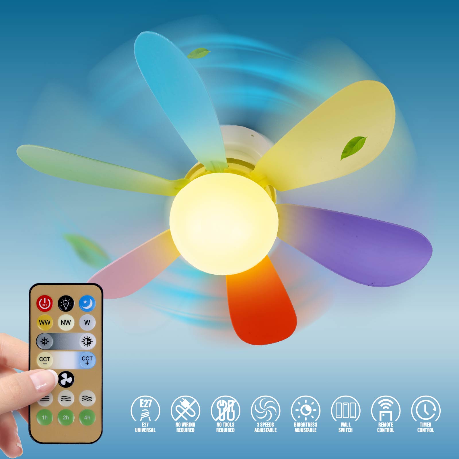 - Function : E27 Universal No Wiring Required, Fan Speed Adjustable, Light Adjustable, Brightness Adjustable, Remote Control, Wall Switch Control, Timer.