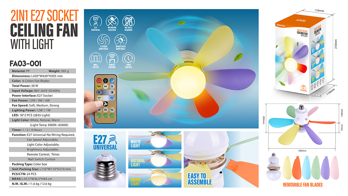FA03-001Combining a LED bulb with a socket fan to tackle air circulation and lighting in your room. Say goodbye to traditional fans and hello to superior brightness, energy efficiency, and compatibility with E27 sockets. Adjust brightness and color temperature seamlessly with our Stepless Control feature. Simply hold the "+,-" keys to transform your space from cozy warm yellow (3000K) to refreshing cool white (6500K) effortlessly.