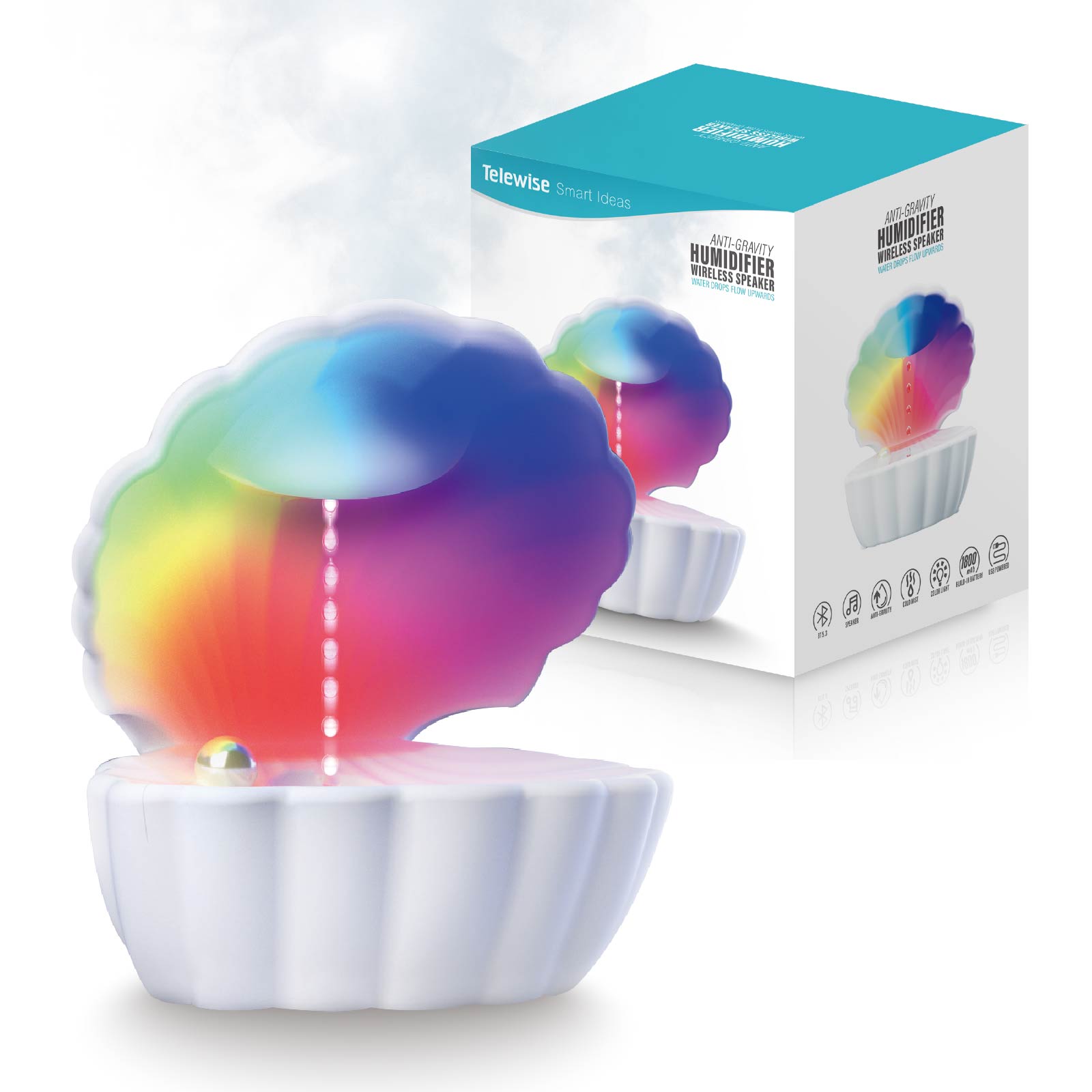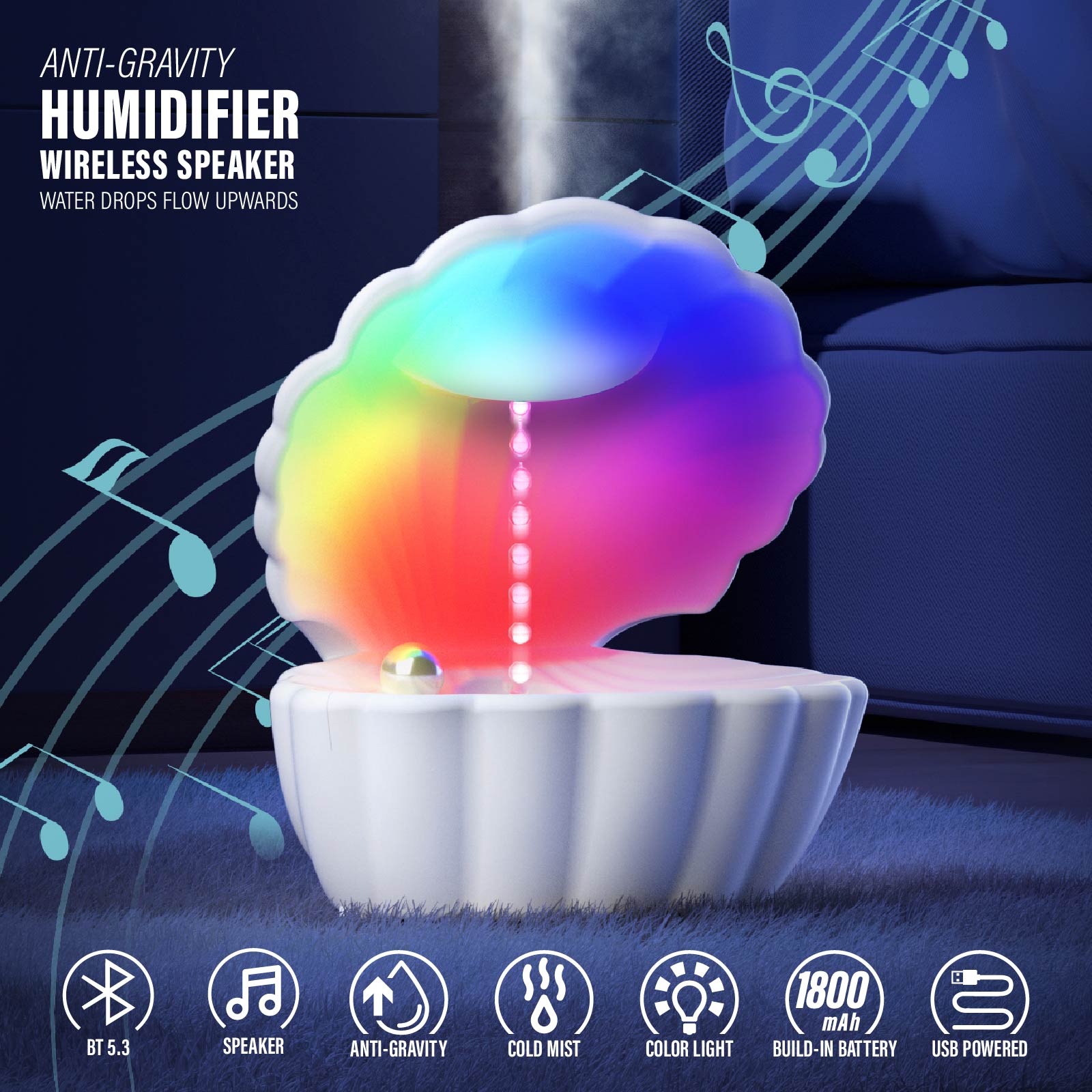 - Function : Bluetooth Speaker, Anti-gravity Flow Upwards, Cold Mist, Color Light, USB Powered