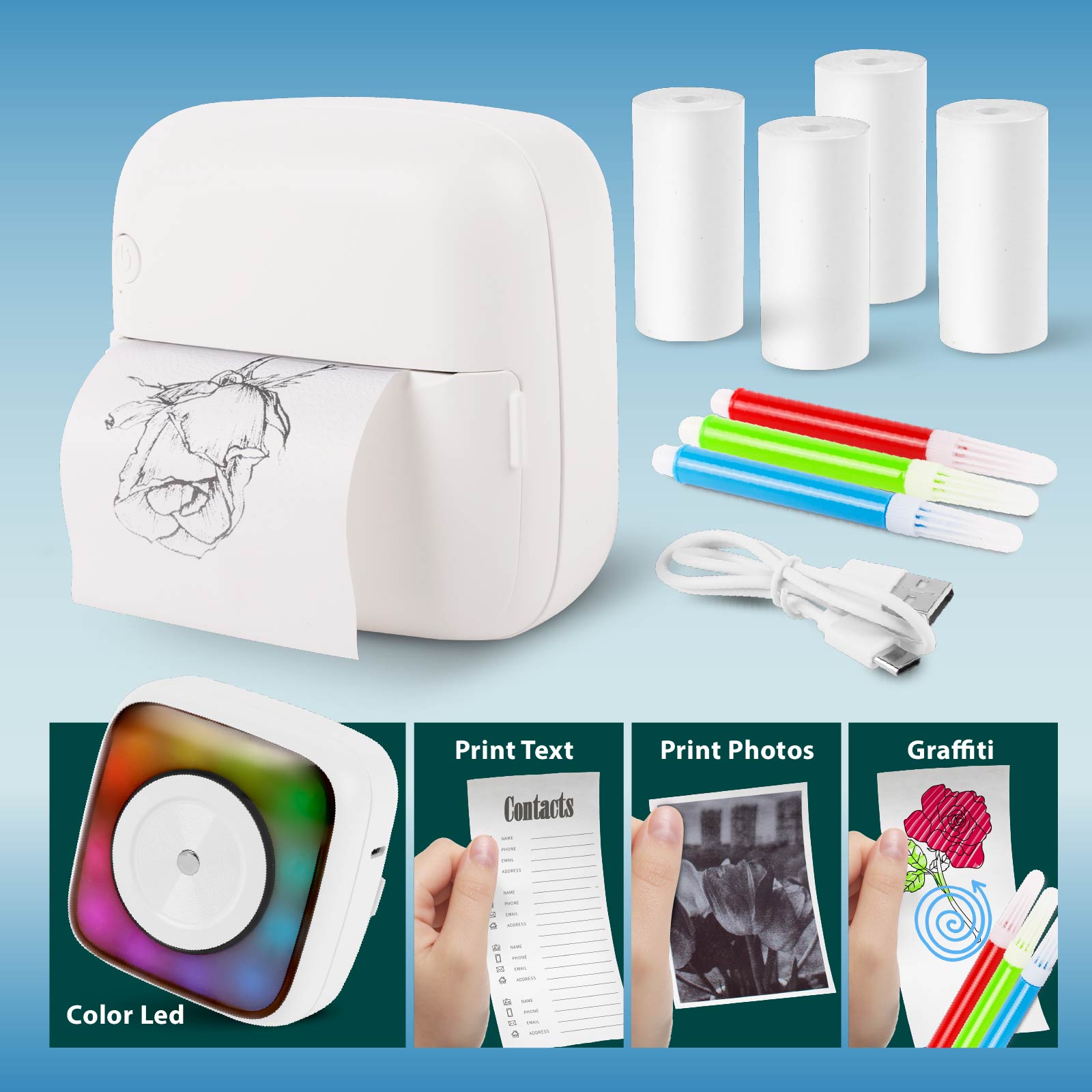- Accessories : 3 Color Markers, 4 Rolls of Printing Paper, USB to TypeC Cable
