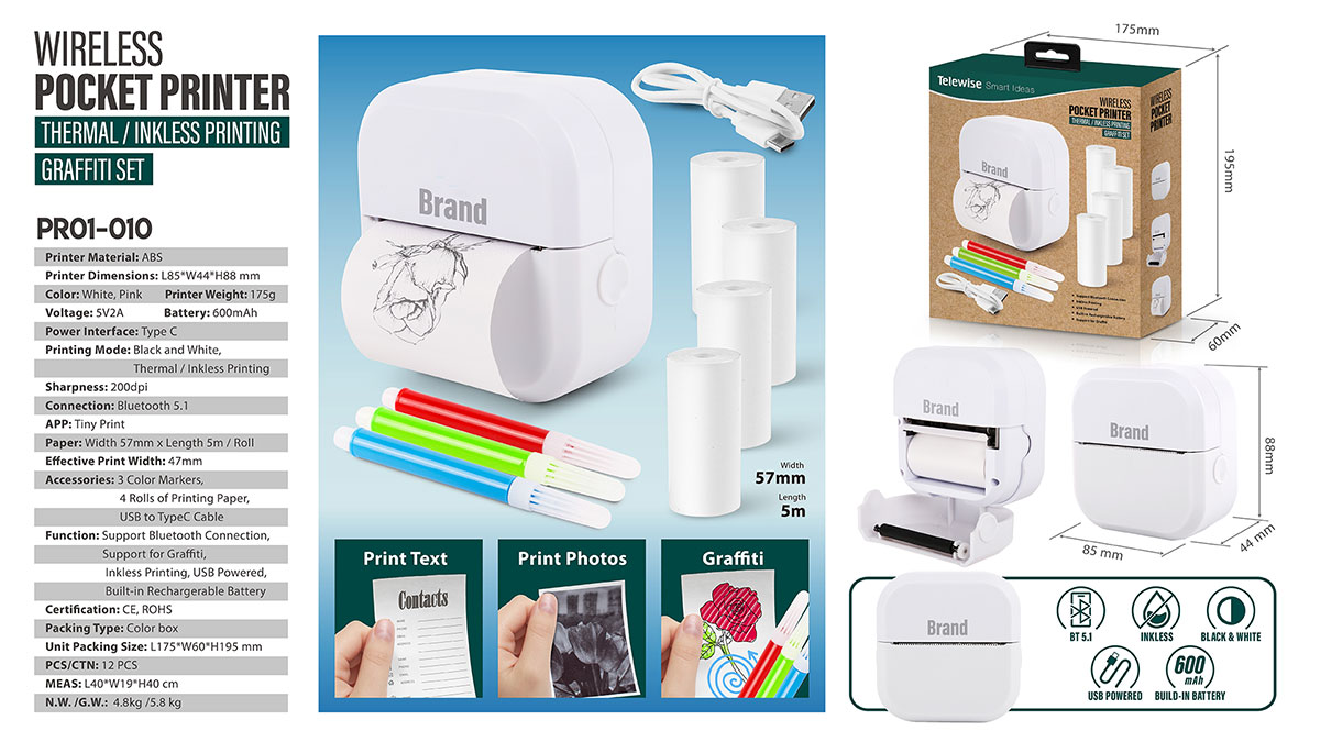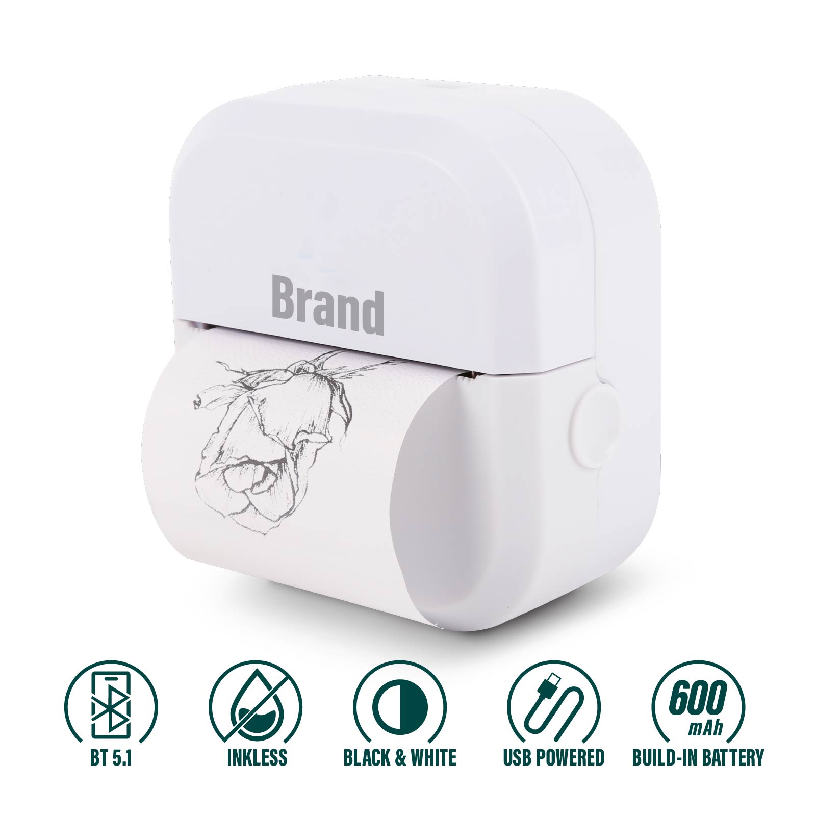 PR01-010Equipped with a high-quality thermal print head that generates patterns on thermal paper by heating without using ink, 200 DPI high-resolution black and white images can be printed more clearly.Our inkless printer for printing black and white photos, memos, labels, cute pet stickers, QR codes, etc. Information and images on the phone screen can be printed instantly. Improve efficiency by helping you organize and summarize work plans, shopping lists, and more.