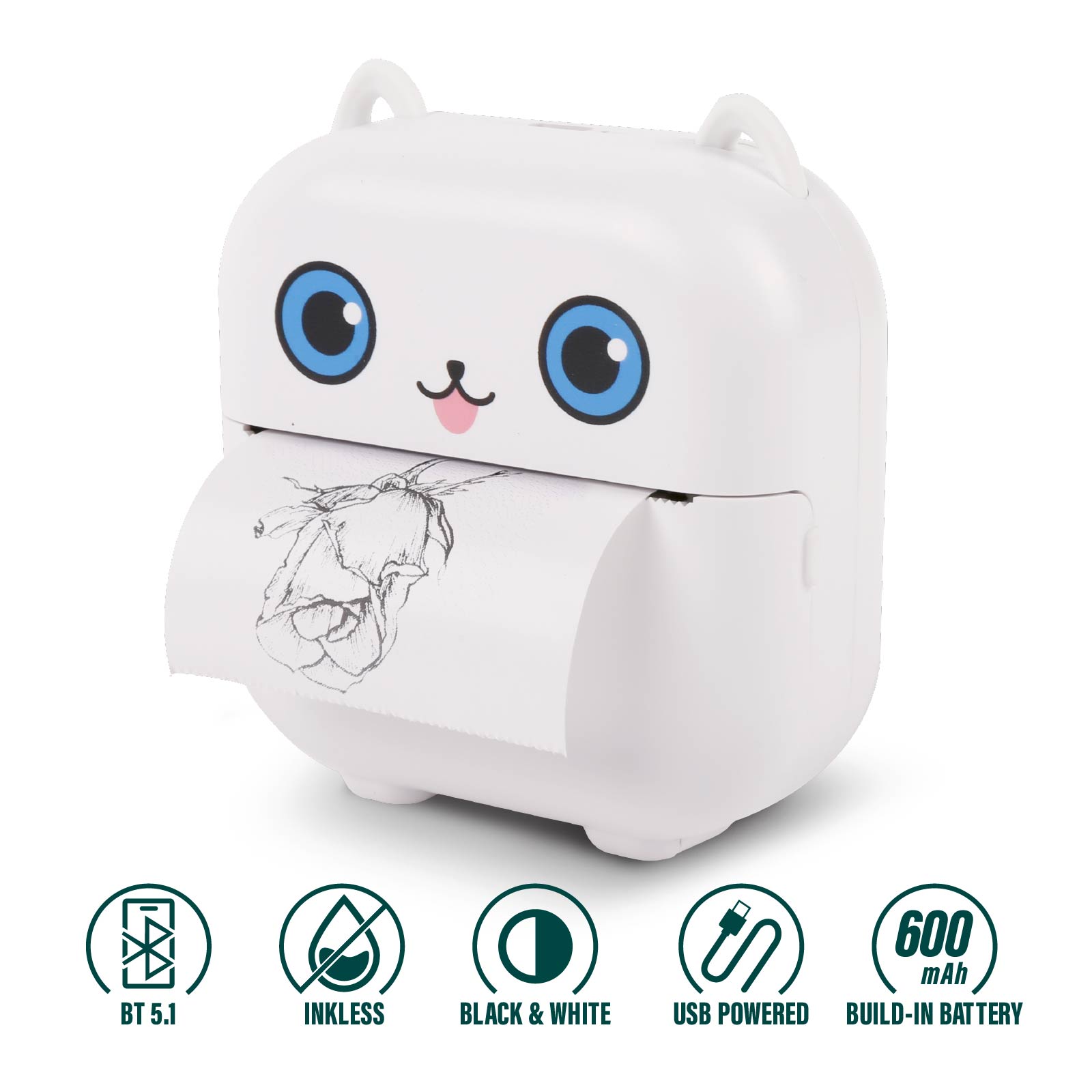 - Function : Support Bluetooth Connection, Inkless Printing, Built-in Rechargerable Battery, USB Powered