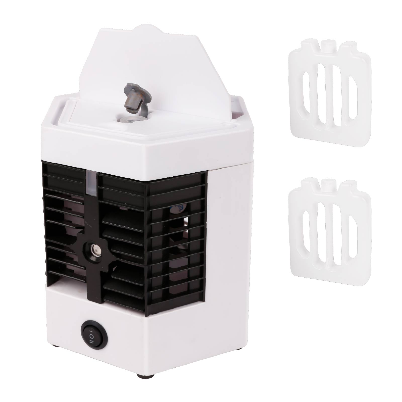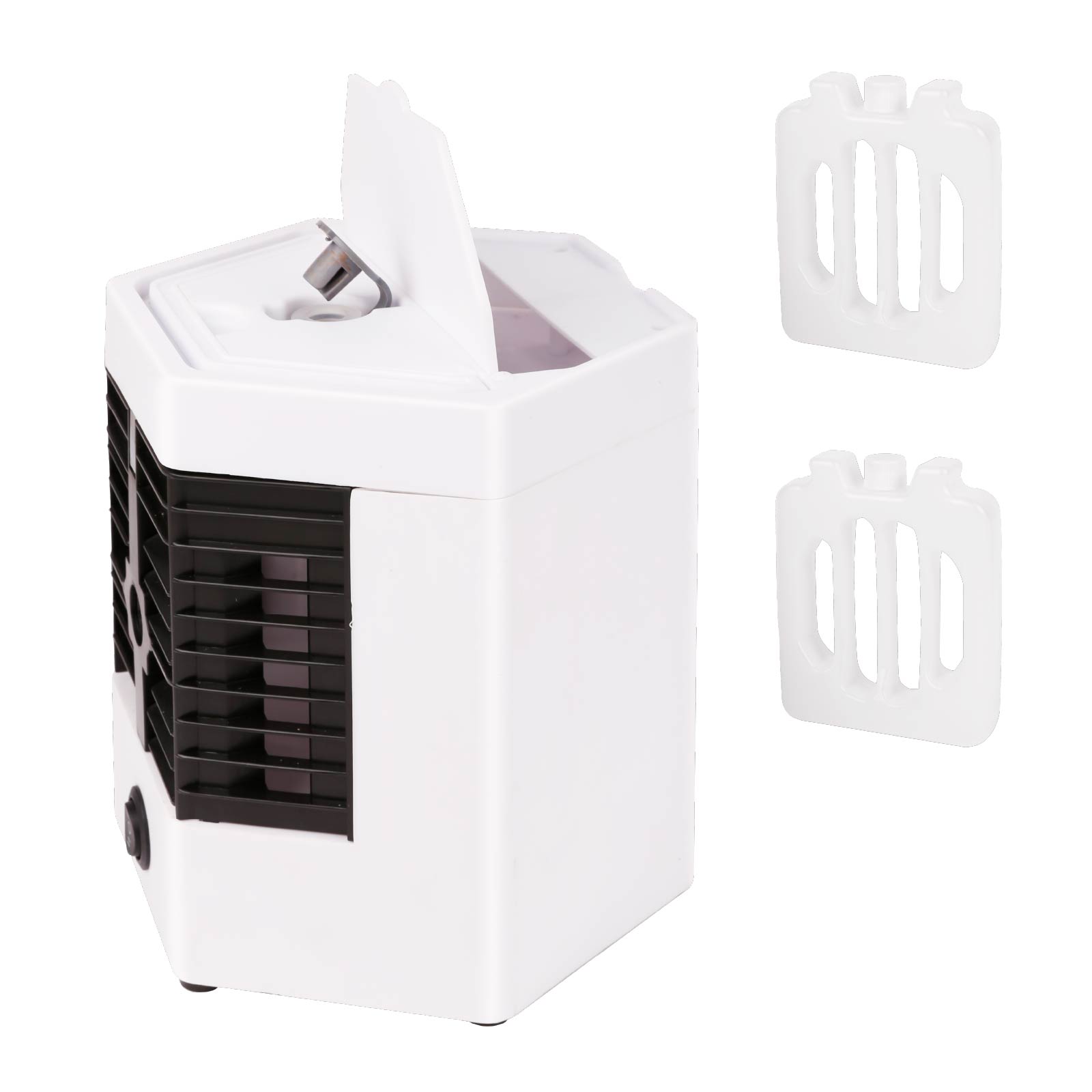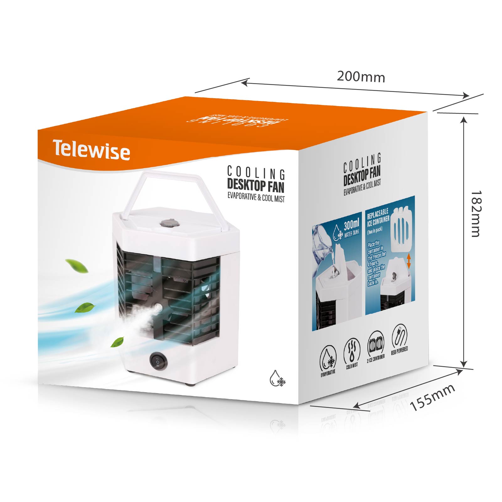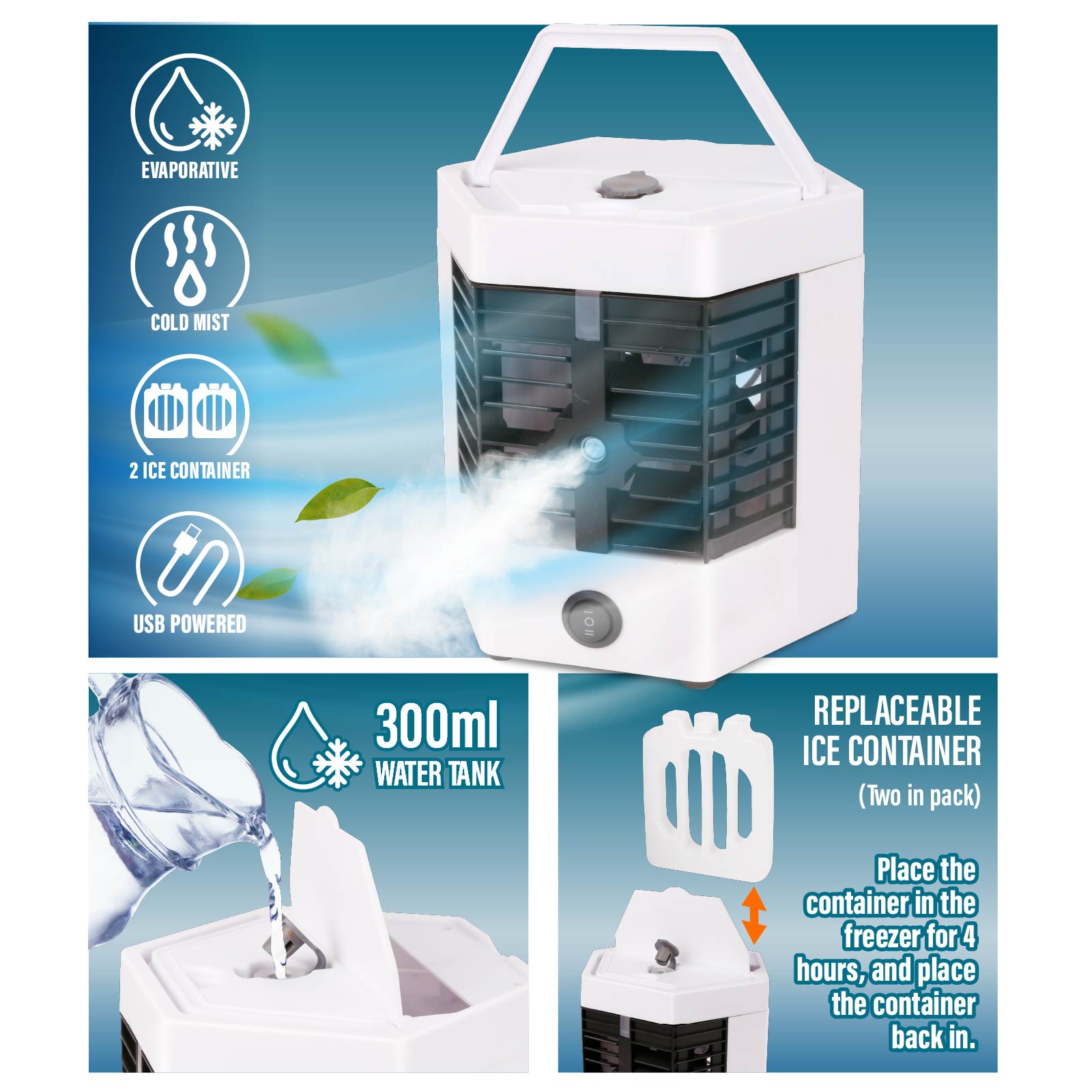 - Function : Evaporative Air Cooler, Cool Mist, USB Powered, Two Freezie Ice Container