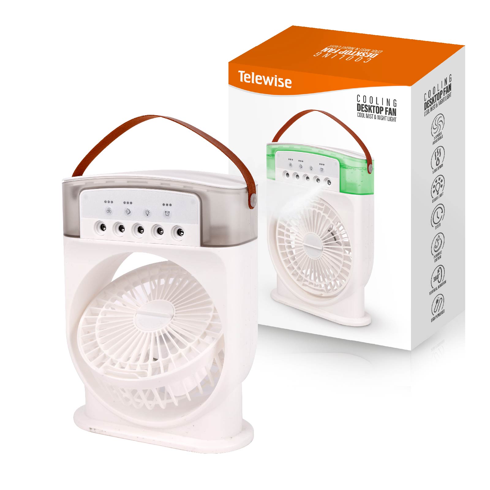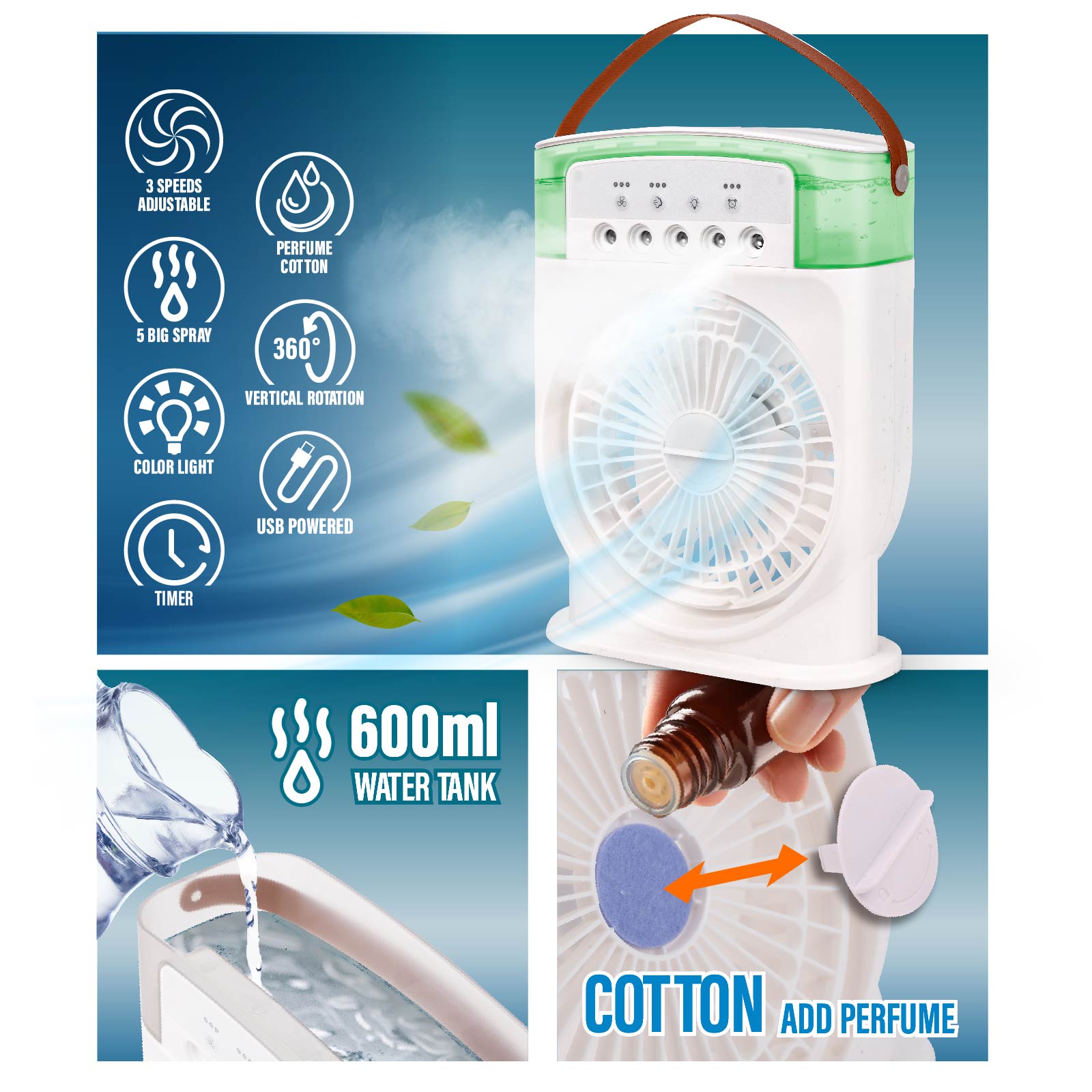 - Function : Three Speed Adjustable, Fan 360 ° Rotation, Color Light, 5 Big Spray Cool Mist, USB Powered, Timer, Perfume Cotton