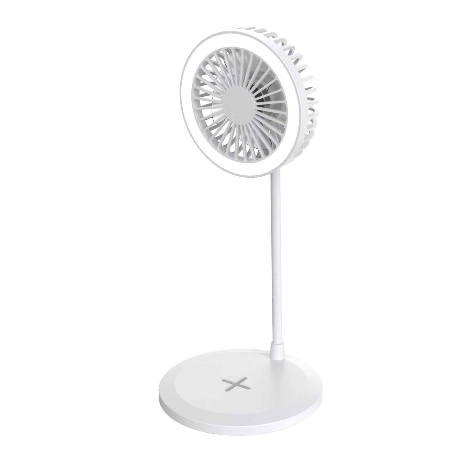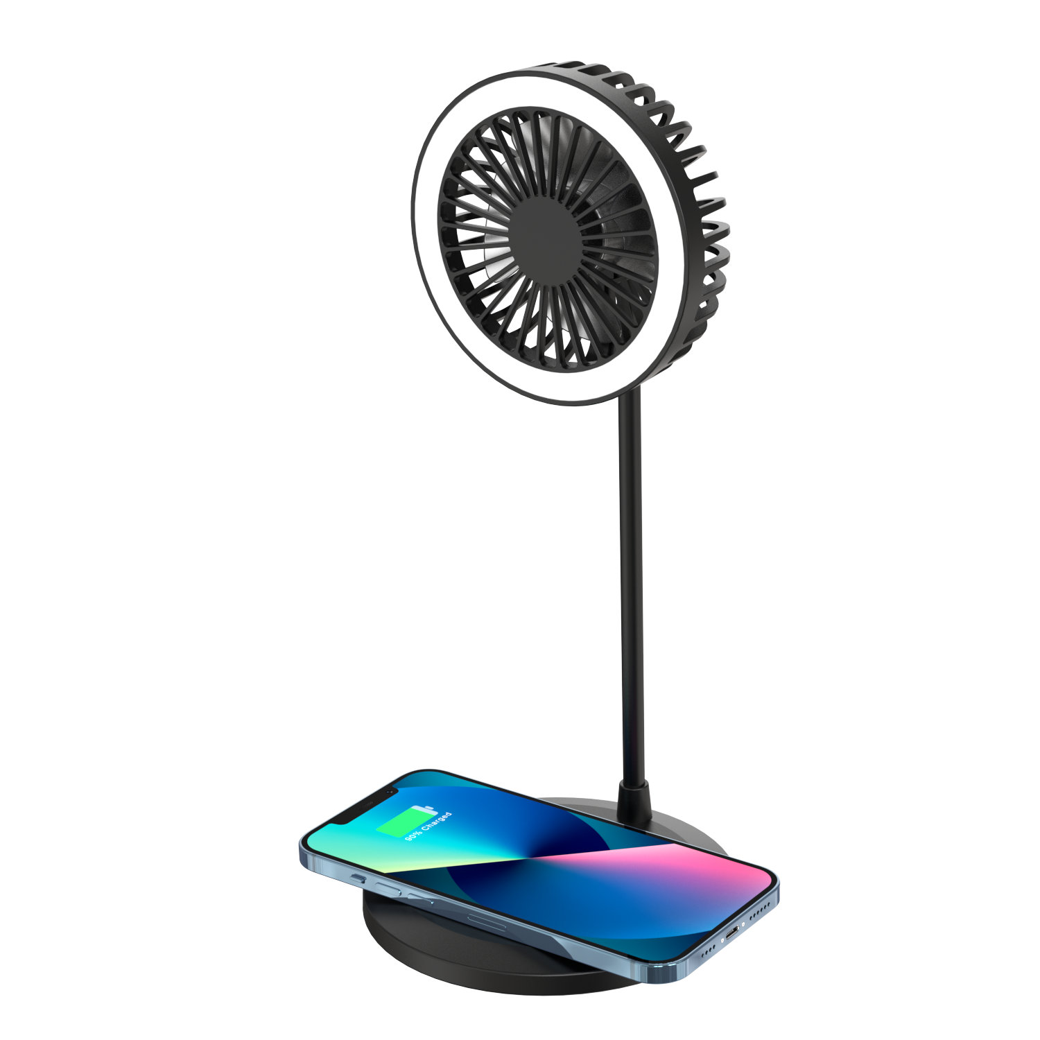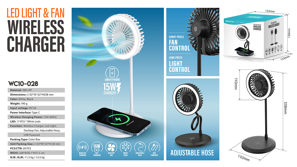 WC10-028All-in-one multi-purpose wireless charger, with desktop fan & led night light, adjustable hose; 15W output ,meet the charging demand, quickly and safety charge.