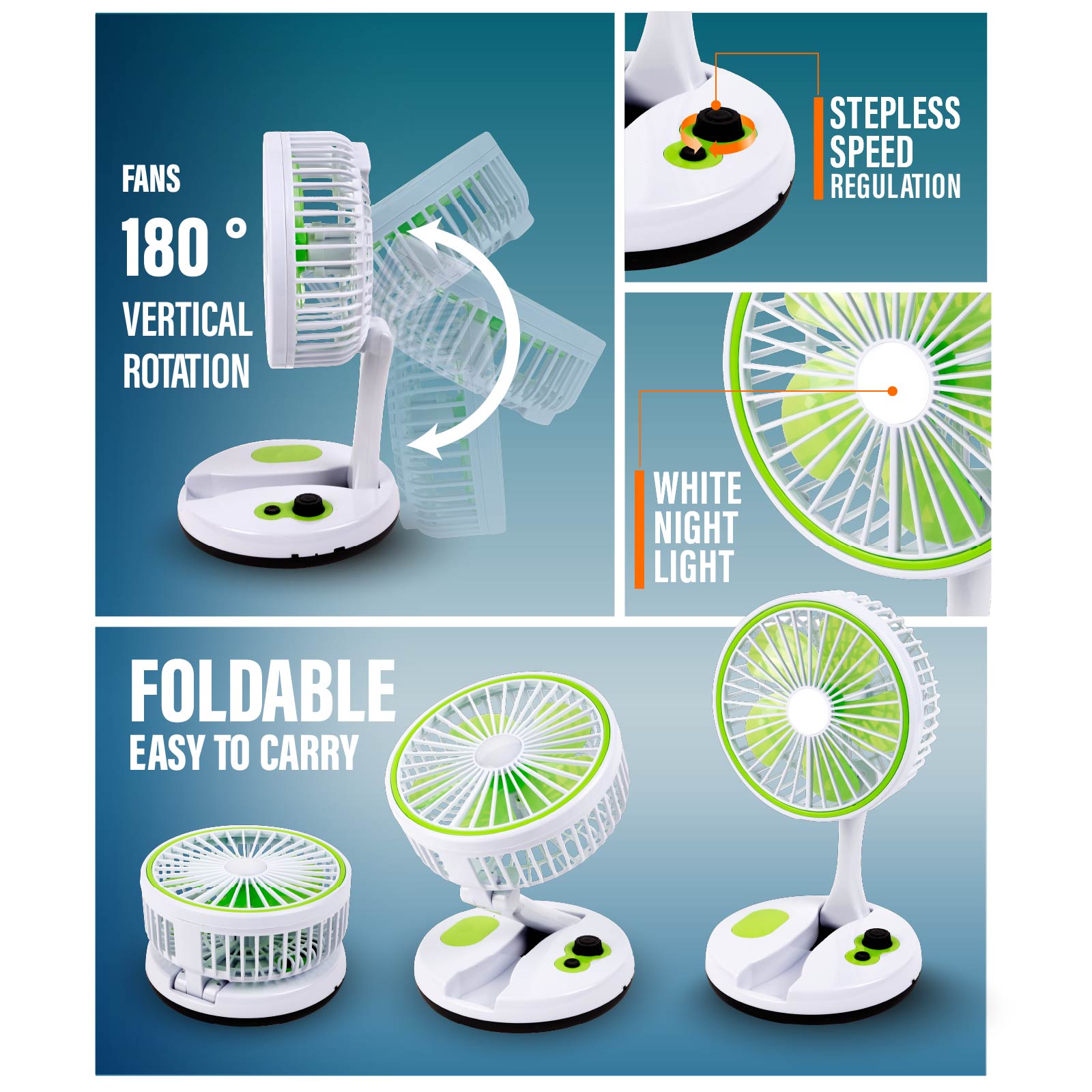 - Function : Fan Speed Adjustable, Fan 180 ° Vertical Adjustable, Portable & Foldable, USB Powered, Build-in Rechargeable Battery.