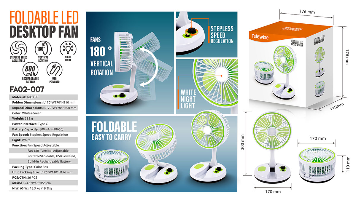 FA02-007This portable fan can efficiently cool down ambient temperature, providing powerful and cool air flow within few seconds. You can turn on the light alone without turning on the fan, enhance your nighttime ambiance while enjoying cool.