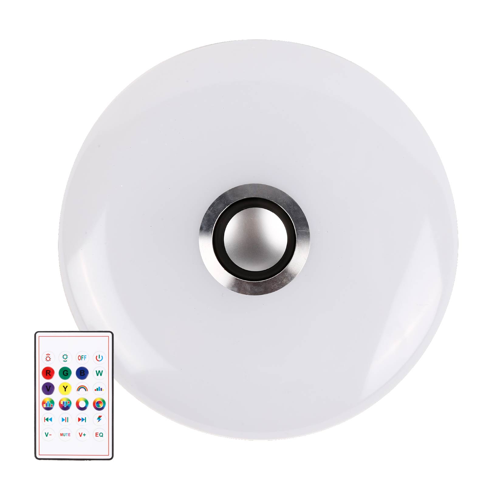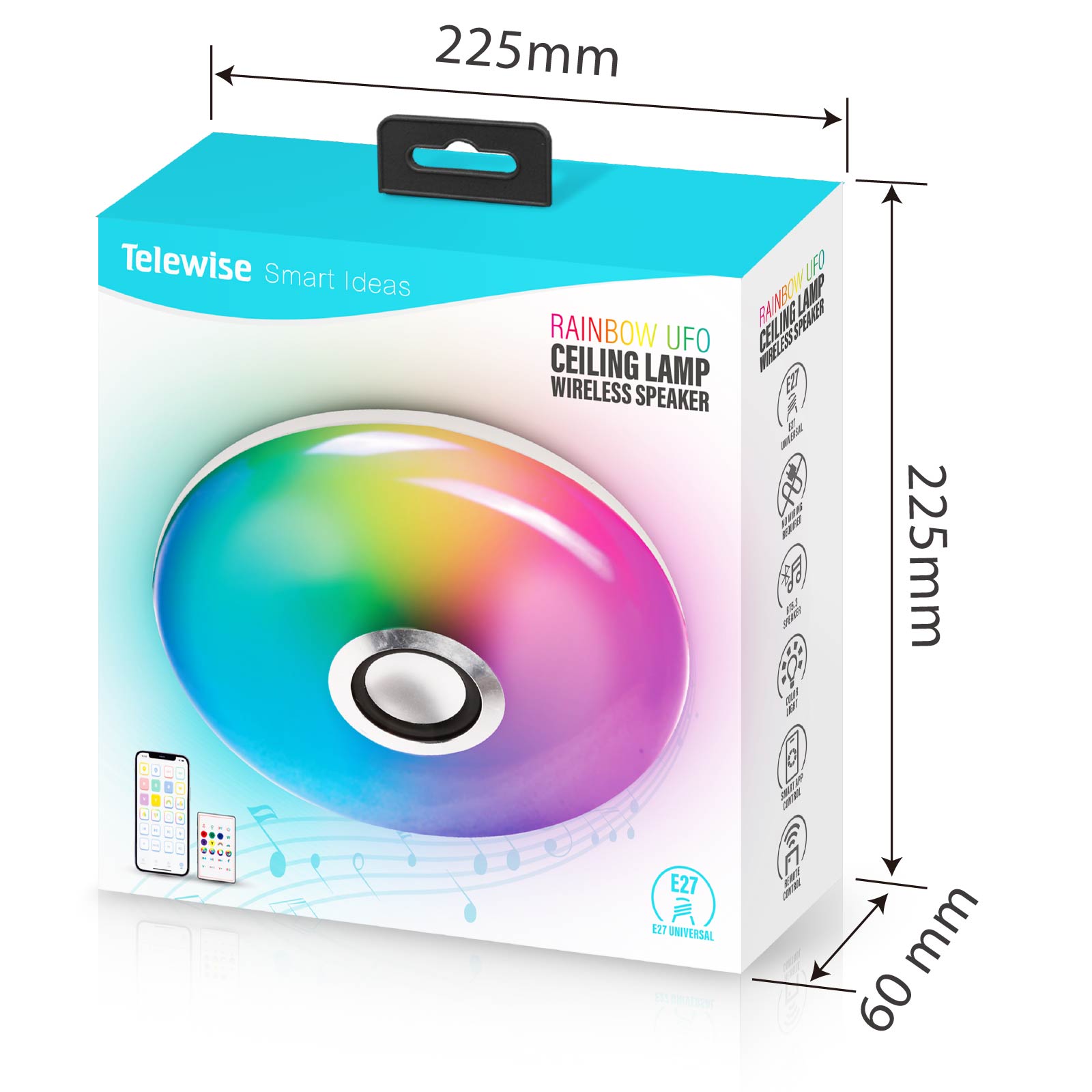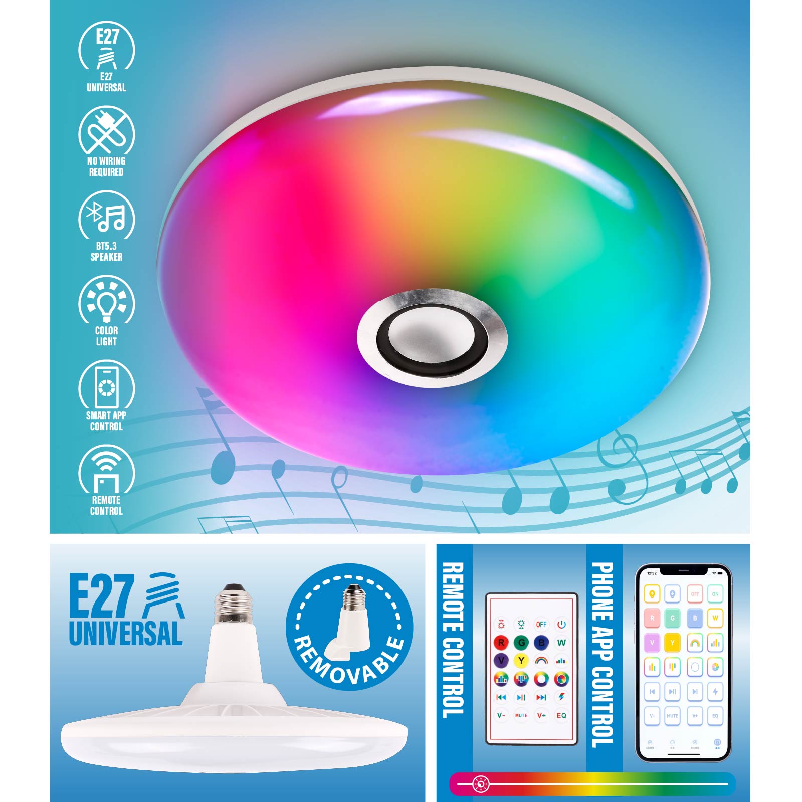 - Function : Bluetooth Speaker, RGB Light, Remote Control, Phone App Control, E27 Powered