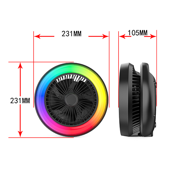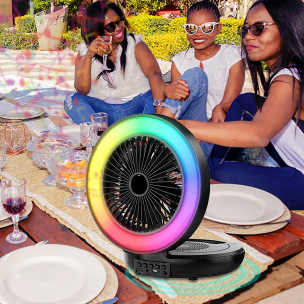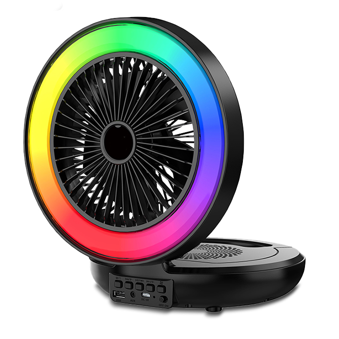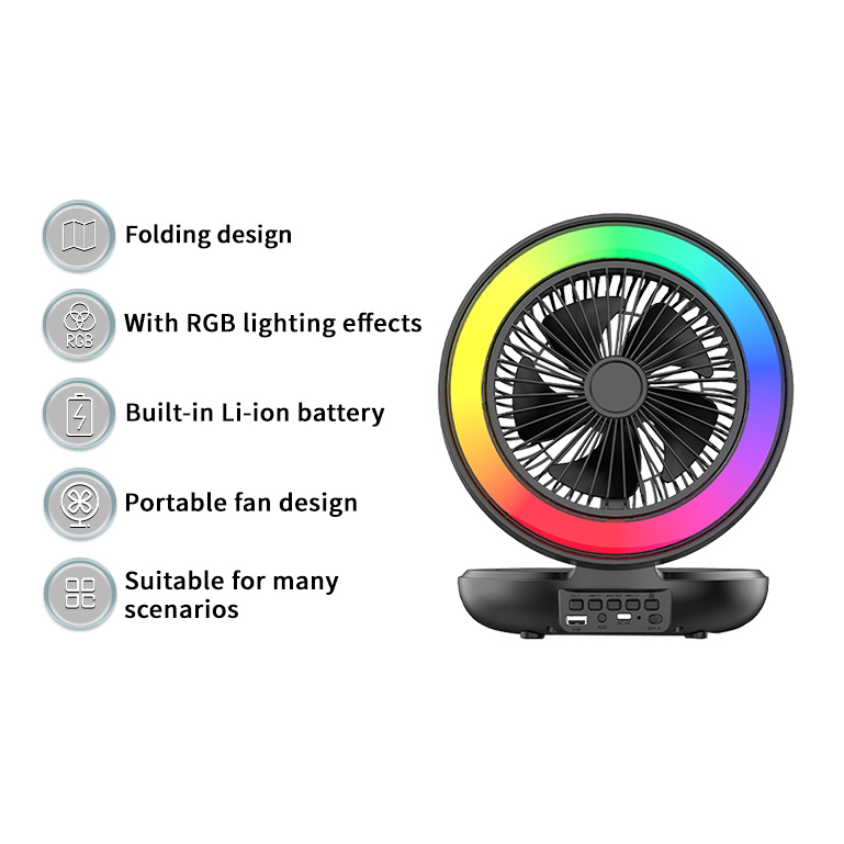 - Function : Foldable Fan, Fan Speed Adjustment, Bluetooth Speaker, USB Disk, TF Card, MIC Port , AUX, FM Radio, RGB Light, USB Powered, Build-in Rechargeable Battery.