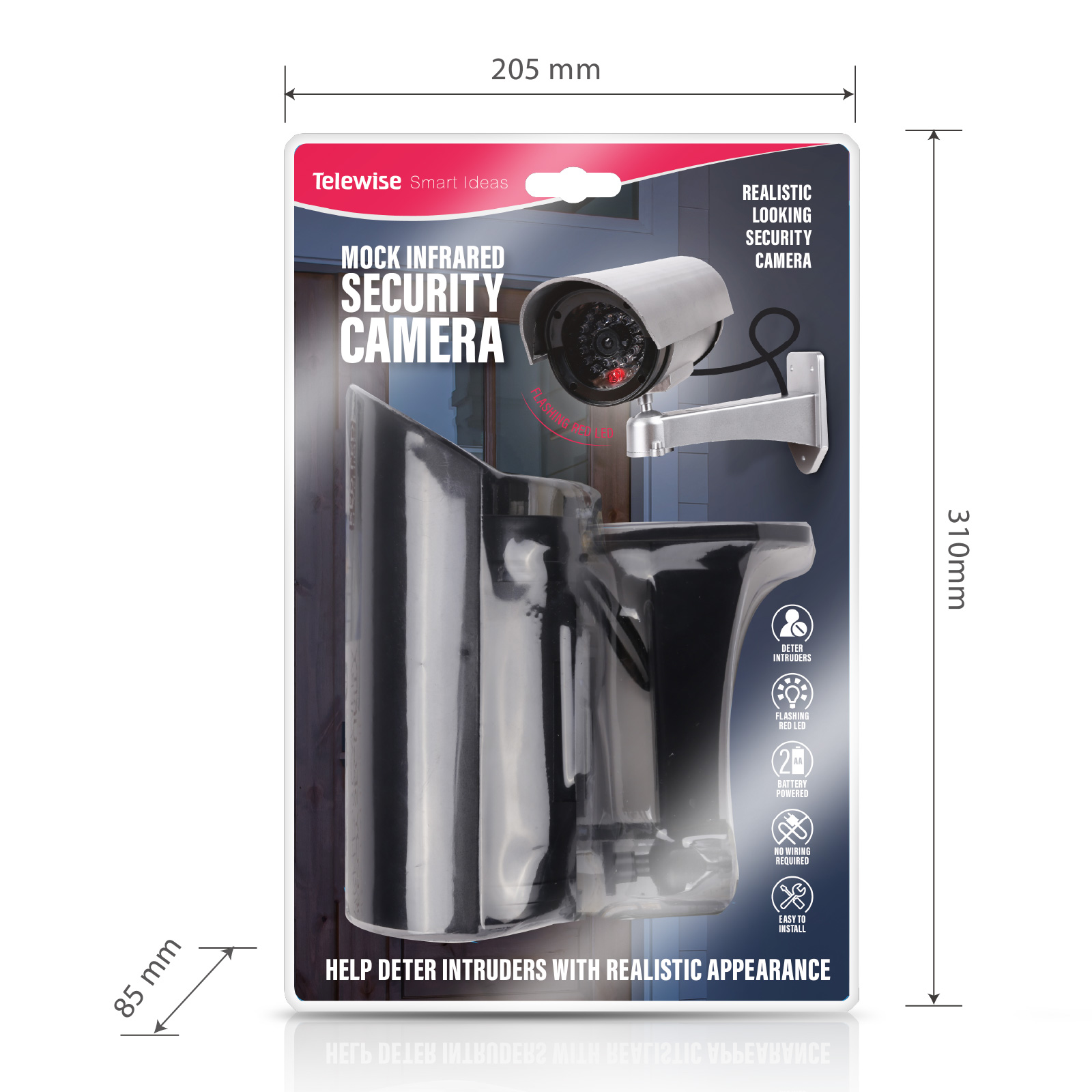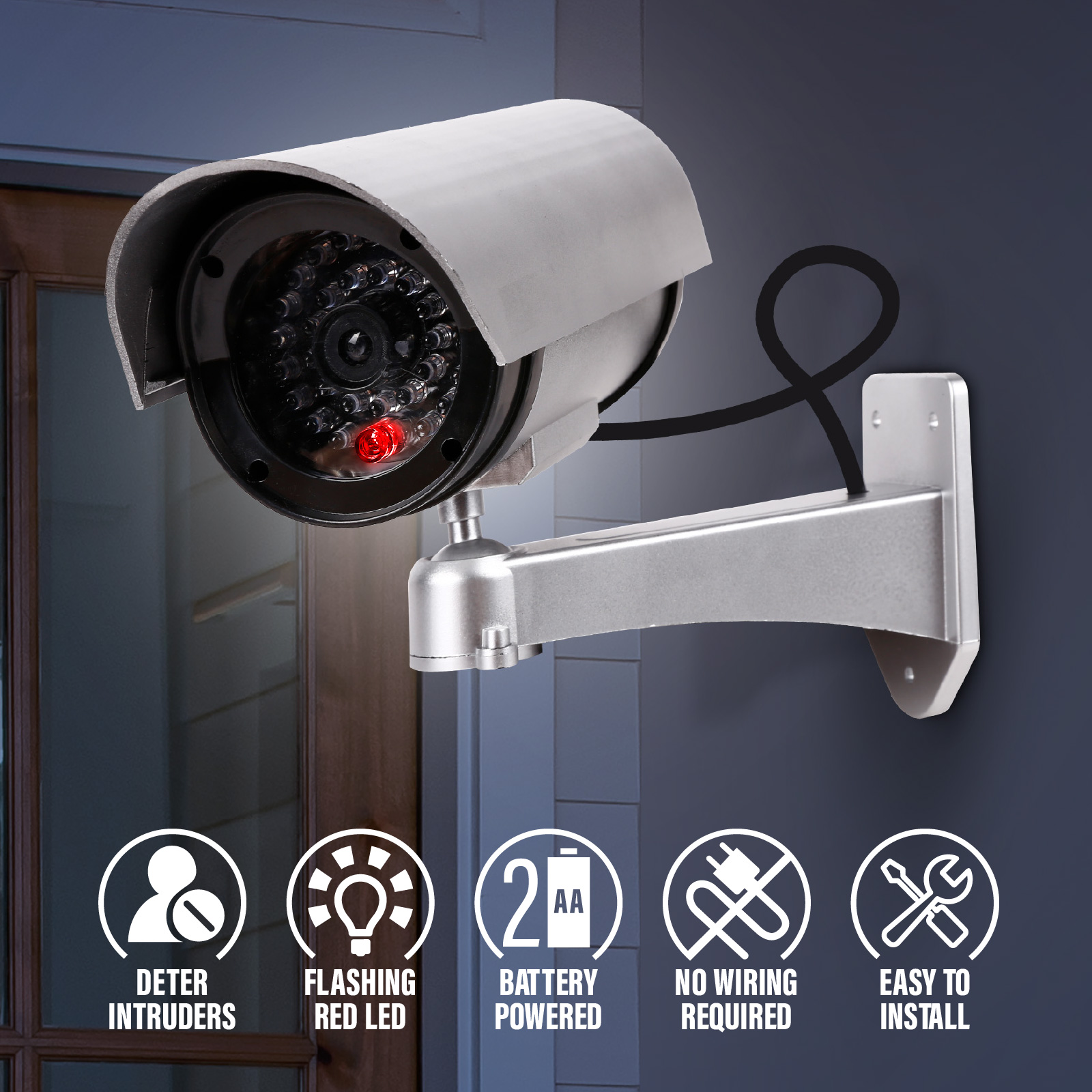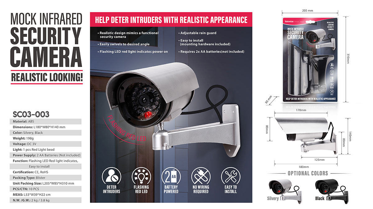 SC03-003Realistic design mimics a functional security camera, Easily swivels to desired angle, Flashing LED red light indicates power on, Easy to install (mounting hardware included.