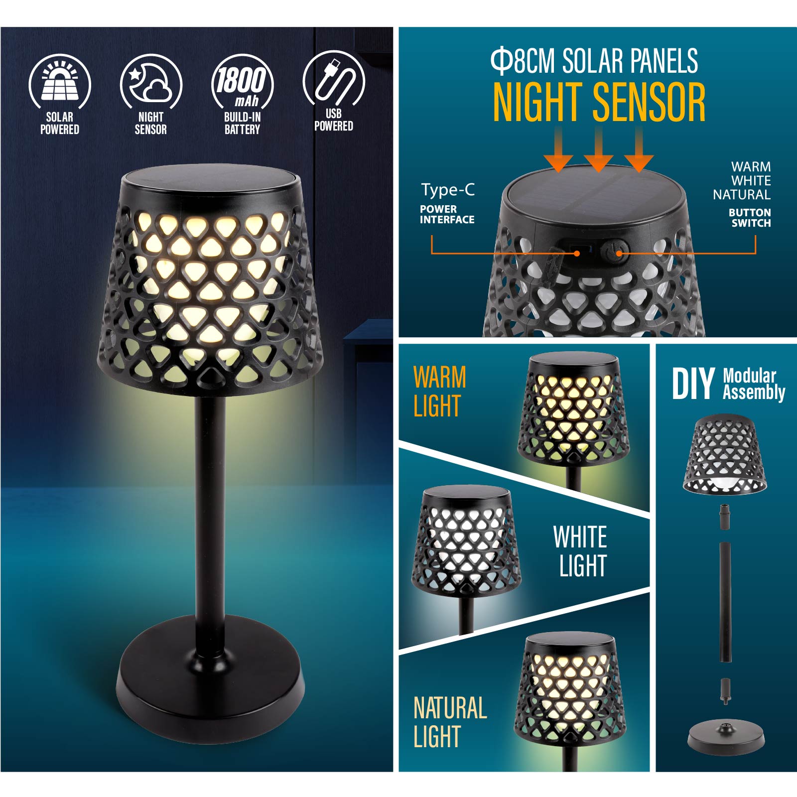 - Function : Night Sensor, Solar Powered, USB Powered, Build-in Rechargeable Battery, DIY Modular Assembly