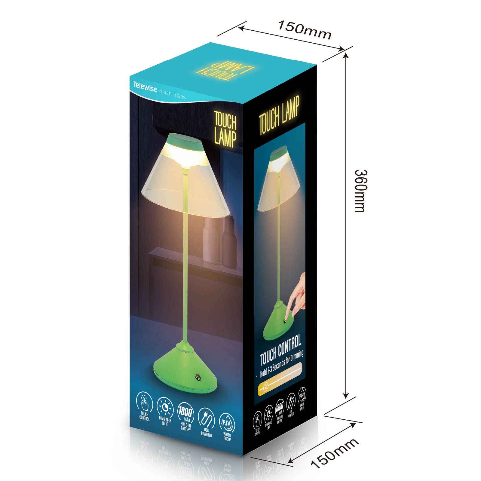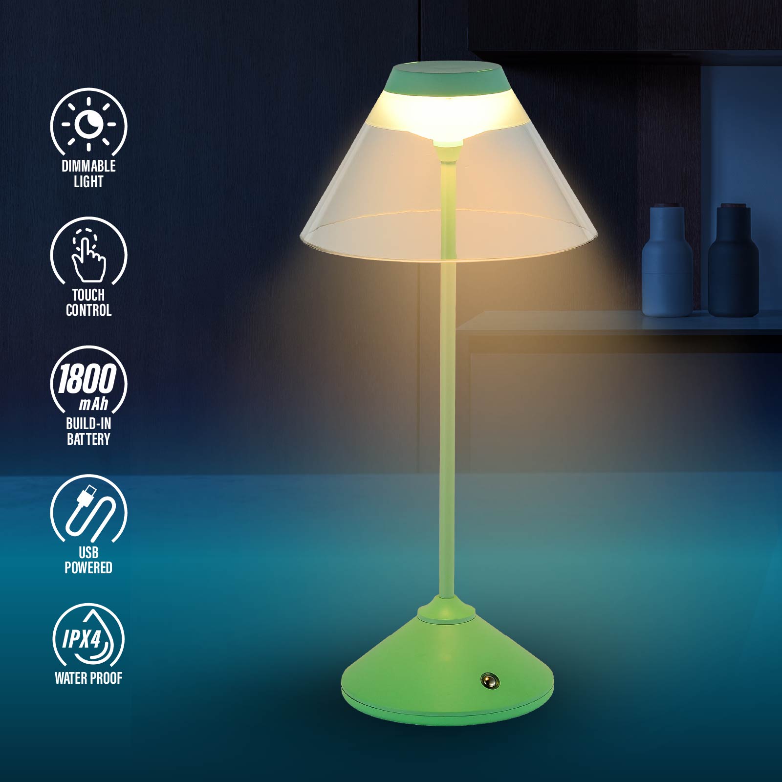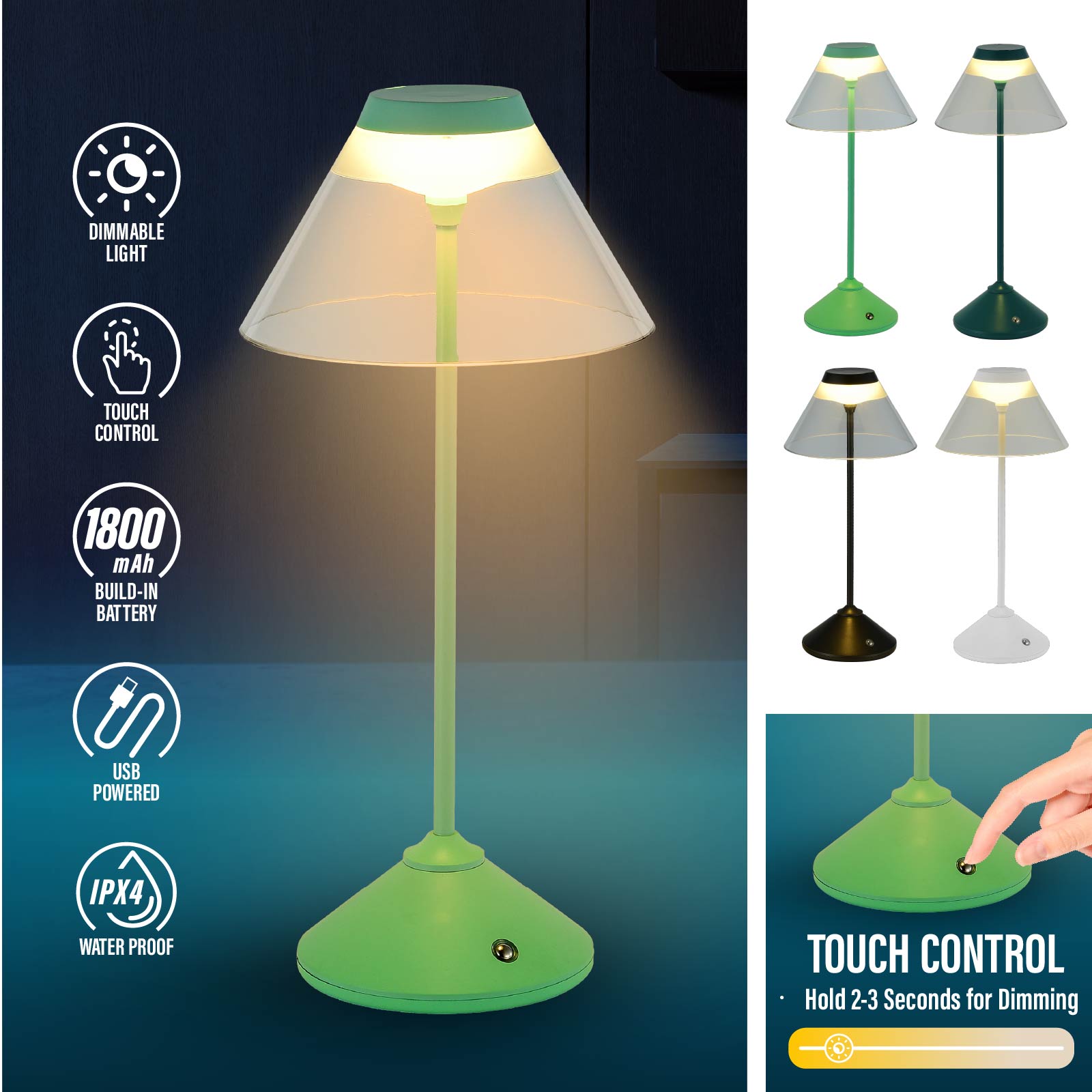 - Function : Touch Control, Dimmable Light, USB Powered, Build-in Rechargeable Battery, IPX4 Waterproof