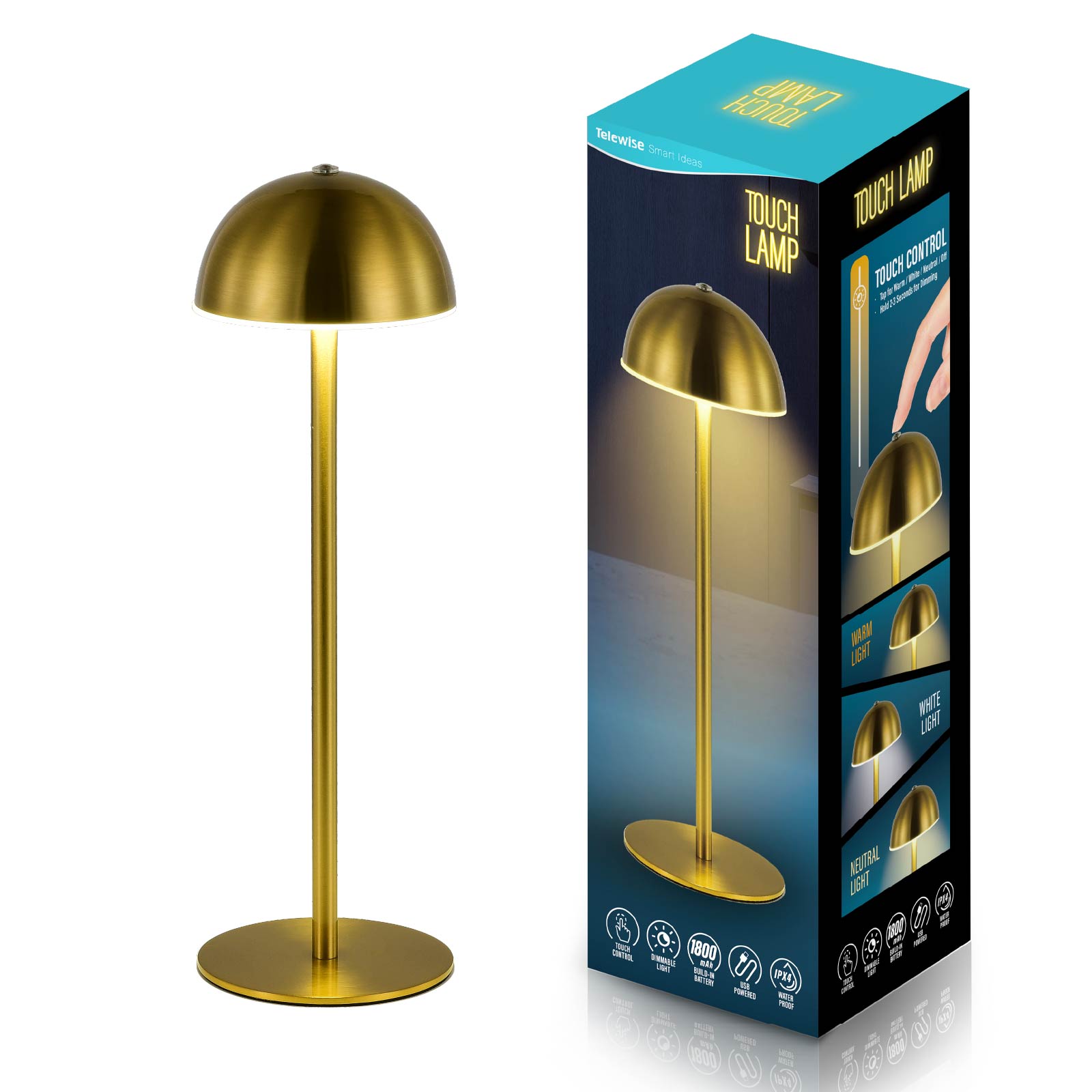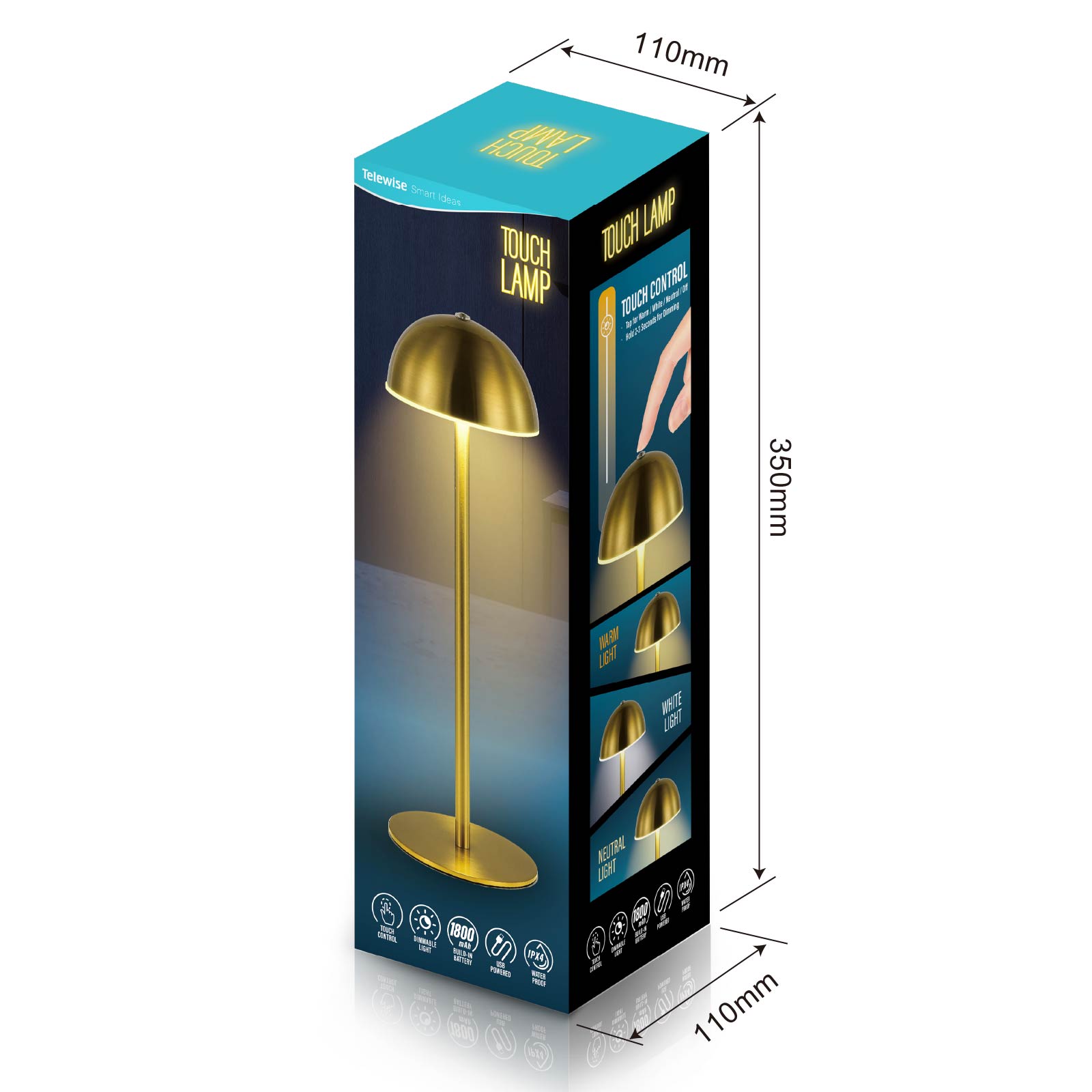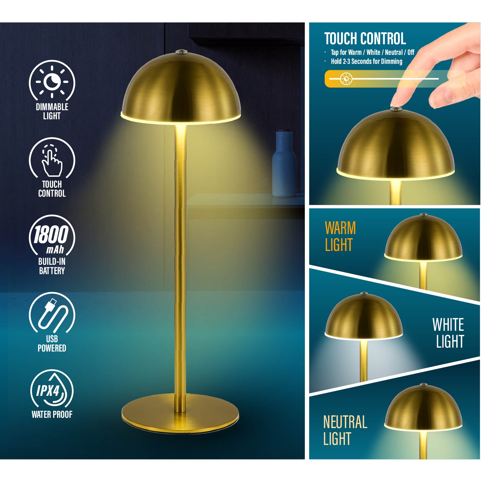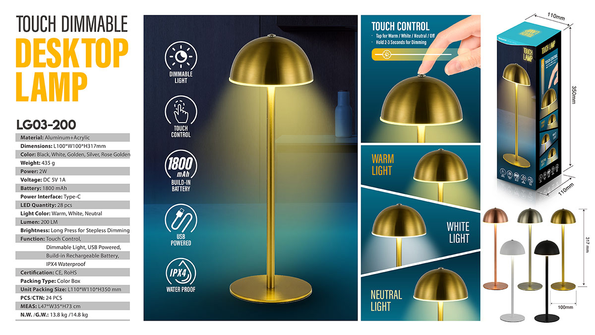 - Function : Touch Control, Dimmable Light, USB Powered, Build-in Rechargeable Battery, IPX4 Waterproof