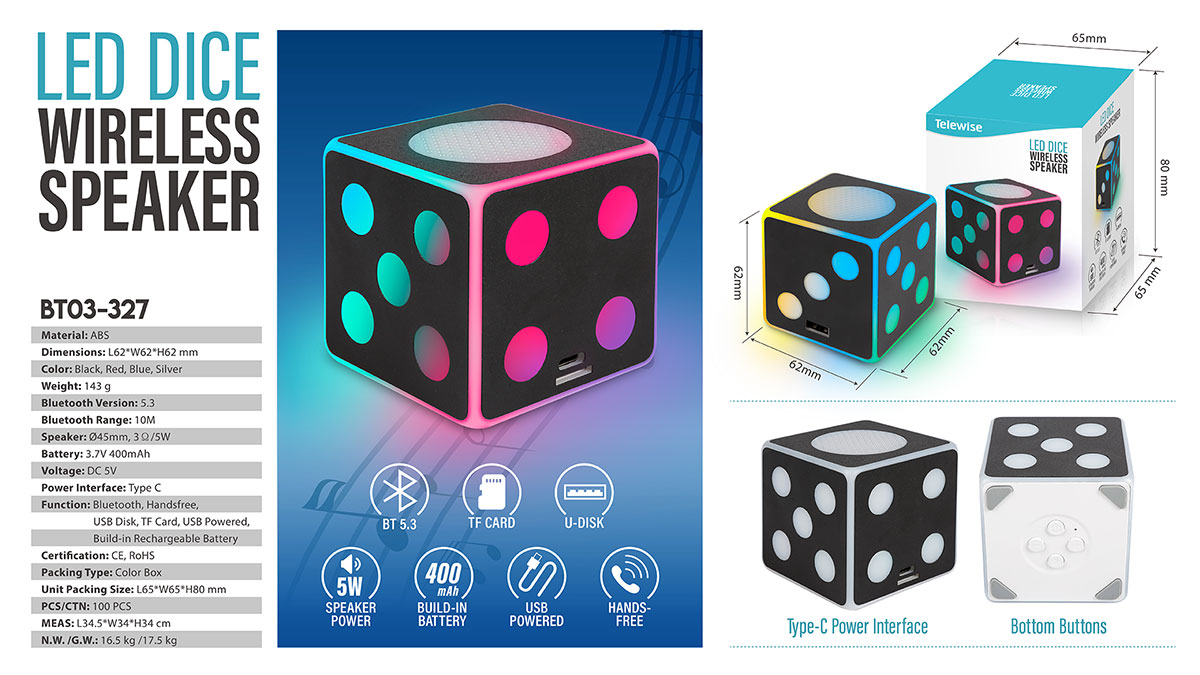 Function: Bluetooth, USB Disk, TF Card, Handsfree, USB Powered, Build-in Rechargeable Battery