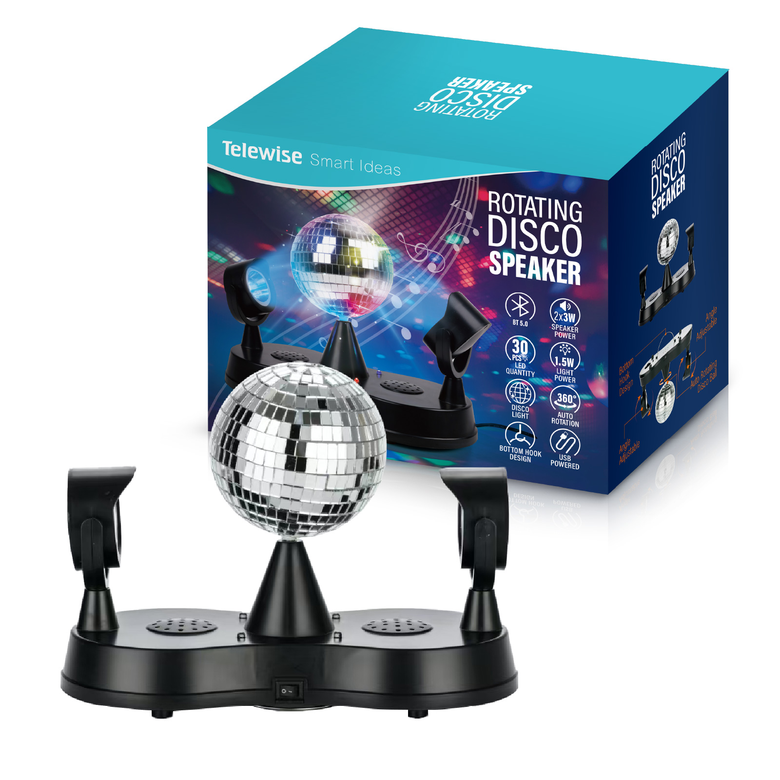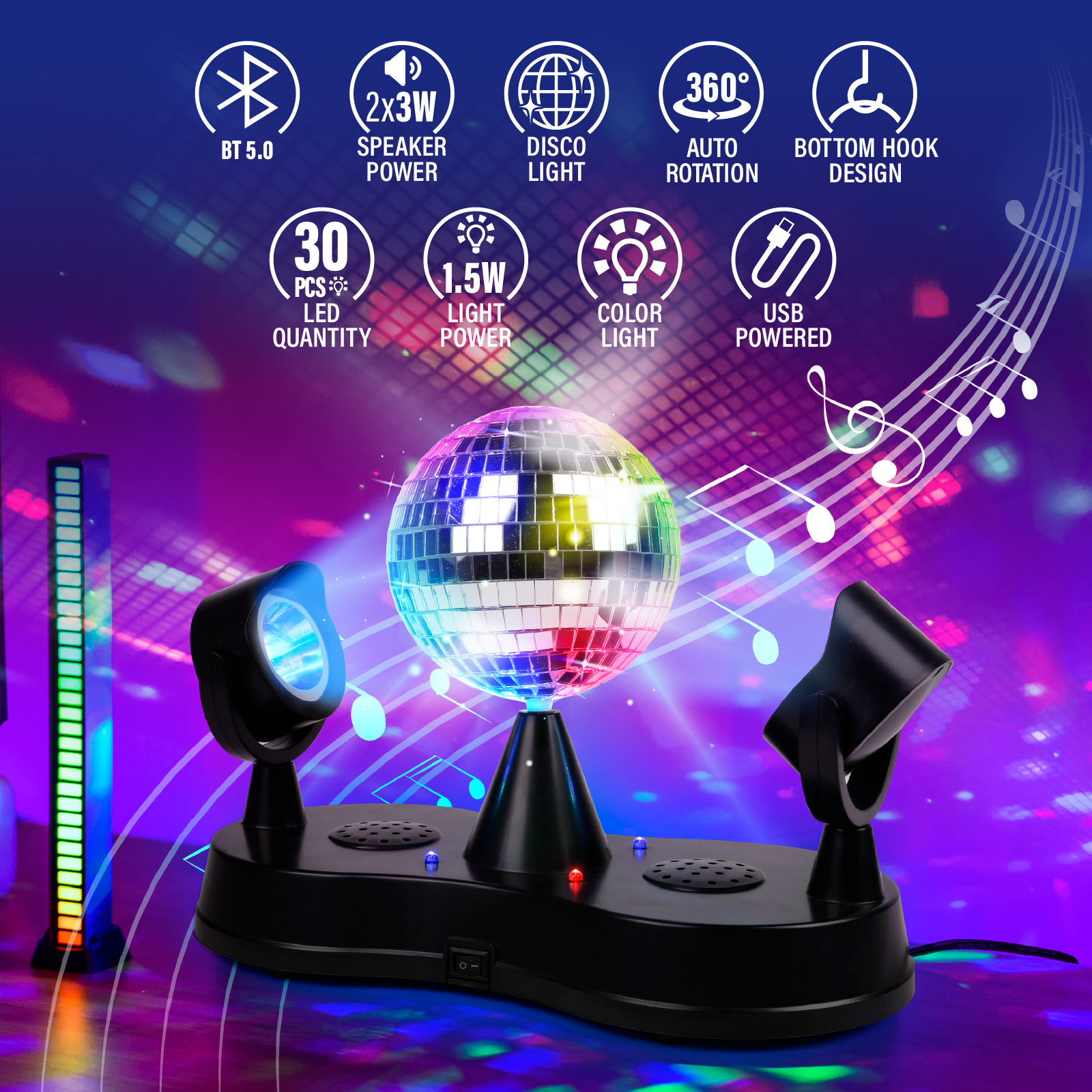 BT03-329Our amazing DISCO ball light! It can rotate on its own and project gorgeous ambient light rays, creating a lively atmosphere. Available in two versions: one with a Bluetooth speaker for a dual audio-visual treat, and the other as a pure ambient light. Either way, it's bound to light up your parties and bring you a wonderful experience!