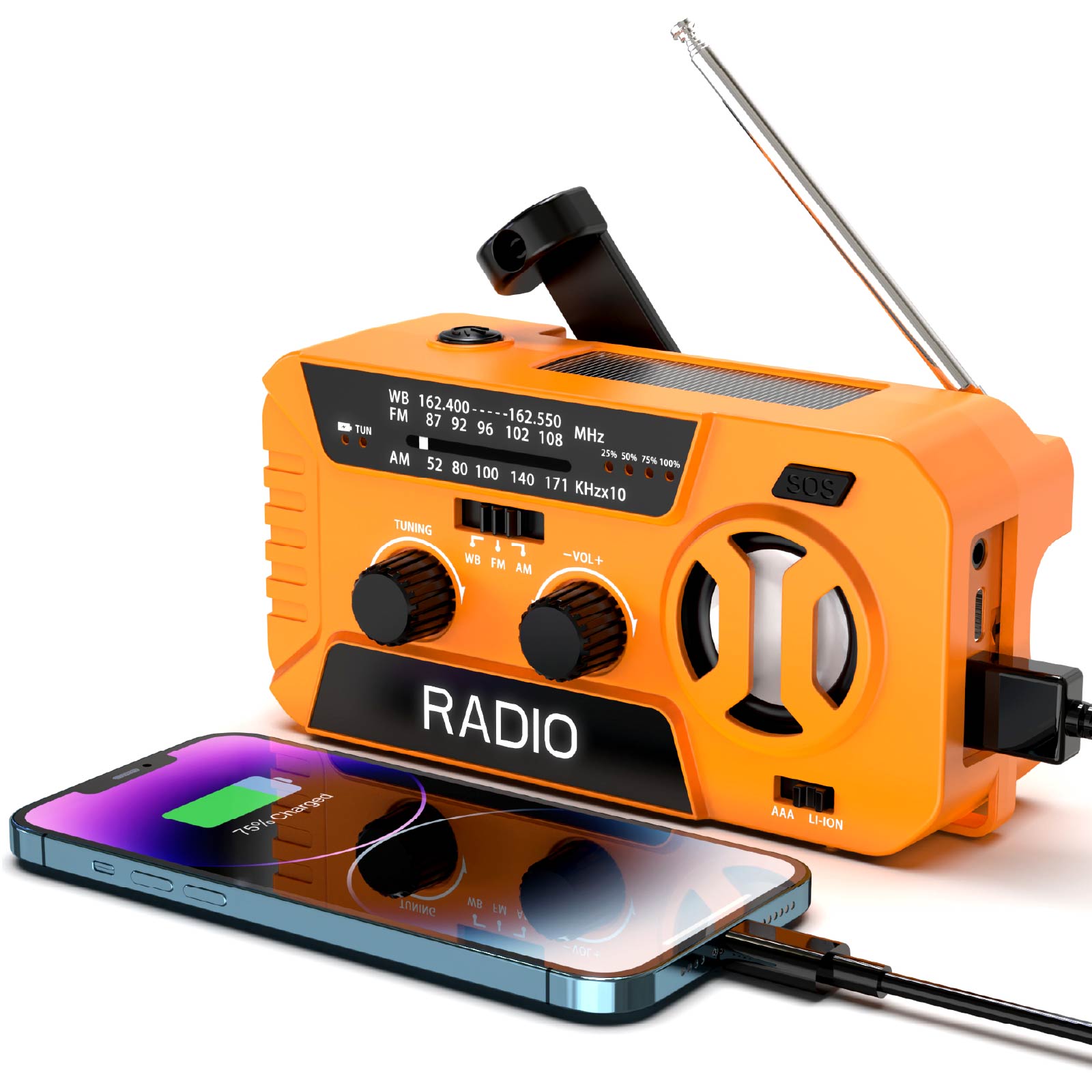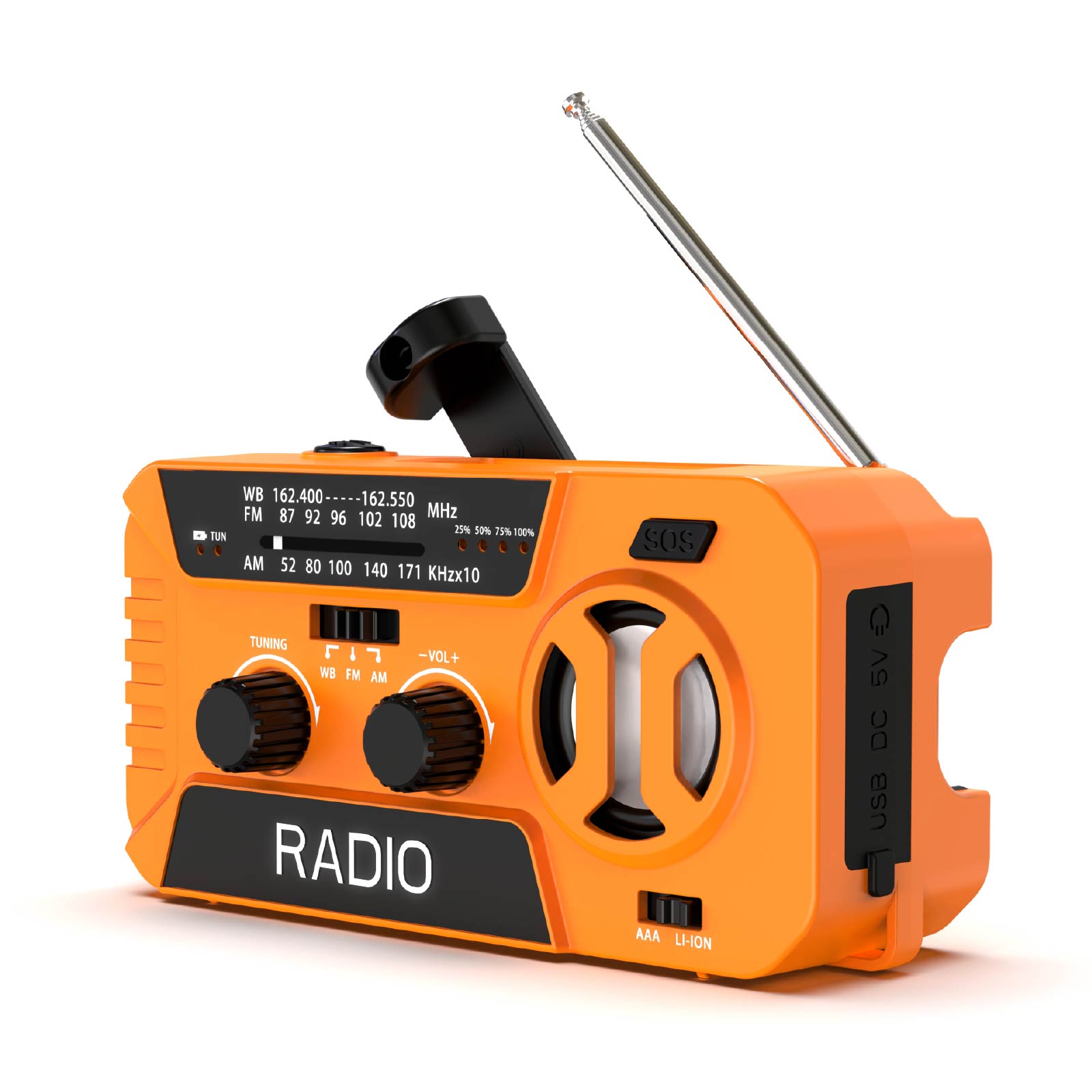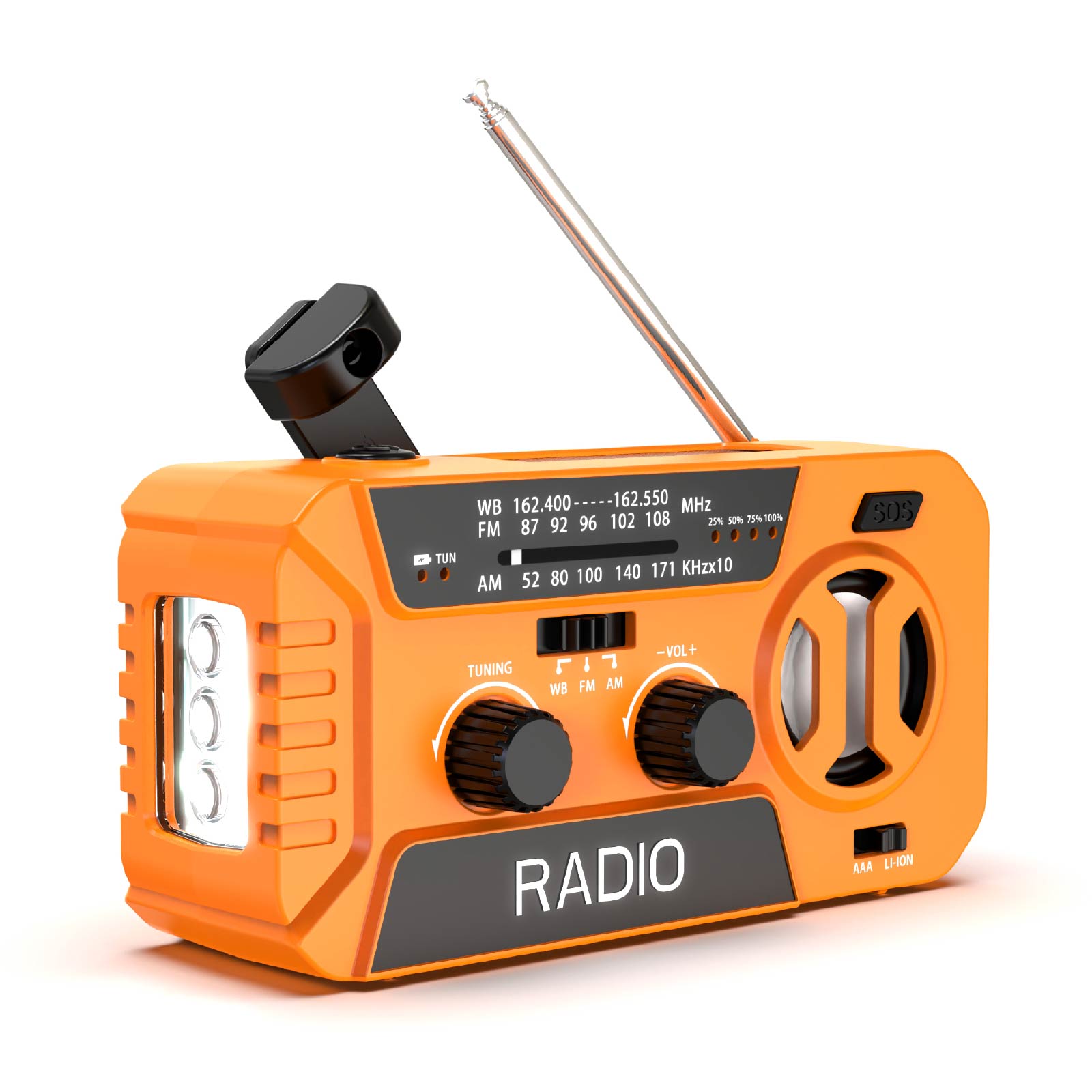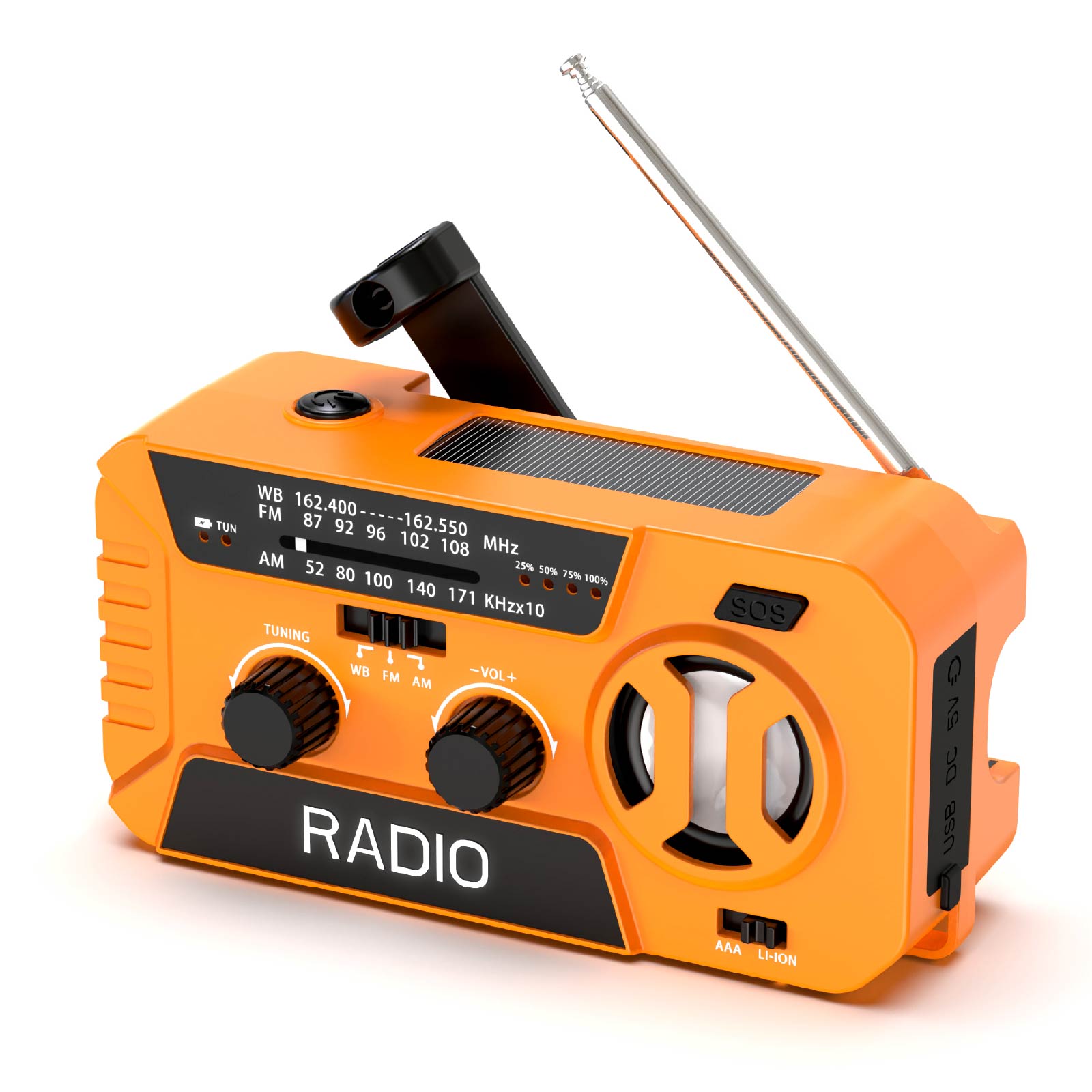RA01-001It's an emergency radio equipped with solar power, supports NOAA/AM/FM weather radio functions. With Solar Charging, Hand Crank Charging, USB Charging, Power Bank. It also features a flashlight, an LED reading light, an SOS alarm, and so on. A must-have for various outdoor and emergency situations!