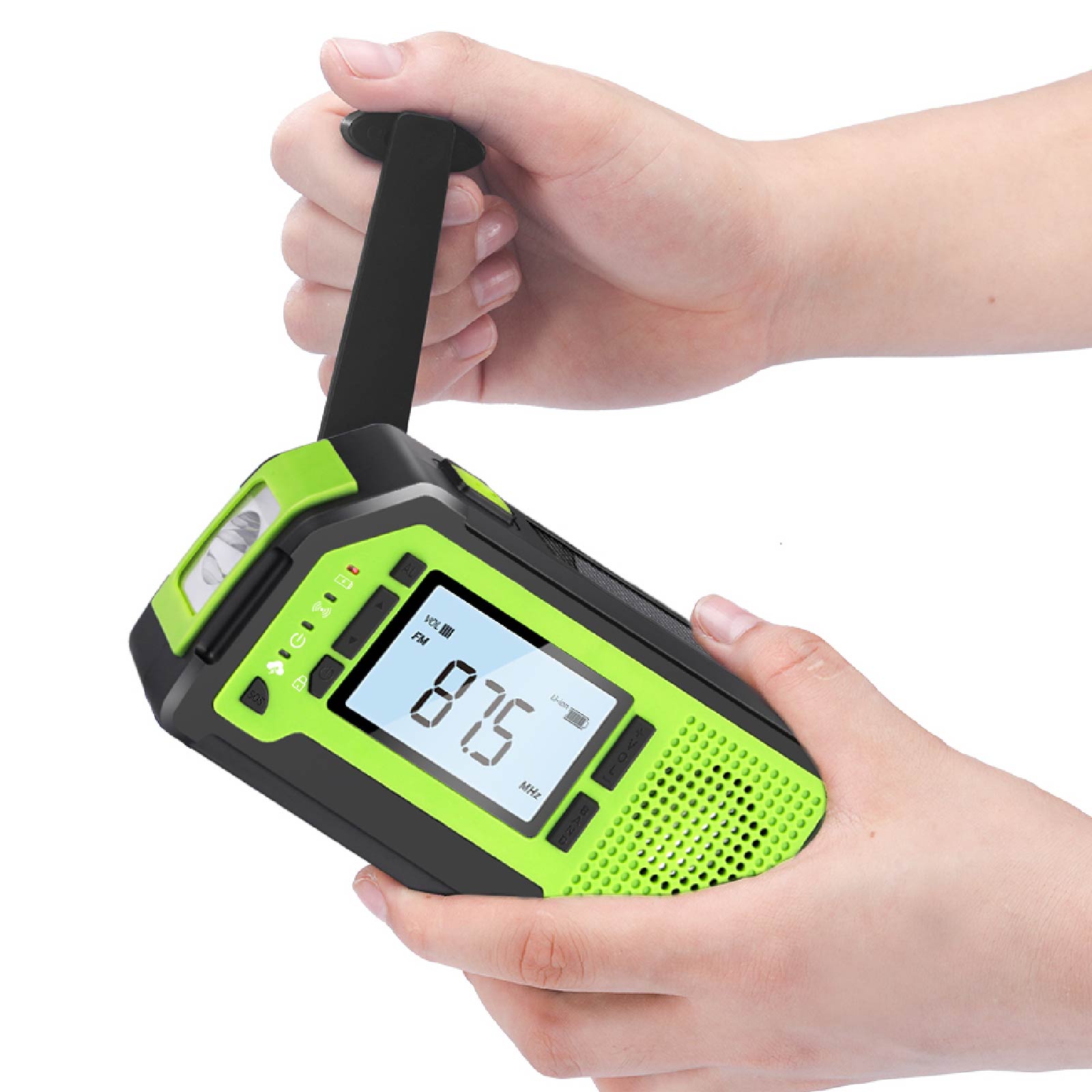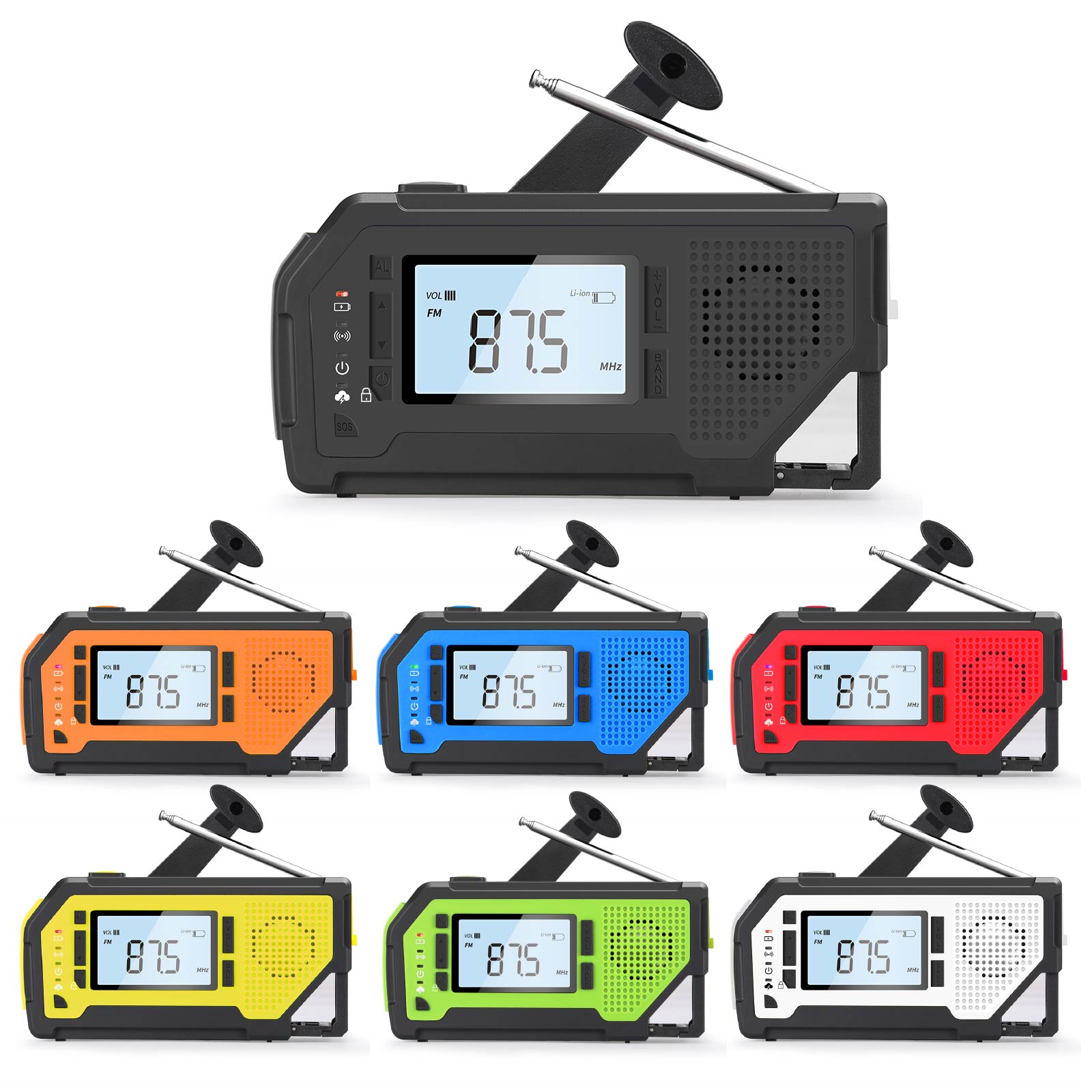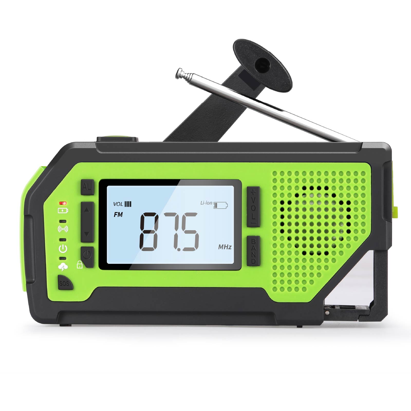 - Functions : AM/FM/WB Radio(WB is only for US), NOAA weather band(Only for US), LED Torch, Corkscrew, SOS Alarm, Earphone Jack, Big LCD screen, Power Bank, Solar Charging, Hand Crank Charging, USB Charging, Battery Powered (3 AAA Batteries, Not Included)