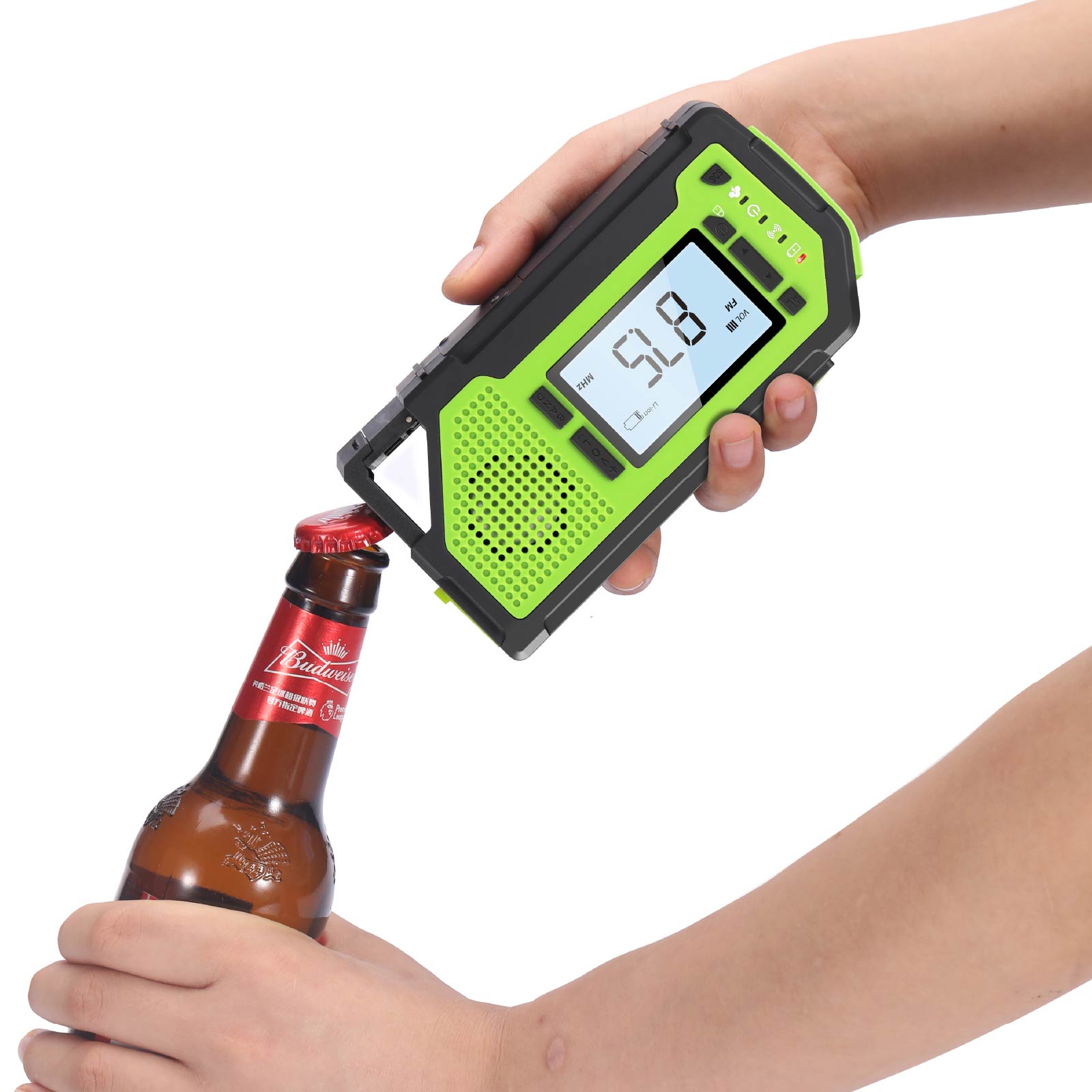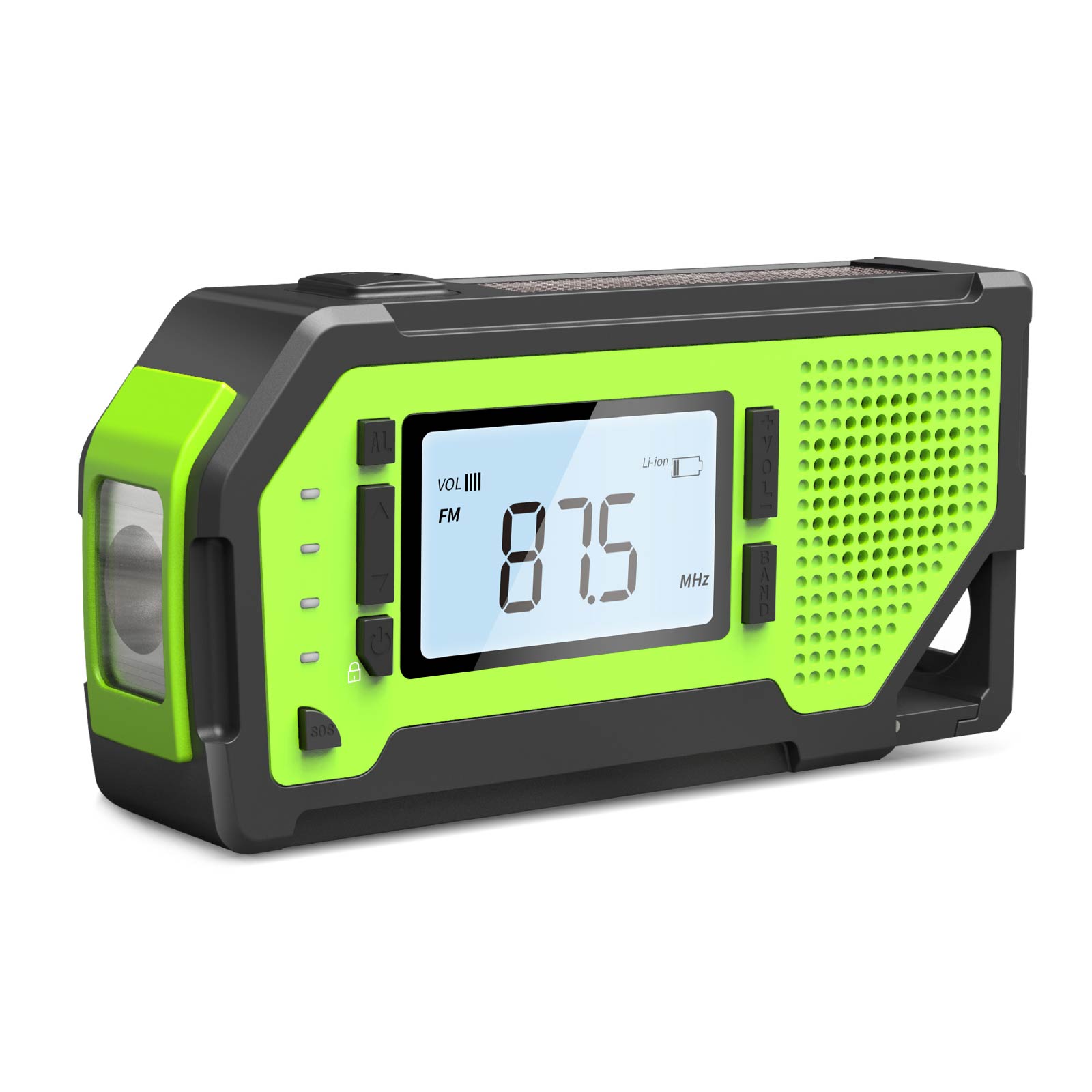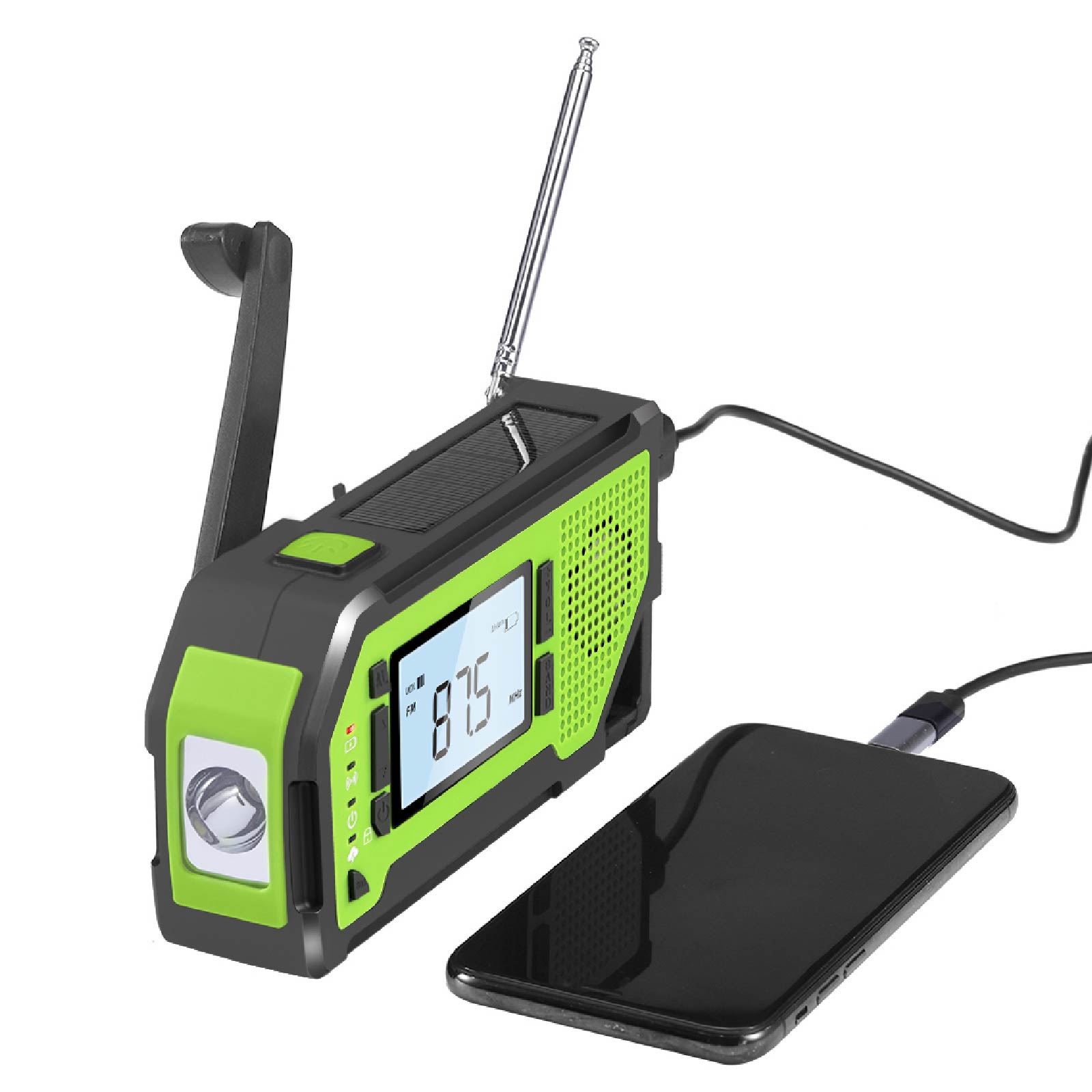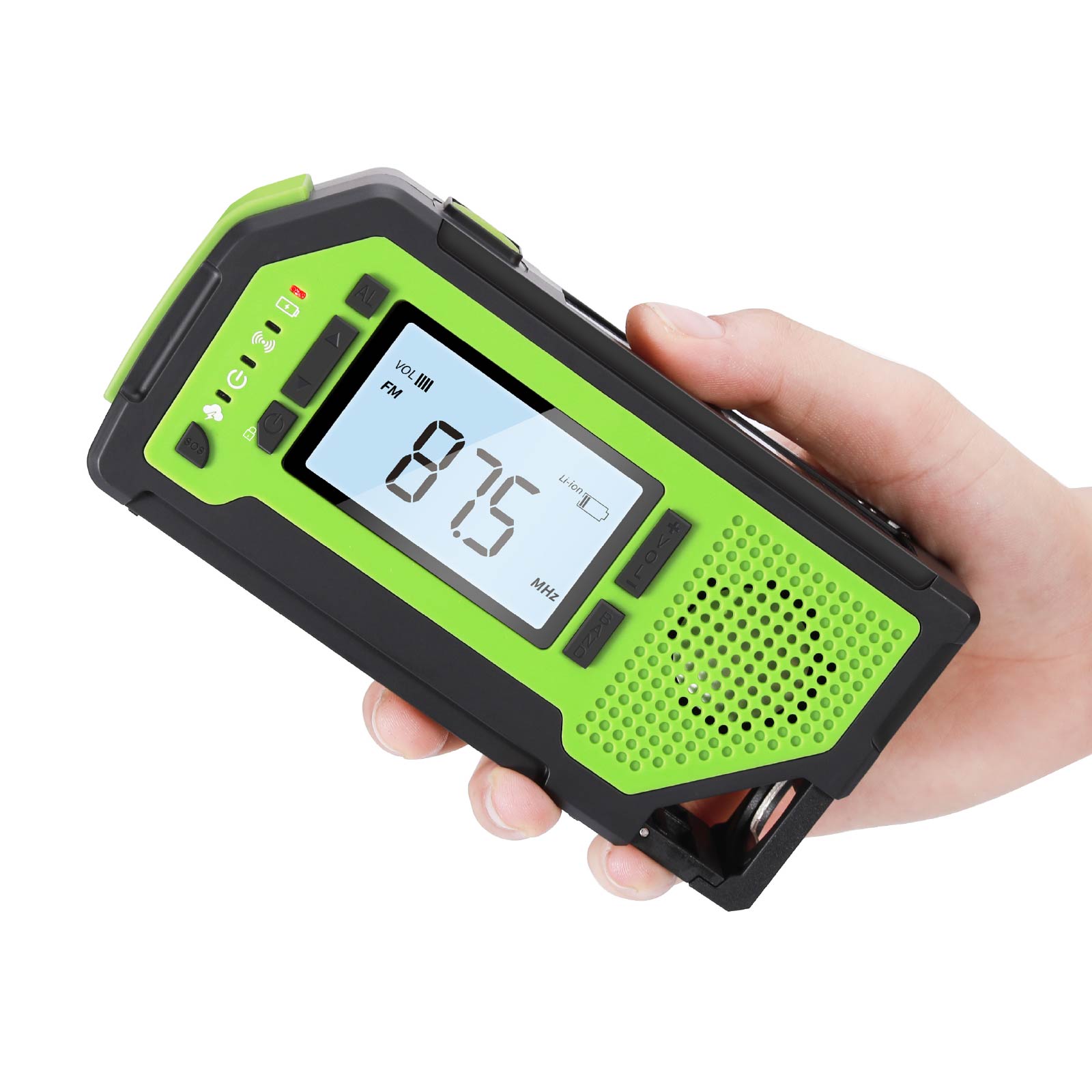 - Functions : AM/FM/WB Radio(WB is only for US), NOAA weather band(Only for US), LED Torch, Corkscrew, SOS Alarm, Earphone Jack, Big LCD screen, Power Bank, Solar Charging, Hand Crank Charging, USB Charging, Battery Powered (3 AAA Batteries, Not Included)