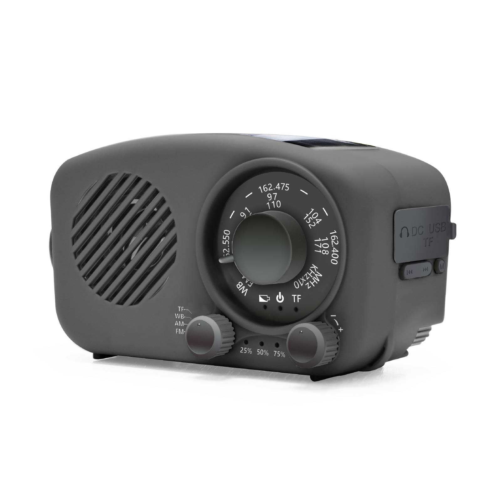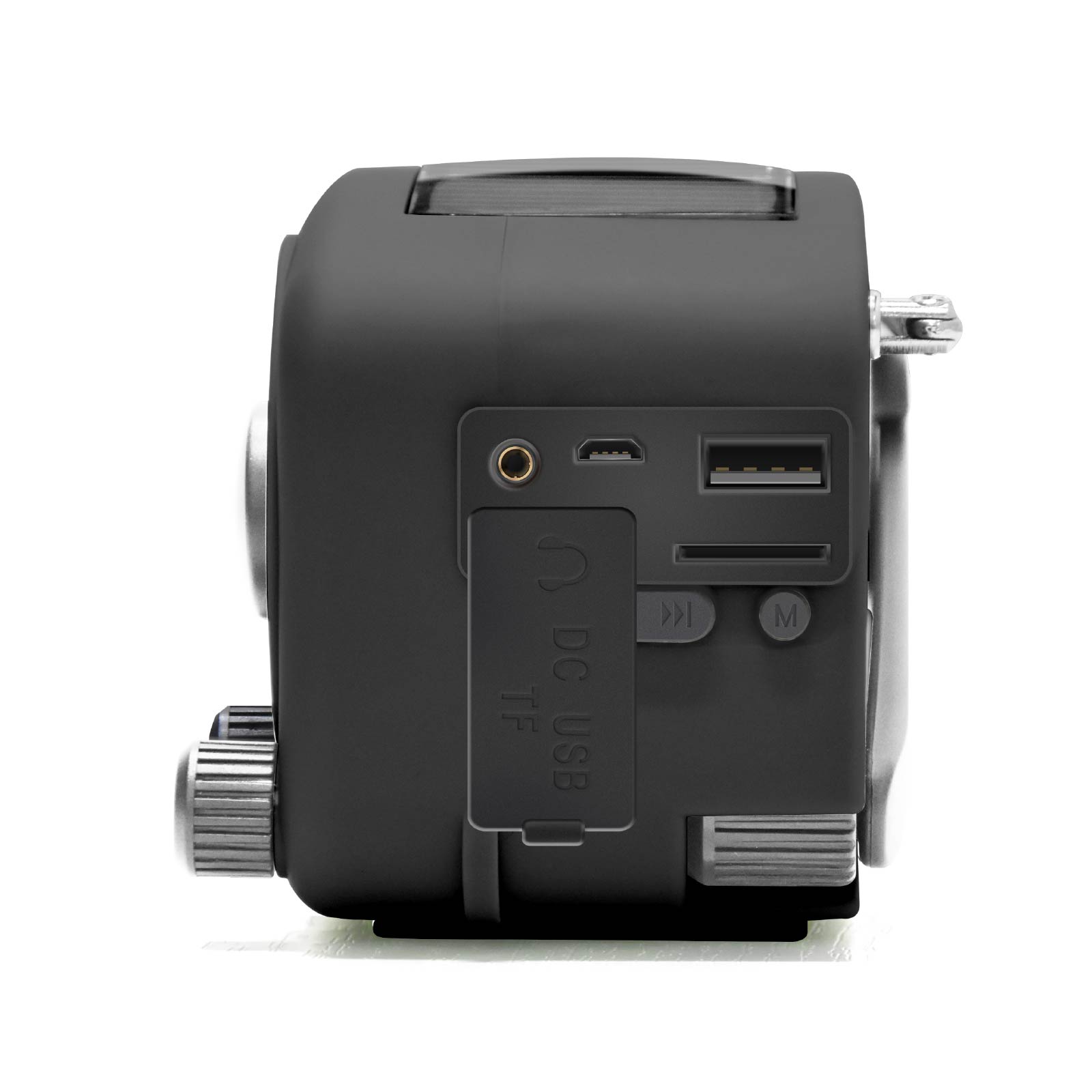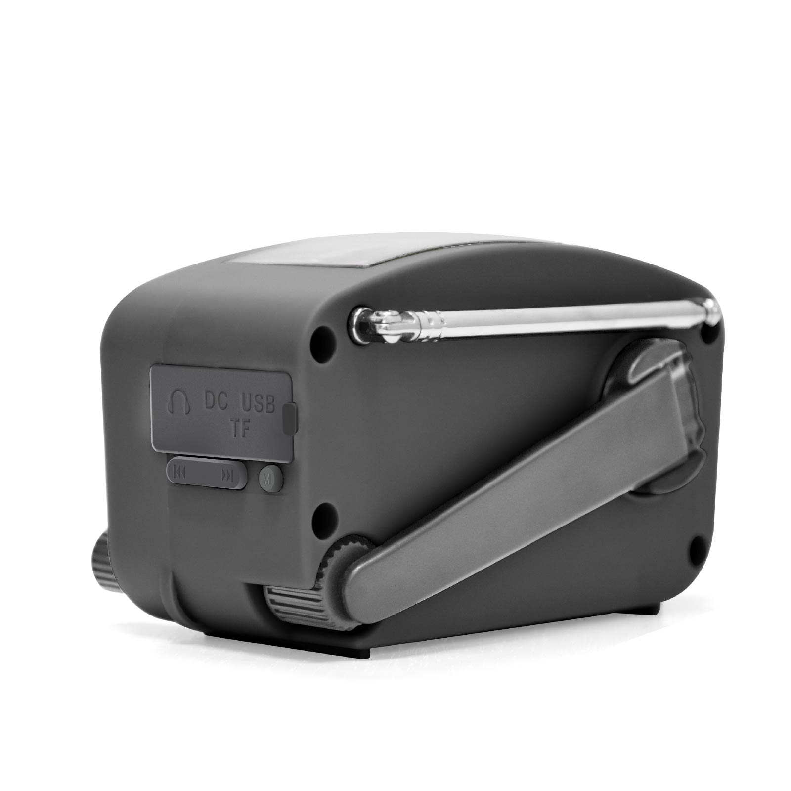 - Functions : Bluetooth Speaker, AM/FM/WB Radio(WB is only for US), TF Card Slot, LED Torch, SOS Alarm, Earphone Jack, Power Bank, Solar Charging, Hand Crank Charging, USB Charging