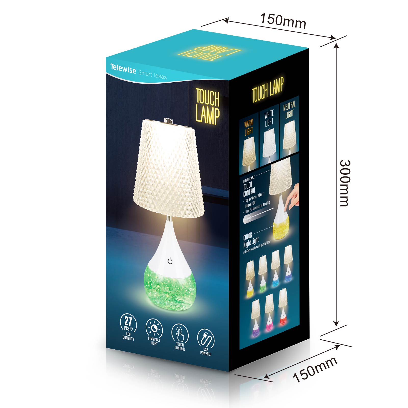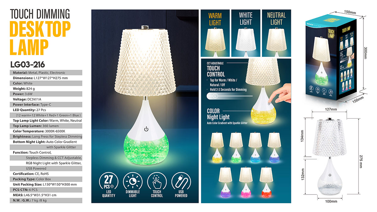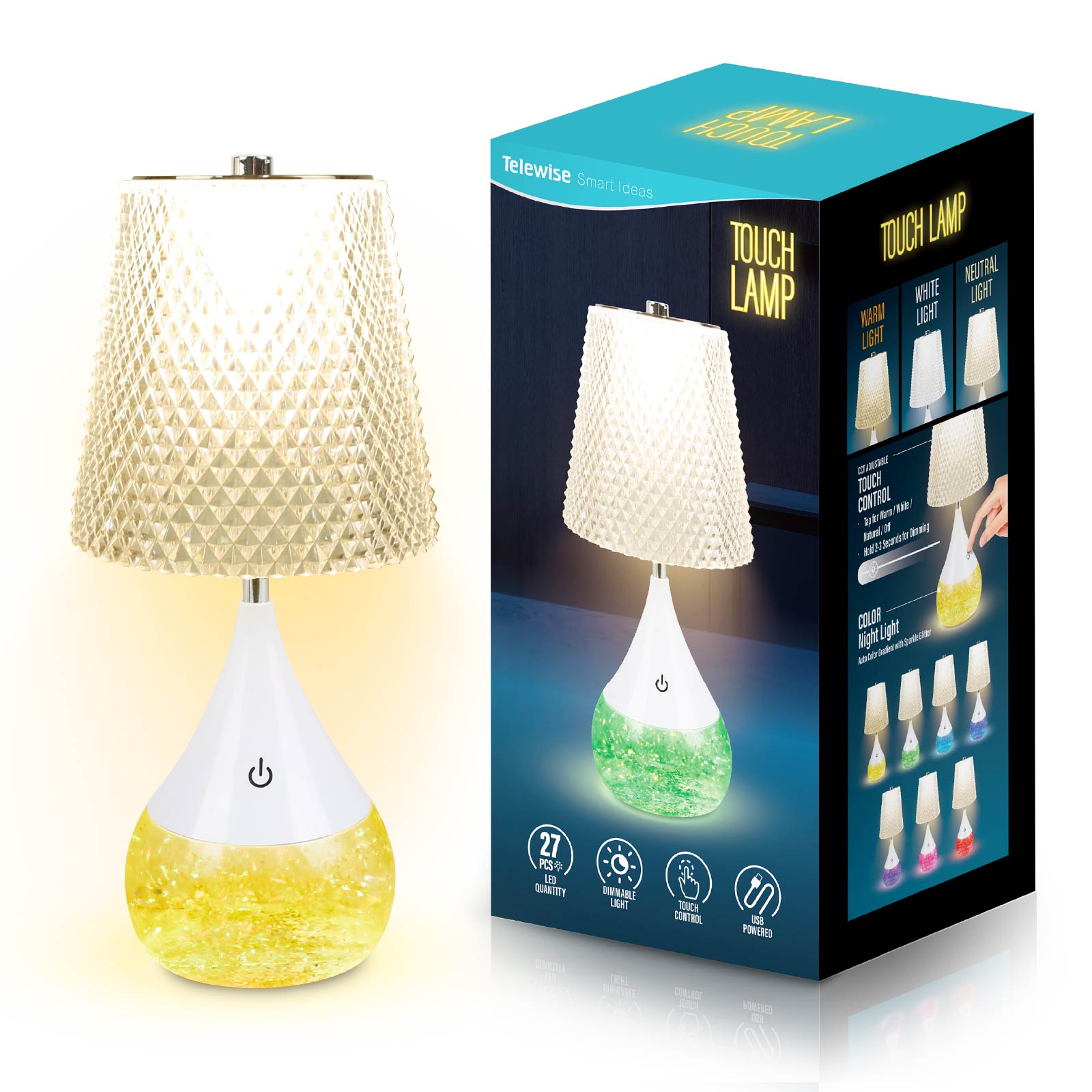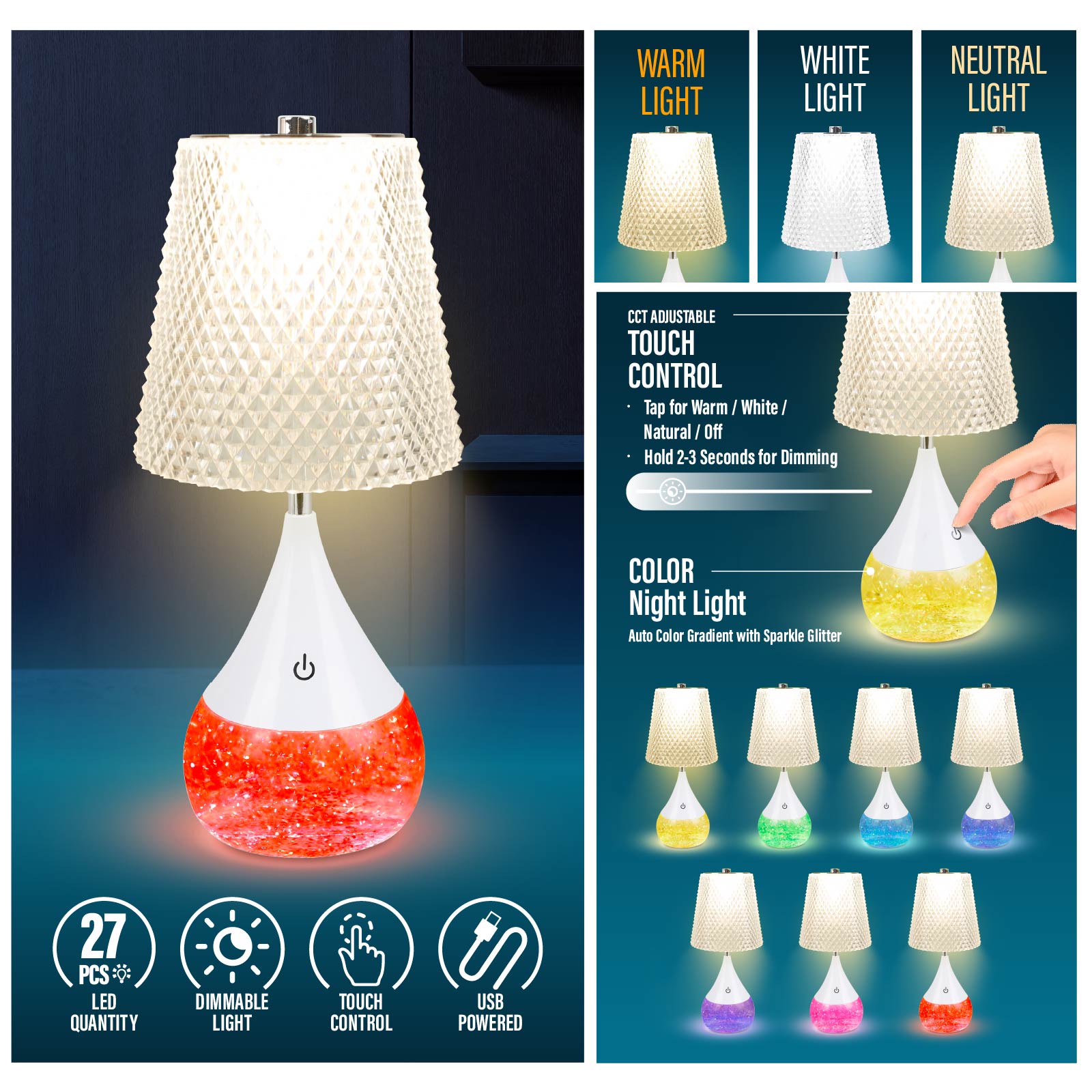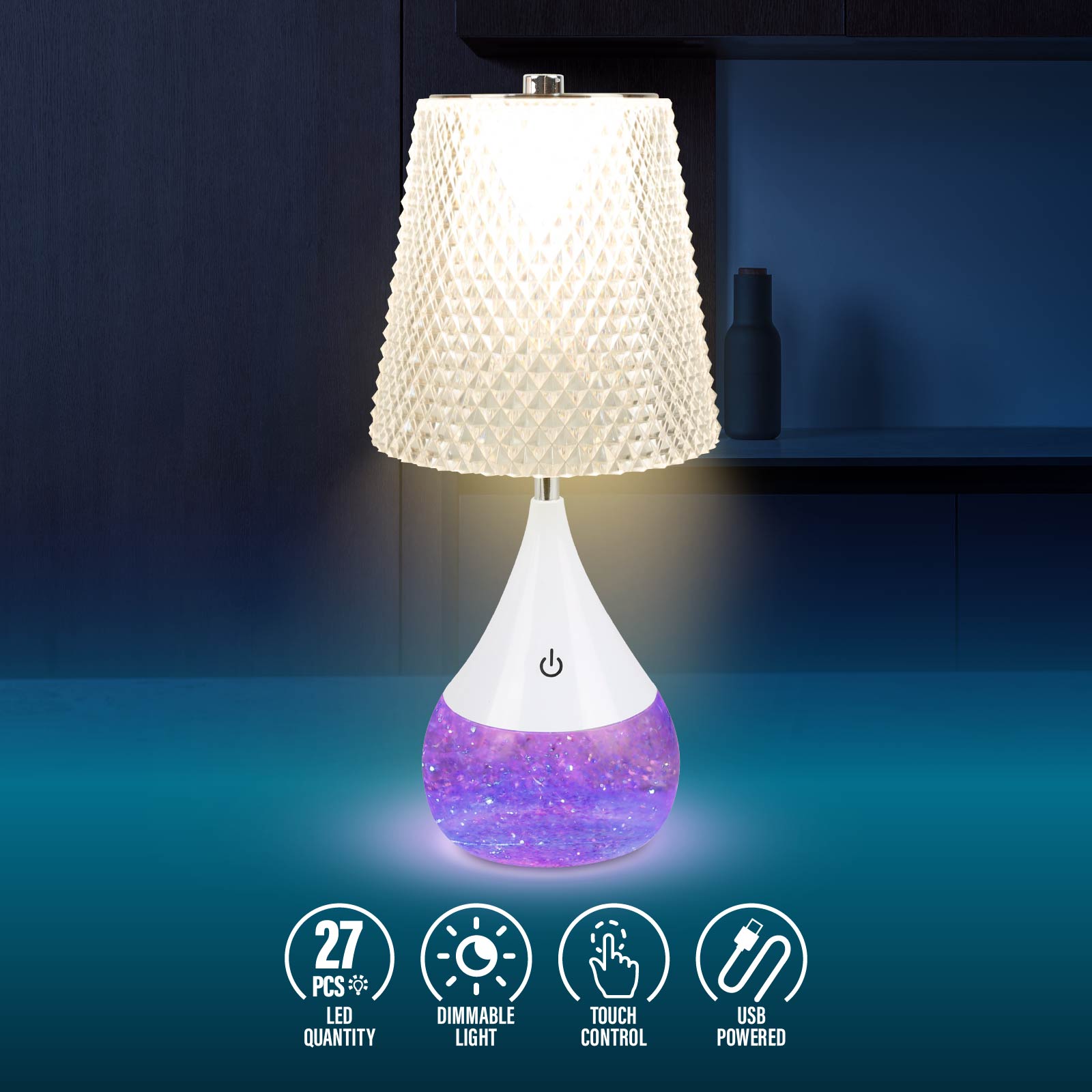 - Function : Touch Control, Stepless Dimming & CCT Adjustable, RGB Night Light with Sparkle Glitter, USB Powered