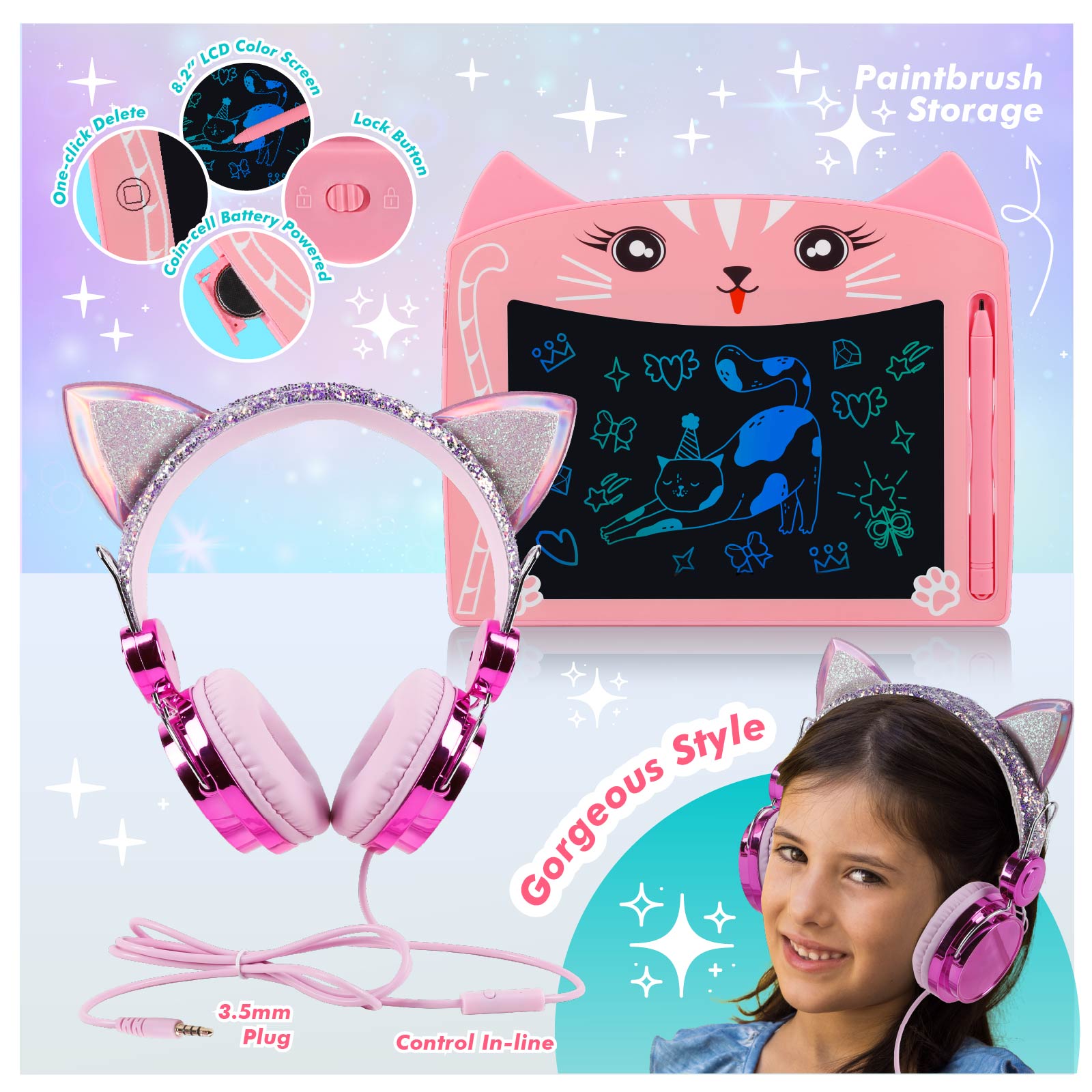 2 In 1 Cat Gift Set ( Wired Headset & LCD Writing Pad)