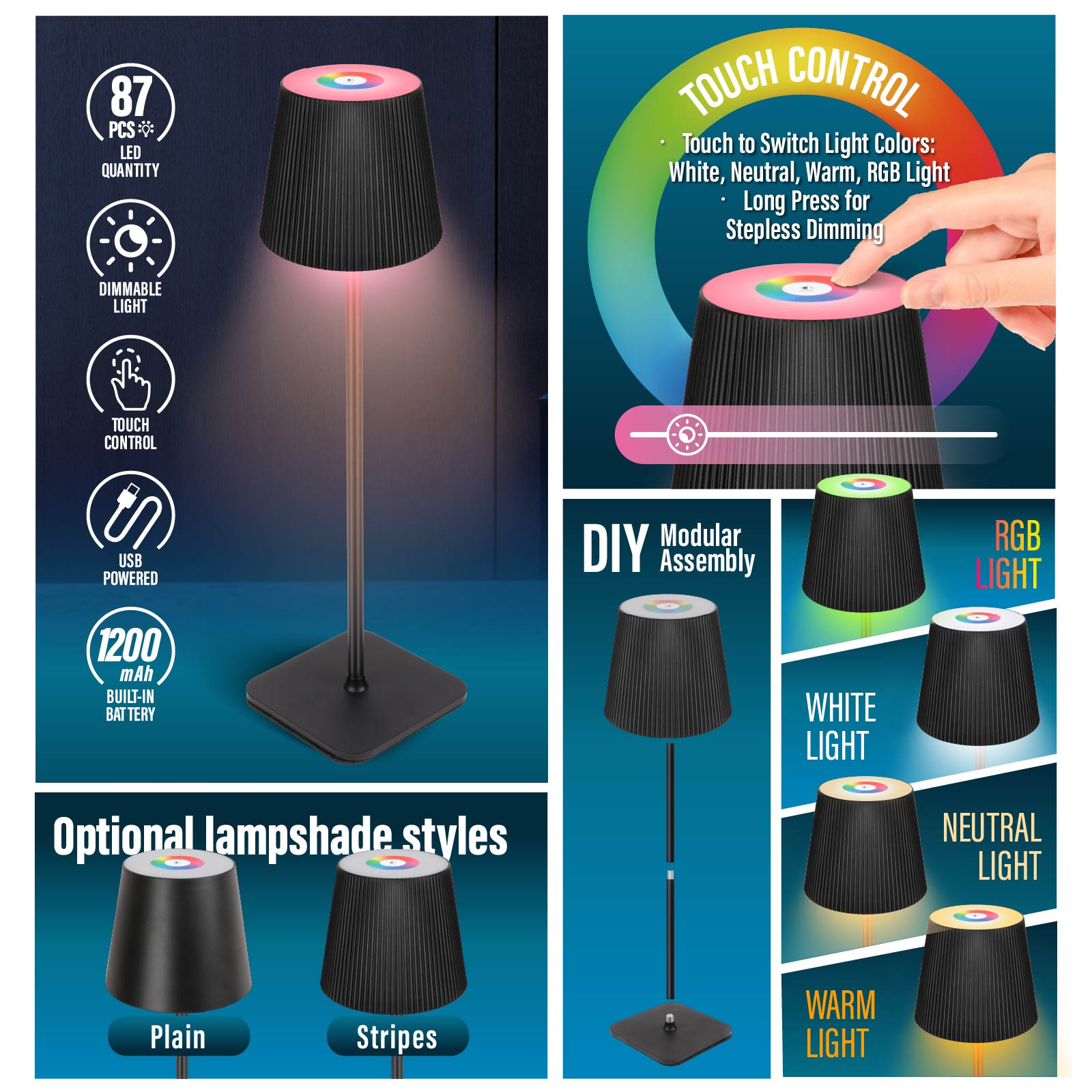 Cordless Dimming RGB LED Touch Lamp