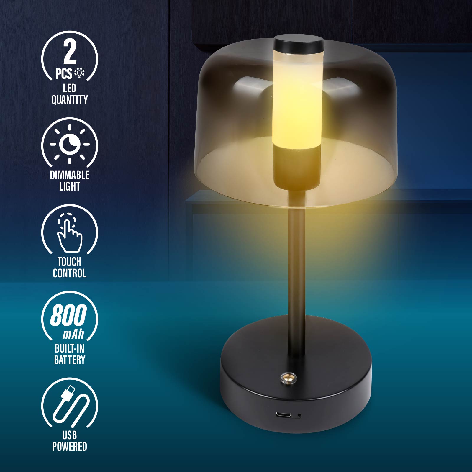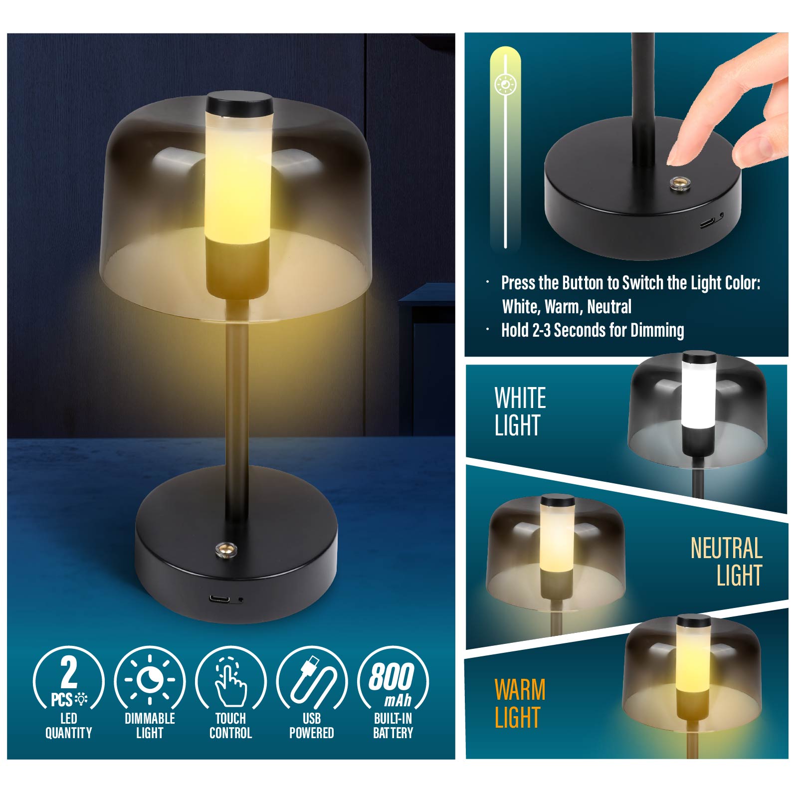 - Function : Light Color Switching, Dimmable Light, USB Powered, Built-in Rechargeable Battery