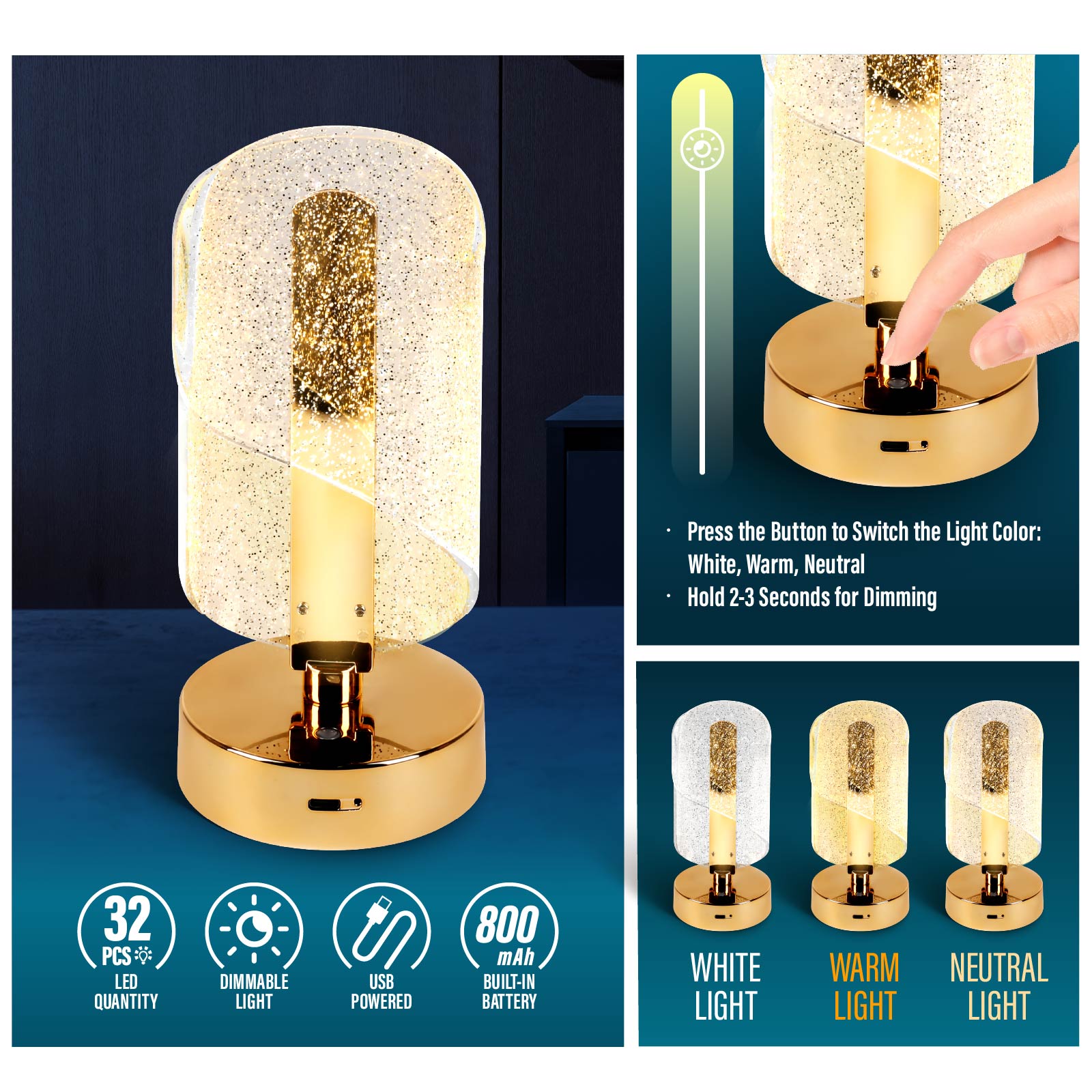 - Function : Light Color Switching, Dimmable Light, USB Powered, Built-in Rechargeable Battery