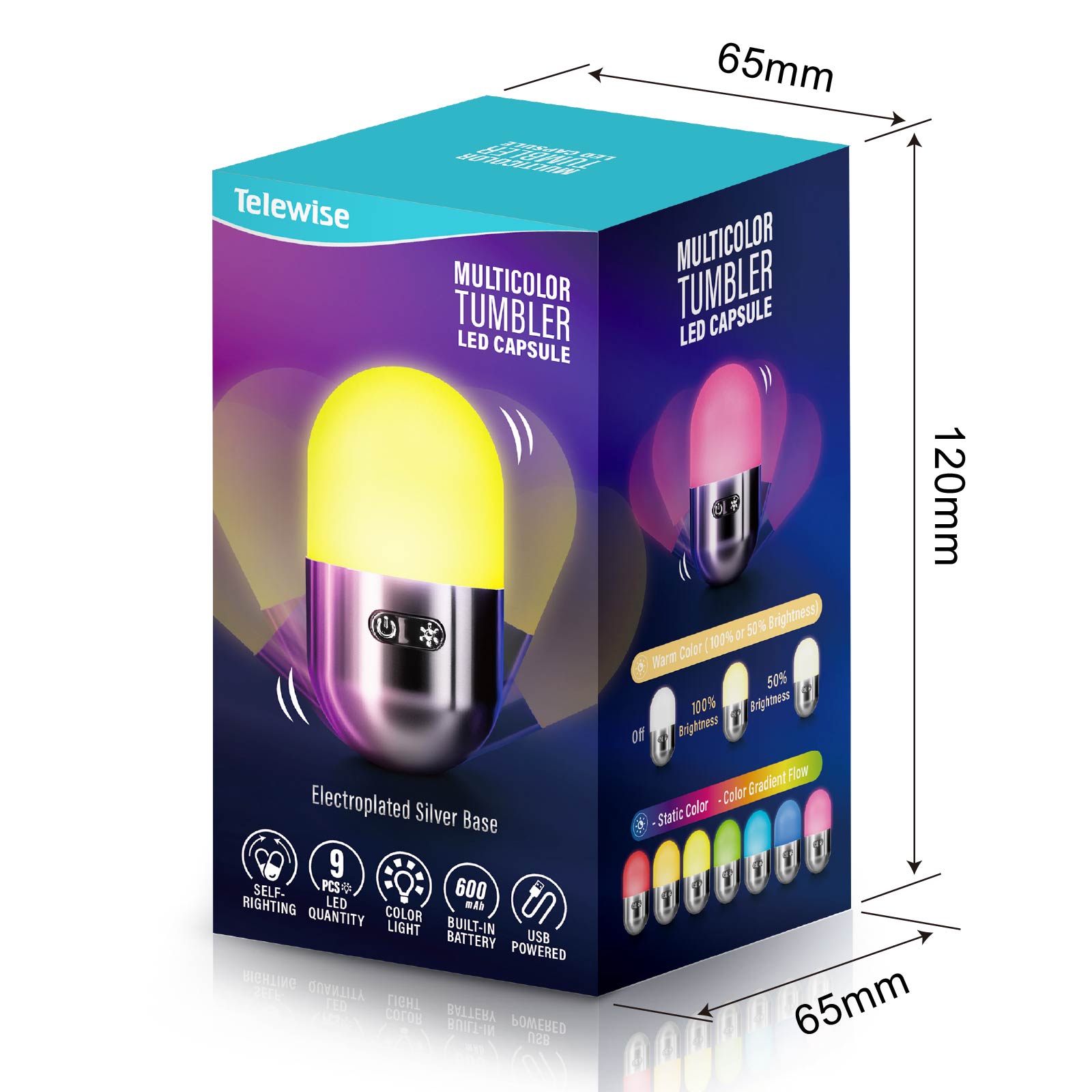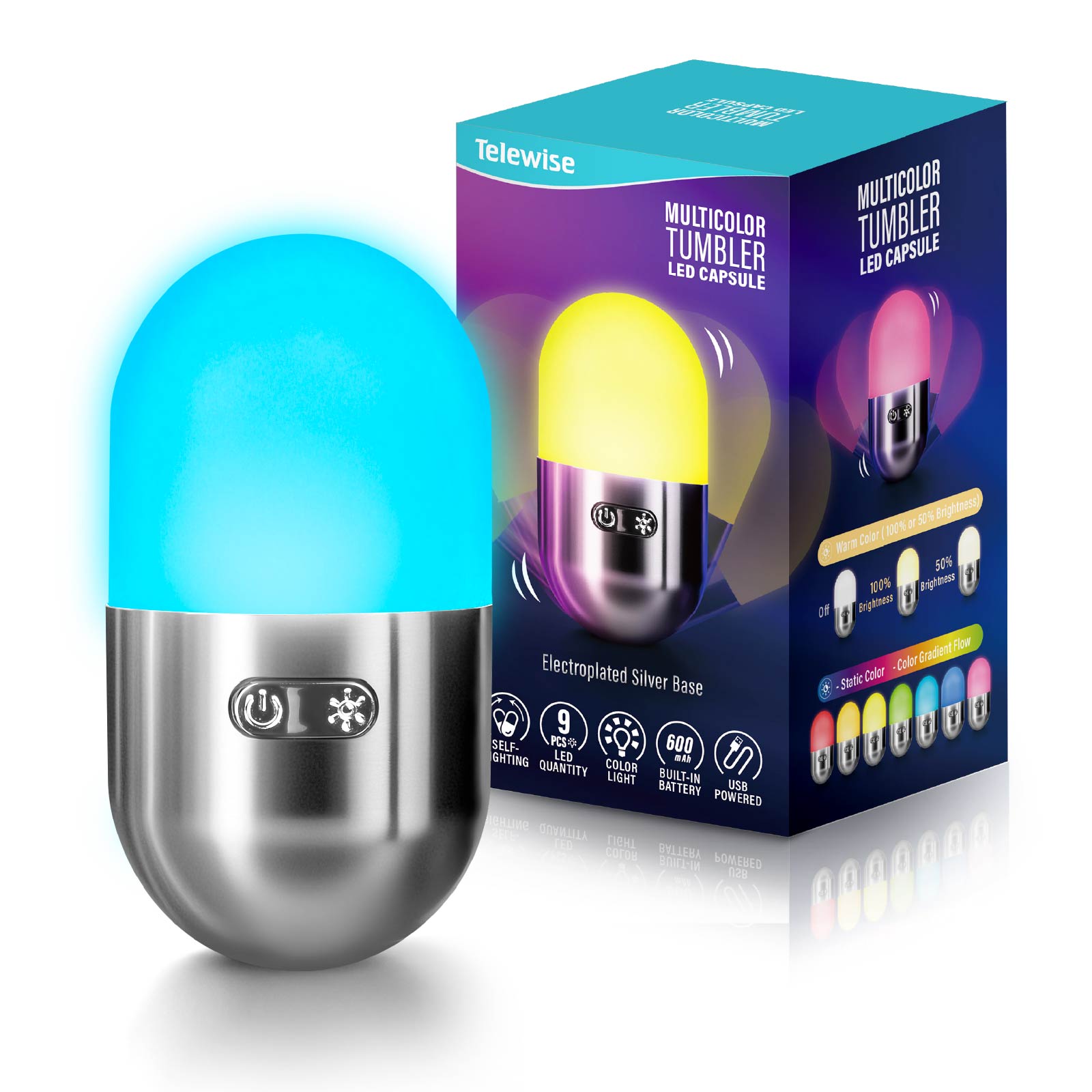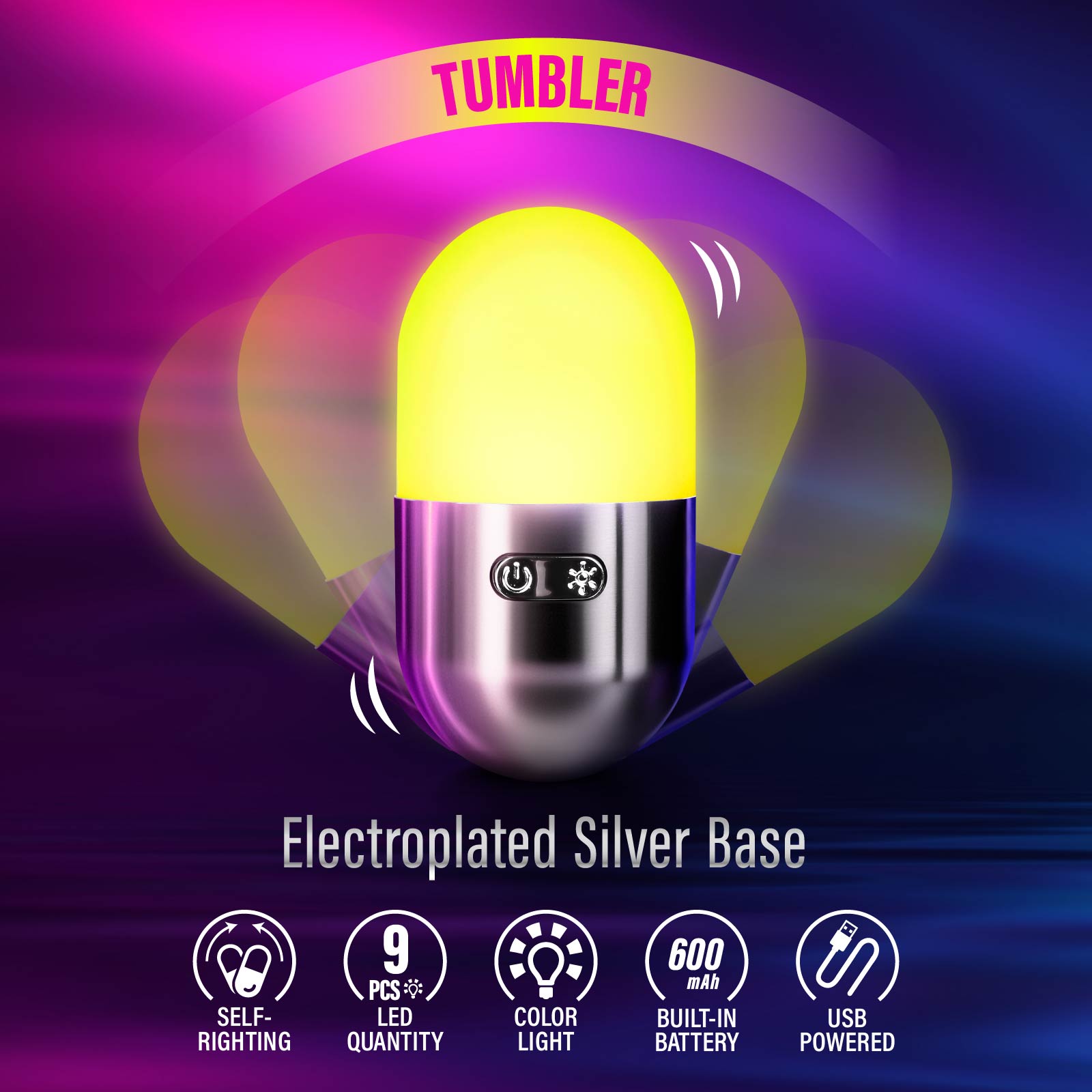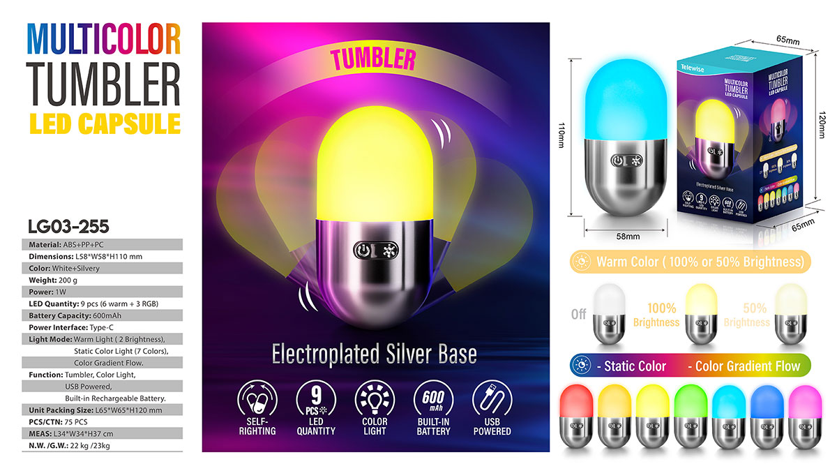LG03-255Check out the Multicolor Tumbler LED Capsule! Crafted in a unique capsule shape with ABS electro - silver plating, its top part is an LED light. Designed as a roly - poly, it remains upright all the time. Effortlessly switch between multiple lighting colors, adding a splash of fun to your days!