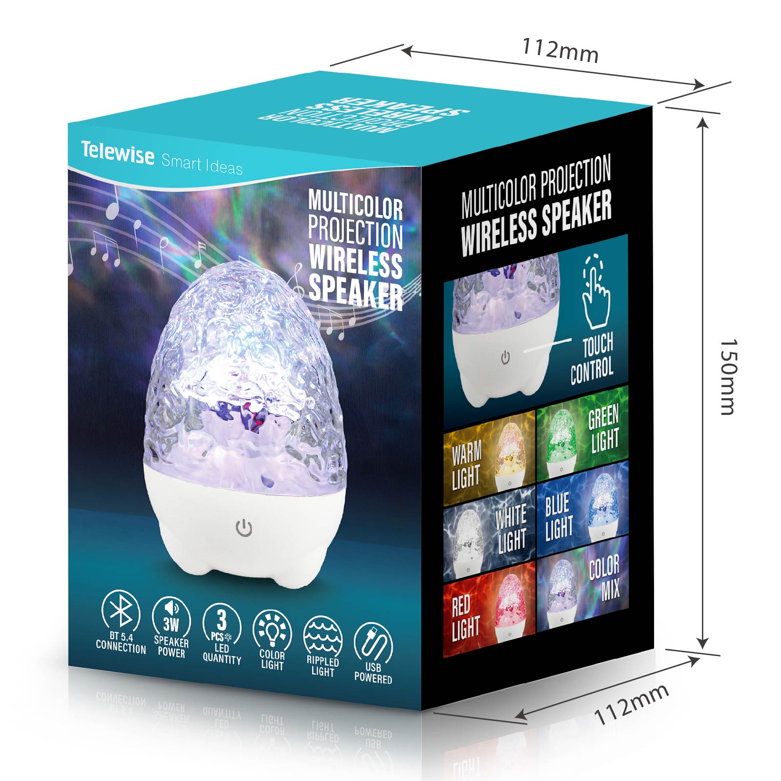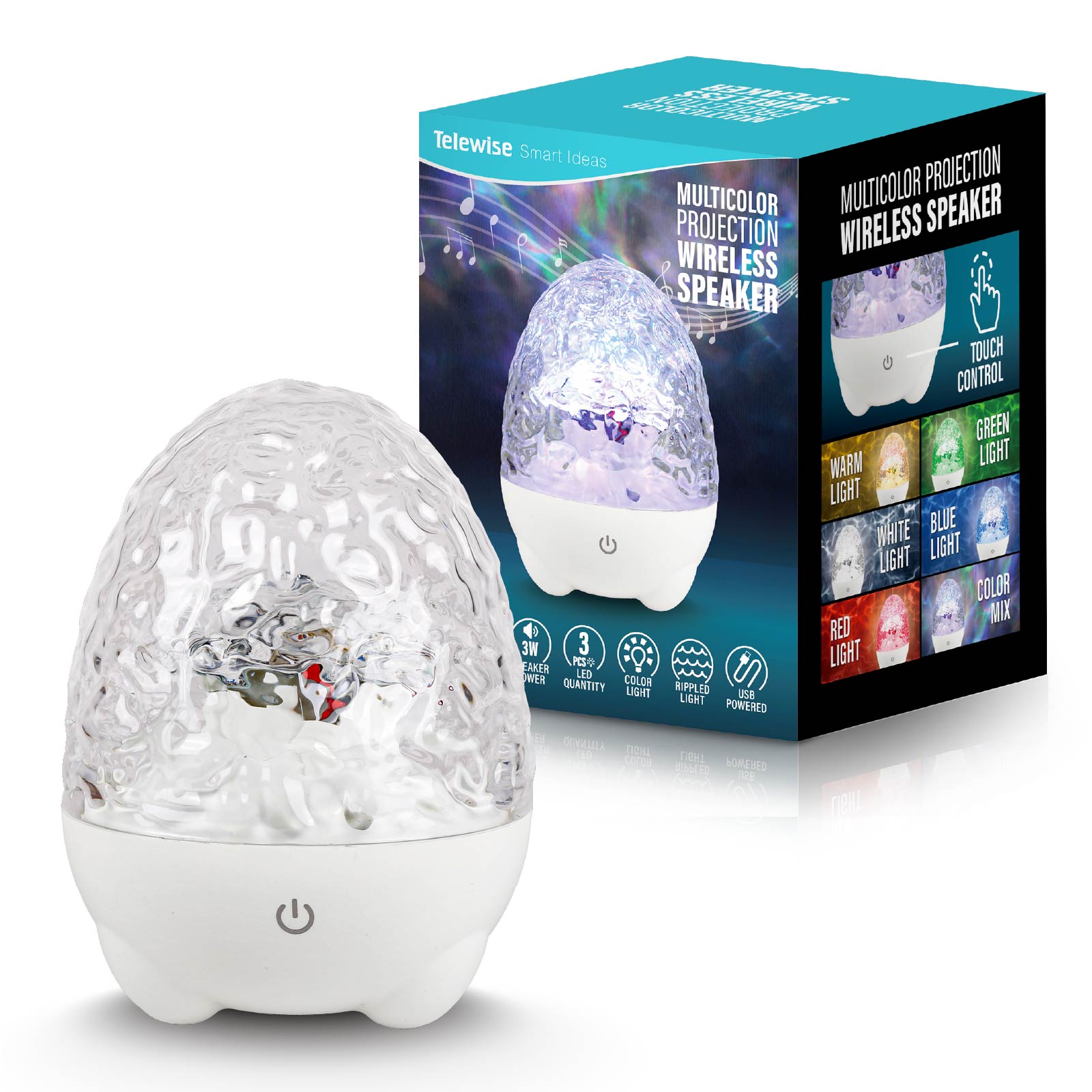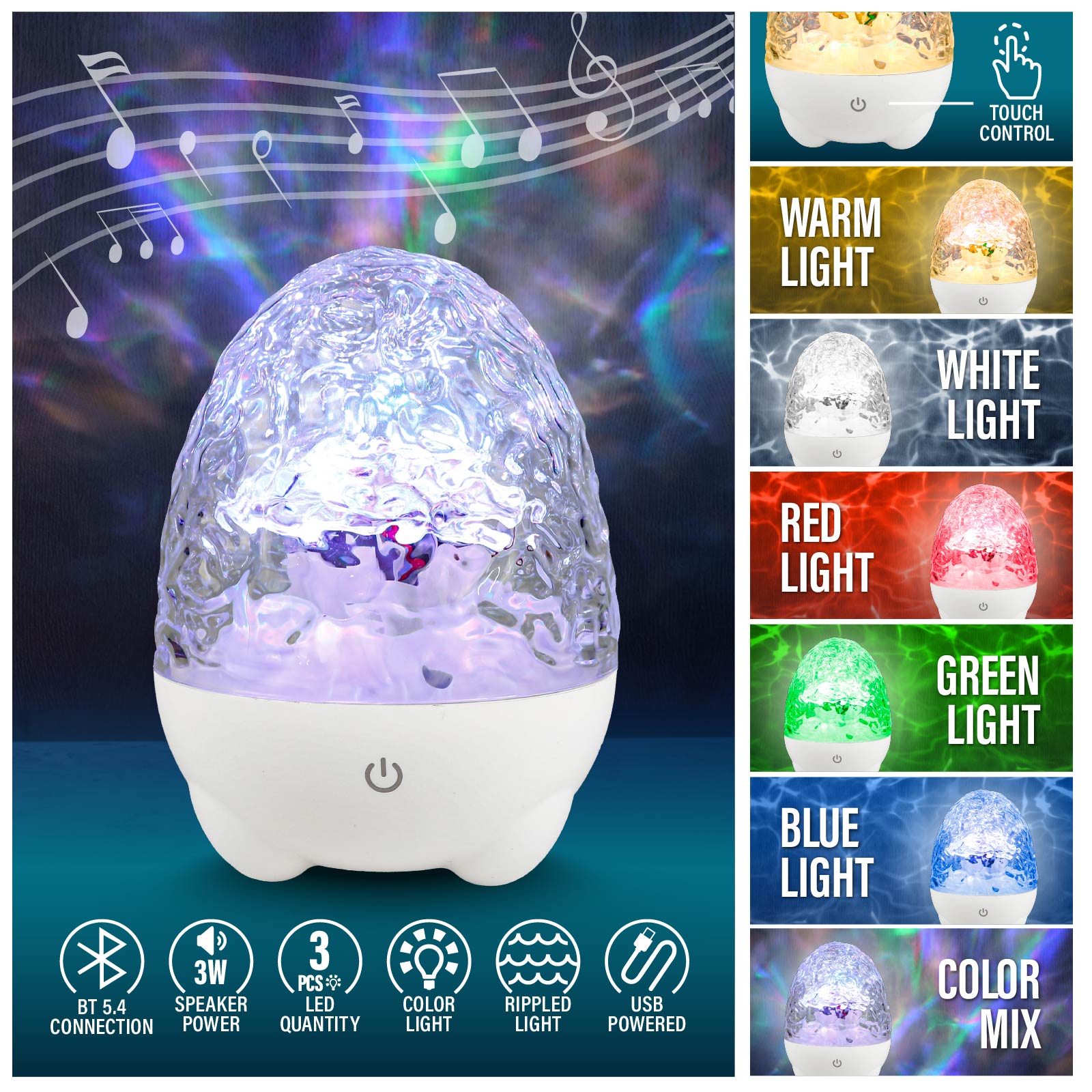 - Function : Bluetooth Speaker, Touch Control, Night Light, Color Projection, USB Powered