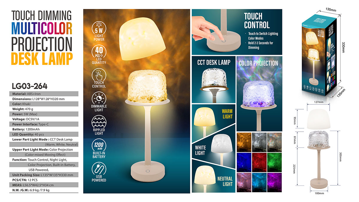 LG03-264Transform your space with our Touch Dimming Multicolor Projection Desk Lamp! Effortlessly adjust brightness and colors at a simple touch. Its multicolor projection feature creates a dreamy atmosphere. Ideal for study, work, or relaxation. Compact and stylish, it's a must - have for any desk. Upgrade your lighting experience now!
