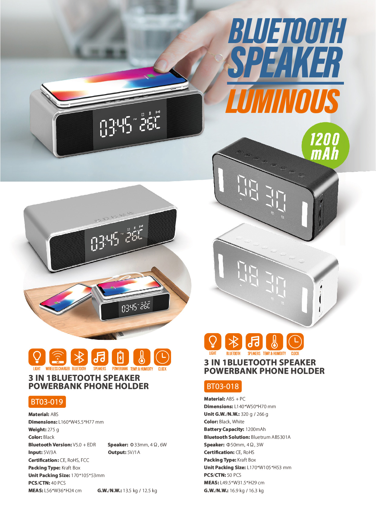 BT03-019Function: Bluetooth Connection, Wireless Charging. Digital Screen with Clock & Temp. & Humidity