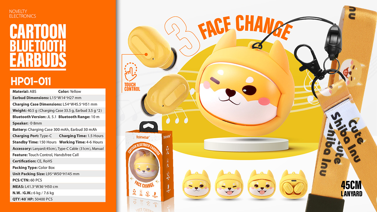 HP01-011A variety of patterns can be flipped at will, fun to decompress. Unique and cute shape, playable and cute. Lossless sound quality, enjoy your music. Sensitive touch buttons. The lanyard is portable and not easy to fall off. Bluetooth earbuds consist of high quality ABS construction that ensures a comfortable tactility. The unique ideas and chic design style of this true wireless earbuds, all brings surprises and unexpected experiences.
