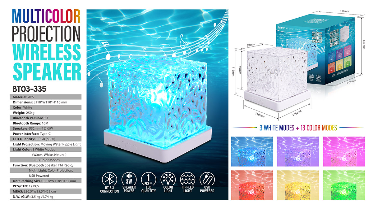 BT03-335Meet our Multicolor Projection Wireless Speaker. Effortlessly connect via Bluetooth. Its unique multicolor projections bring any space to life, while also serving as a soothing night light. With touch - control convenience and USB power, it's the perfect blend of style and functionality. Let the music and colors enchant you!