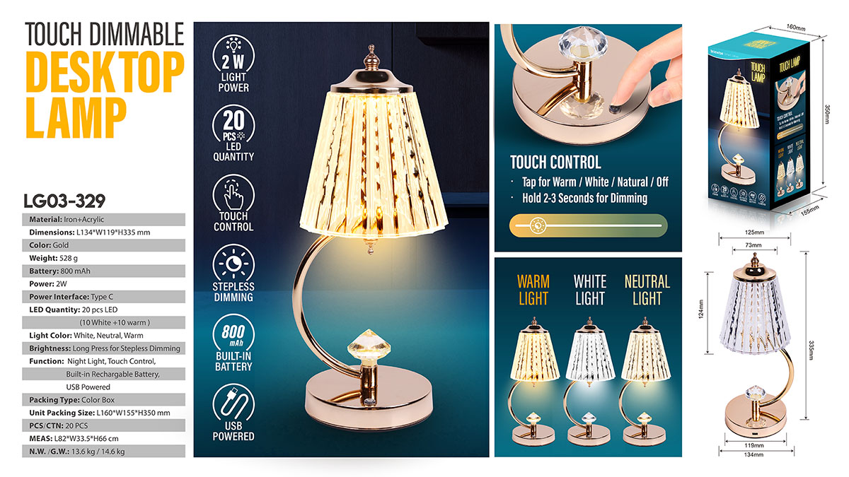 LG03-329Illuminate your space with elegance and versatility! Our lamp features a sleek acrylic lampshade that softly diffuses light, paired with a luxurious gold-finished lamp post for a touch of sophistication. Effortlessly switch between three stunning color temperatures and adjust the brightness to your desired level with a simple touch—thanks to its stepless dimming function. Plus, with a built-in battery, you can enjoy cord-free lighting anywhere, anytime. Whether it’s for ambient mood setting or focused task lighting, this lamp is the perfect blend of style and functionality.