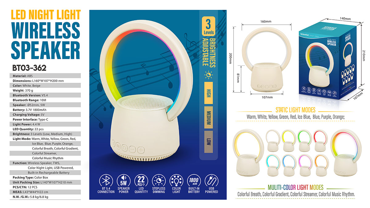 - Function : Wireless Speaker, TWS, Color Night Light, USB Powered, Built-in Rechargeable Battery