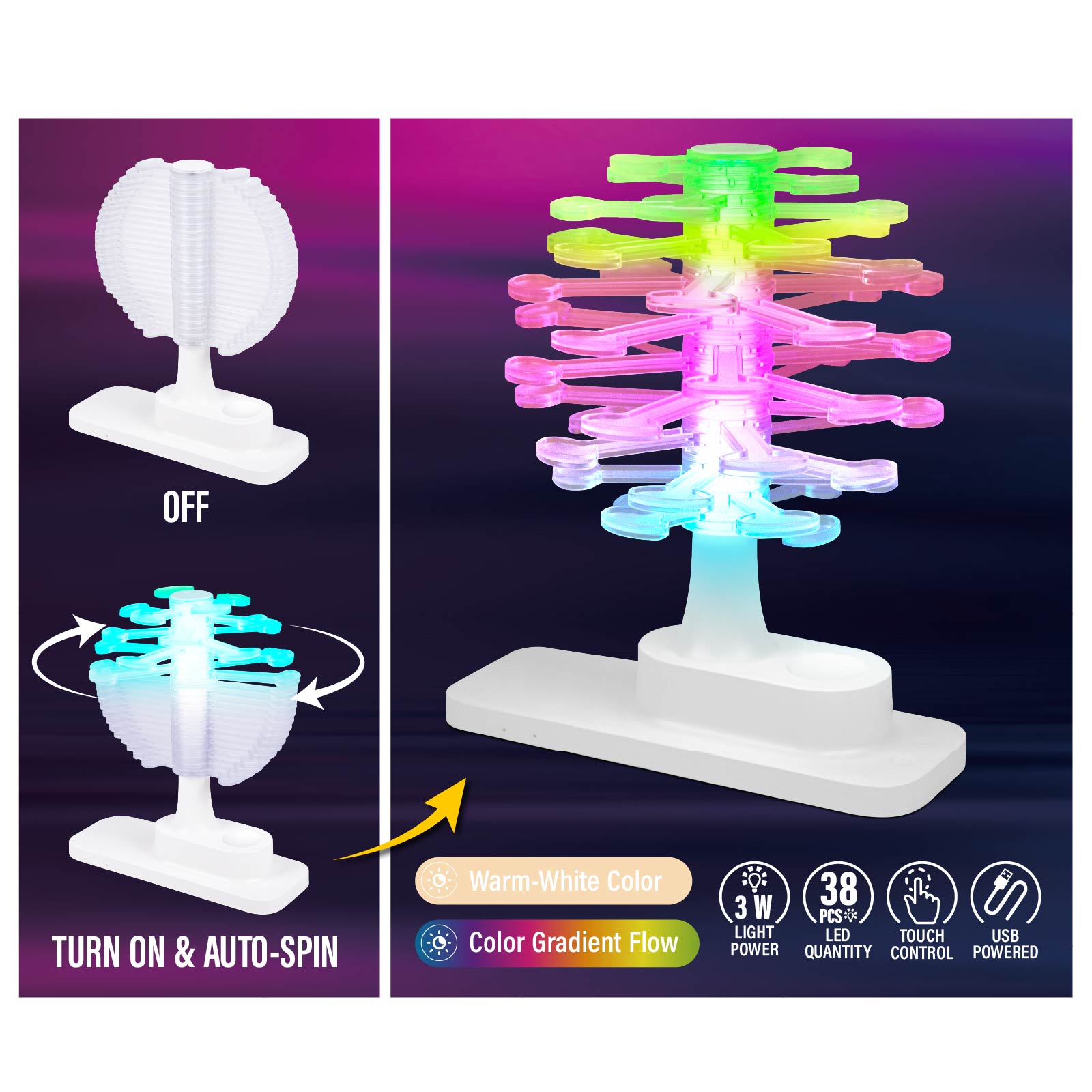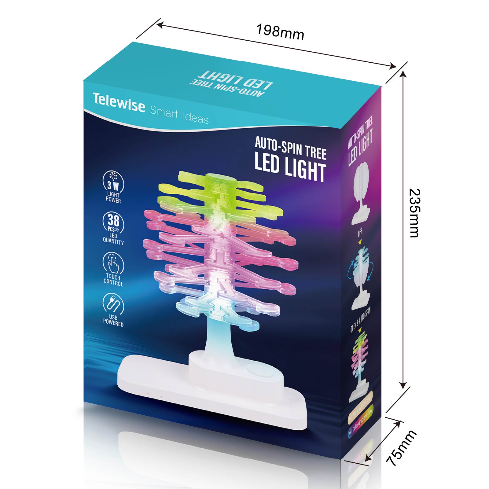 LG03-337Function: Auto-spin Tree, Night Light, Touch Control, USB Powered