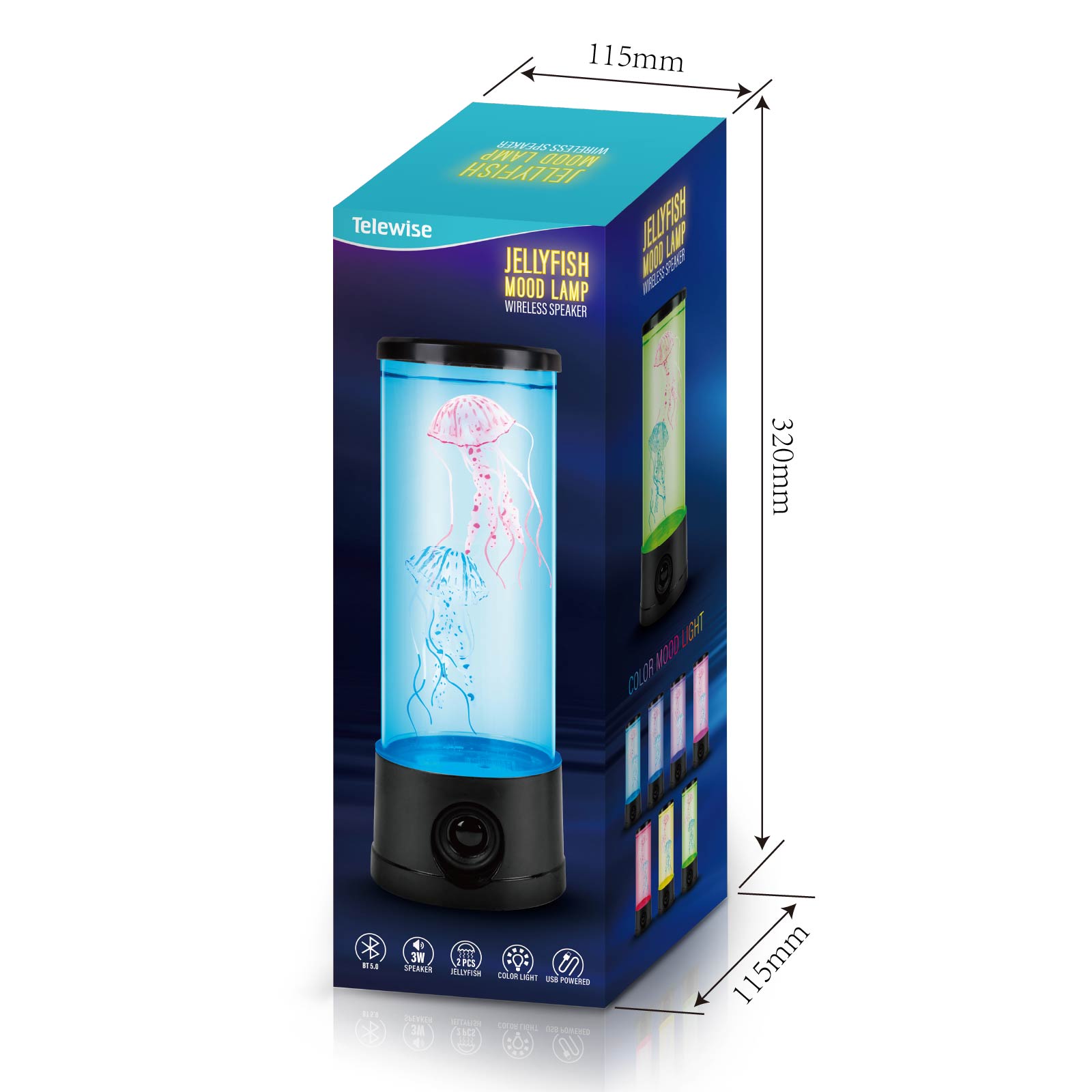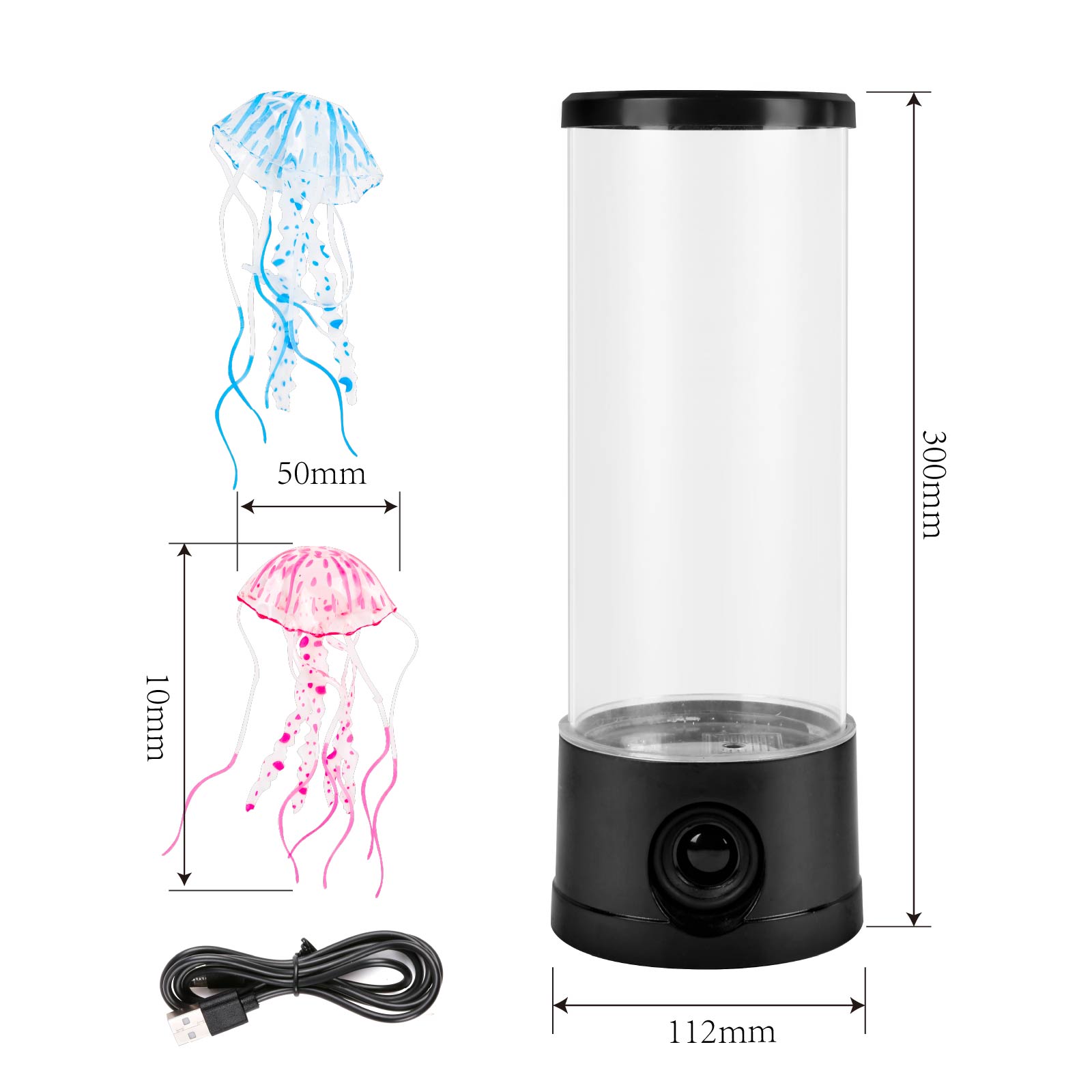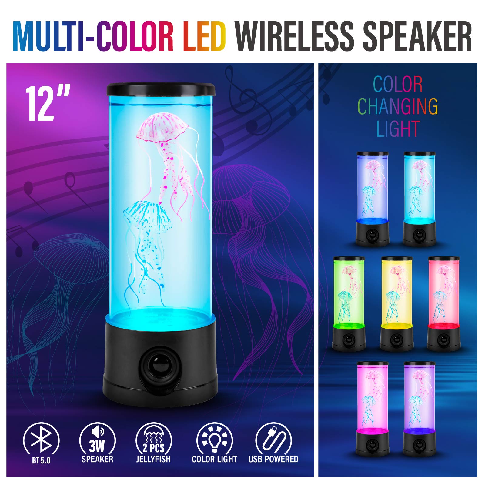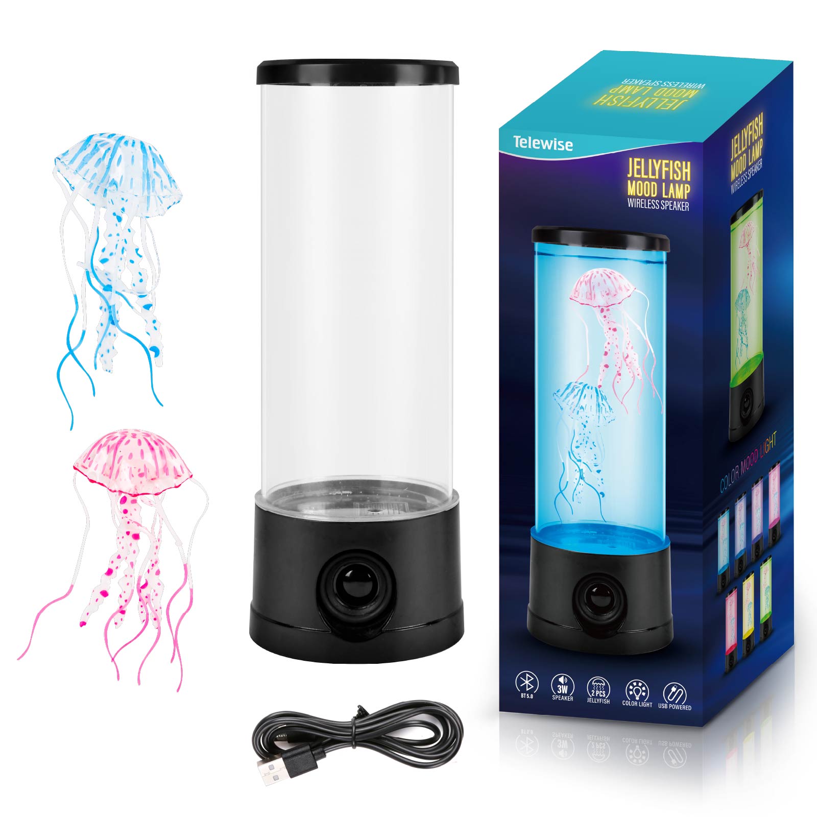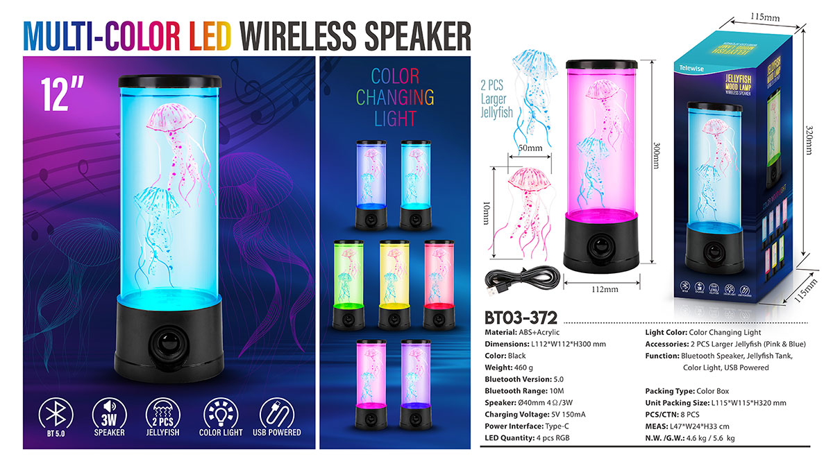 - Function : Bluetooth Speaker, Jellyfish Tank, Color Light, USB Powered