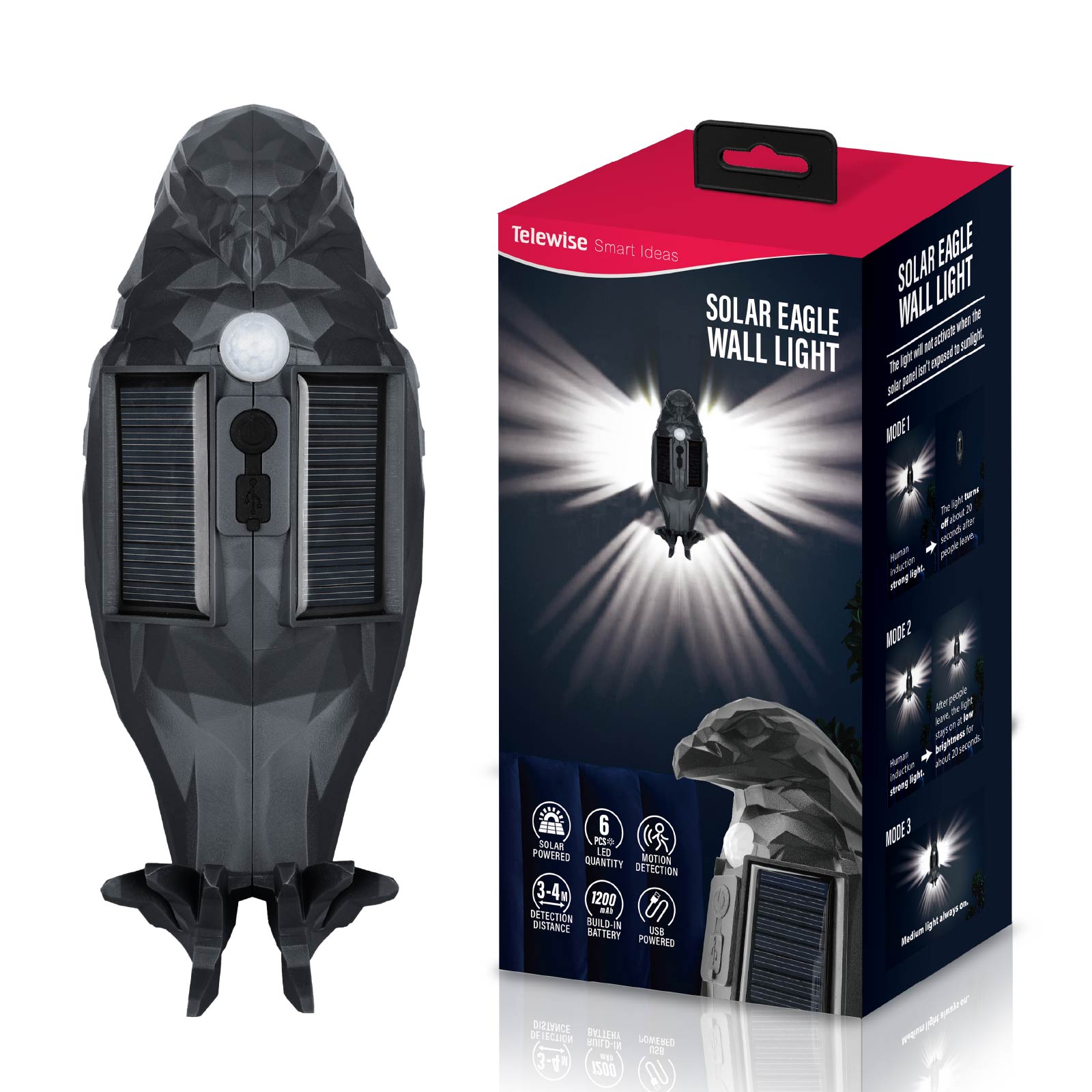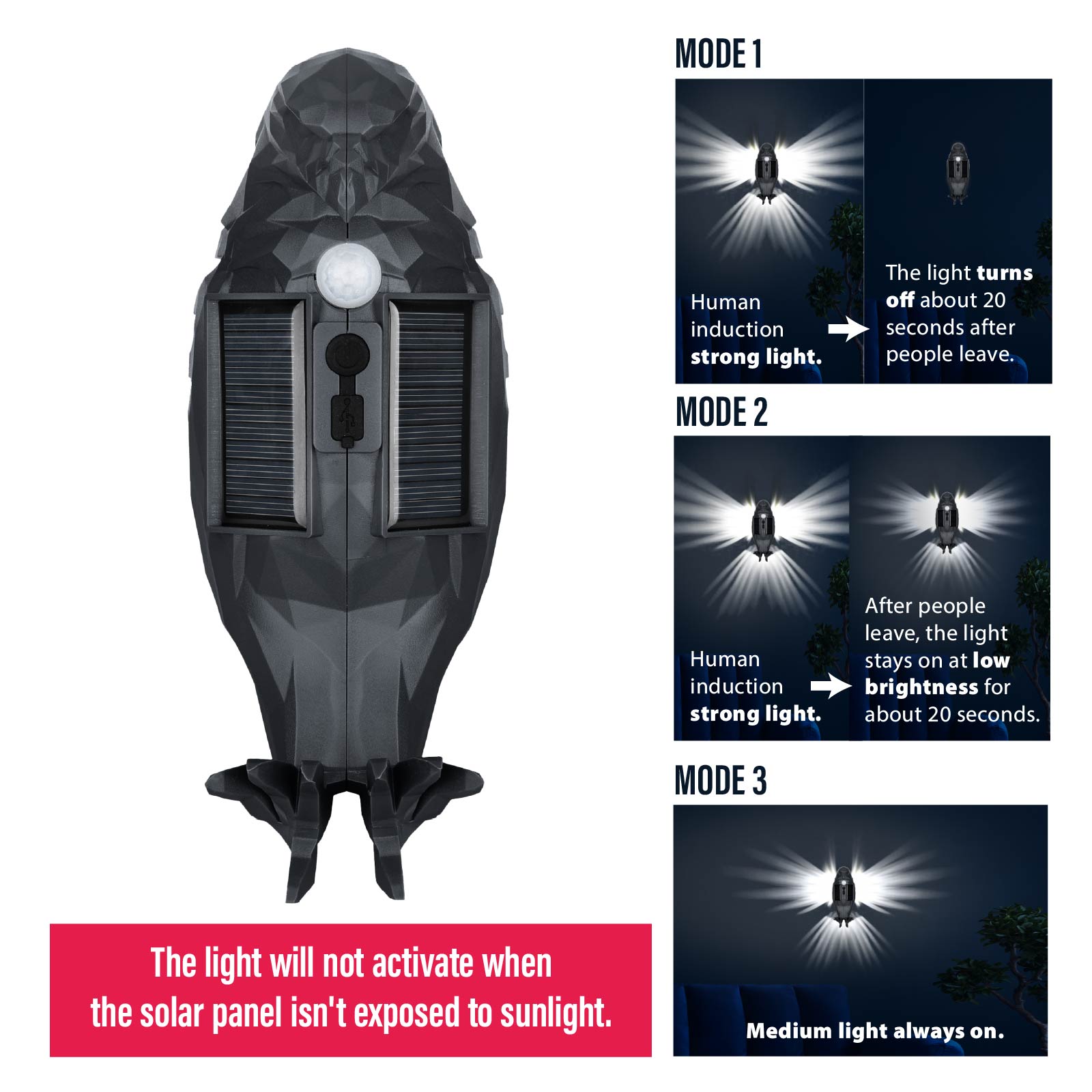 - Function : Deco Light, Motion Sensor, USB Powered, Solar Powered.